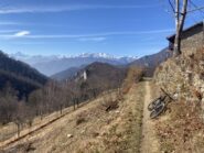 Si prosegue in piano sulla sinistra lungo una bella sterrata oppure diritto in forte discesa lungo un dissestato sentiero pietroso che qualche centinaia di metri più sotto si ricongiunge comunque alla sterrata. Attraversato un rivo (spesso secco), con un breve traverso pianeggiant, si raggiunge la panoramica Borgata Carla (18 km). Aggirate a valle le case ci si porta sull’ampia strada (prima sterrata poi asfaltata) che conduce alla borgata Serre Moretto e di qui in breve alla Borgata Rocceria (21 km).