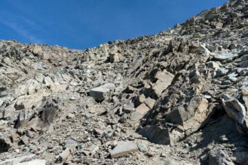 Nella parte alta sfasciume poco coeso, attenzione a non lapidare chi si trova più in basso e a non essere lapidati da chi si trova più in alto.