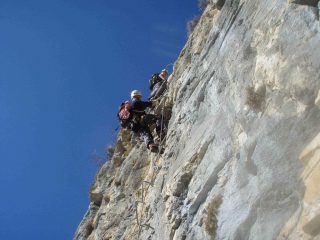Ferrata molto impegnativa con tratti strapiombanti. In caso di persone non molto allenate consiglio recupero con la corda dall’alto per evitargli di doversi assicurare.