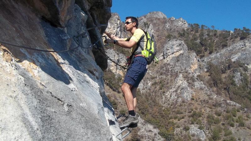 Arrivati in auto a Camoglieres mi accorgo di aver dimenticato a casa l’imbragatura! Per fortuna con un cordino da 4 mt in kevlar e un paio di fettucce riesco a farmi una perfetta imbragatura, molto ‘light’ ma anche molto resistente! Ferrata con passaggi esposti ed atletici, ma sempre ben gradinati e manigliati; giretto pomeridiano al caldo di questo sole primaverile…..