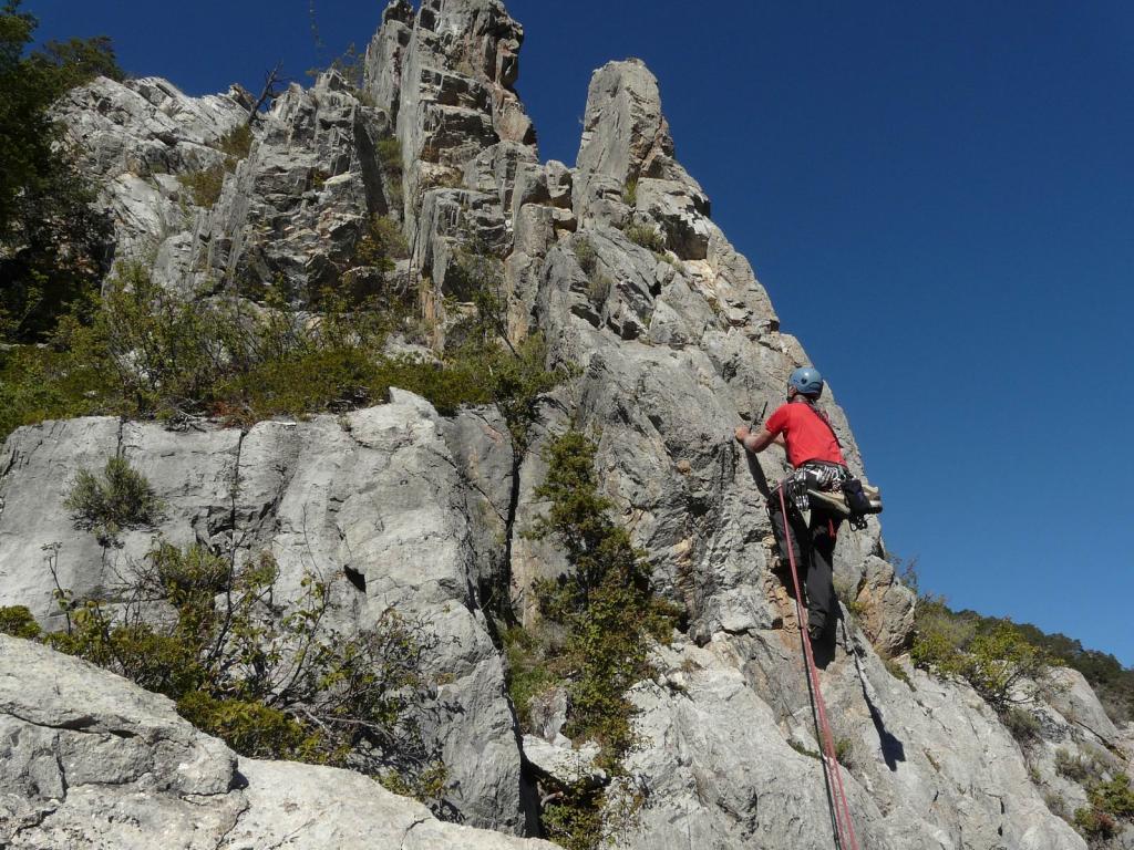 attenzione a metà del secondo tiro, volgere a dx e scendere un paio di m., passare tra un roccione e la parete, scendere ancore leggermente attraversando lungamente sino alla base di un altro sperone sulla dx.ove riprende la salita; molto bello il quinto tiro; roccia buona, un po’ di brecciolino nell’ultimo tiro;
