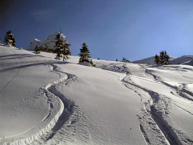 Riprendere la direzione NE puntando al colle a destra della cima, pendio SW fino alla barra rocciosa dove si lasciano gli sci.