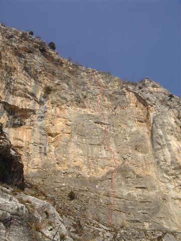 - 1) Il primo tiro originale prevede il superamento di un ostico tettuccio ( 6b+), ma può essere sostituito più facilmente e logicamente con una facile lunghezza che parte qualche metro più a sinistra ( 30 m, 5a, 5b)