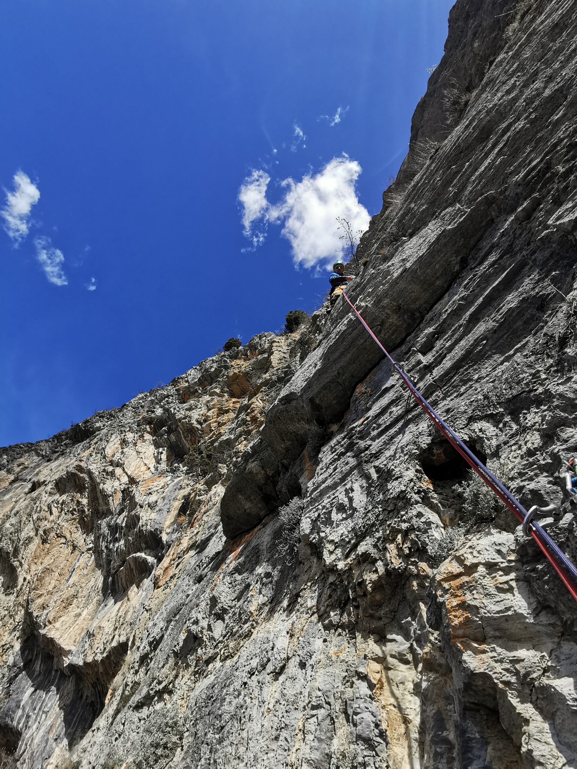 - 4) Lungo tiro di resistenza, con una successione di muri e strapiombi, bellissimo e vertiginoso. ( 35 m 6b-6b+)