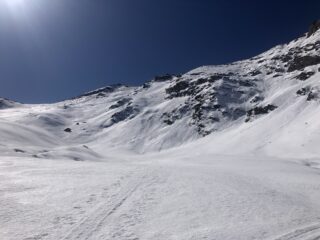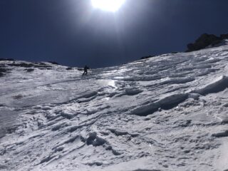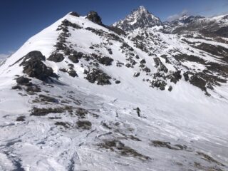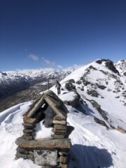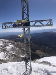 Si spalla per 100mt di dislivello. Ma tra poco sarà molto di più. Si devono poi togliere gli sci per 100mt lineari sulla strada. Poi ok fino al pendio finale martoriato dal forte vento, con placche, che ci sono sembrate stabili, e sastrugi notevoli. Traccia abbastanza ghiacciata. Utili i coltelli. Pochi metri senza problemi dal colle alla cima per cresta agevole. Raffiche violente di vento per fortuna non frequenti. Discesa di sopravvivenza in alto e in basso, ok su crosta portante nella parte centrale. Si mangia propri bene a Le Bianche Bigoire. Con Enri.