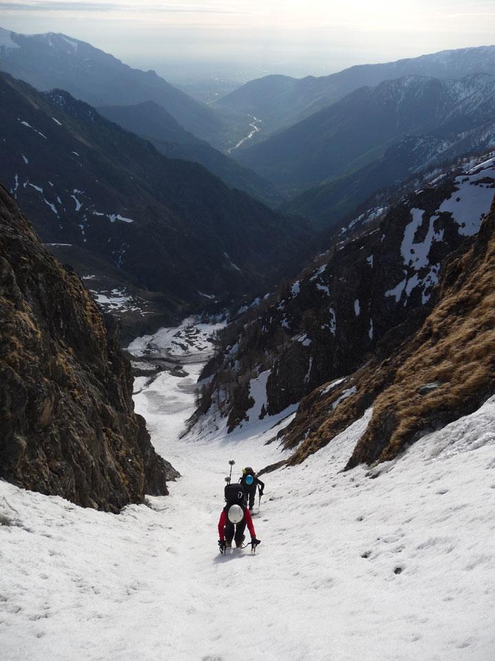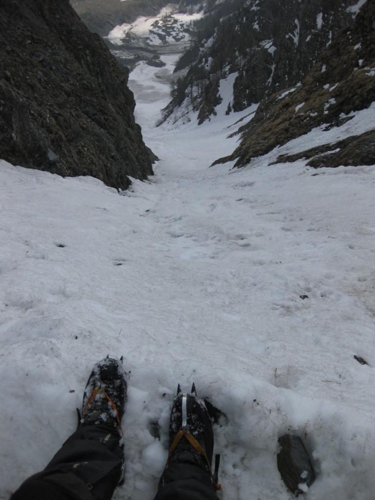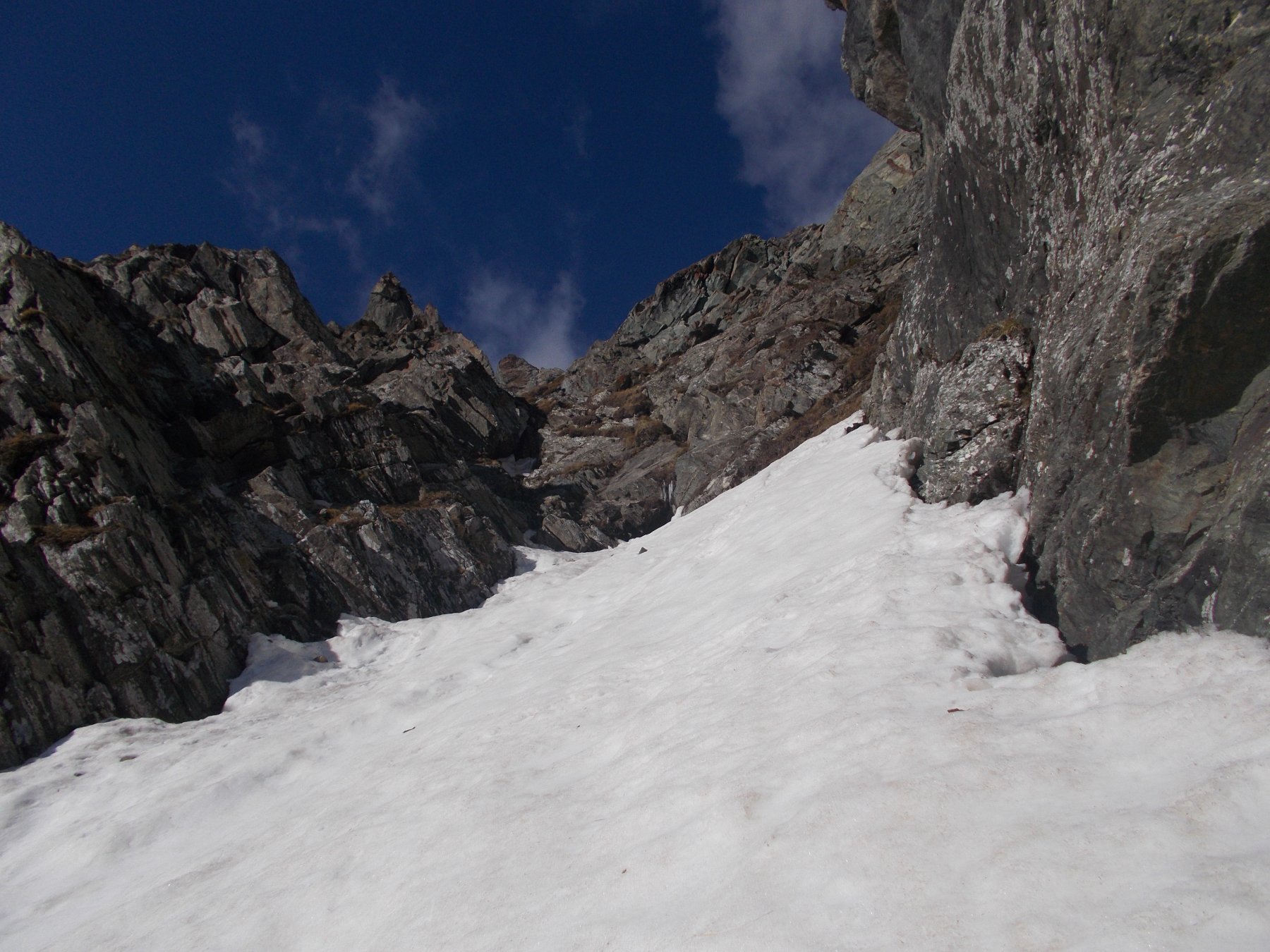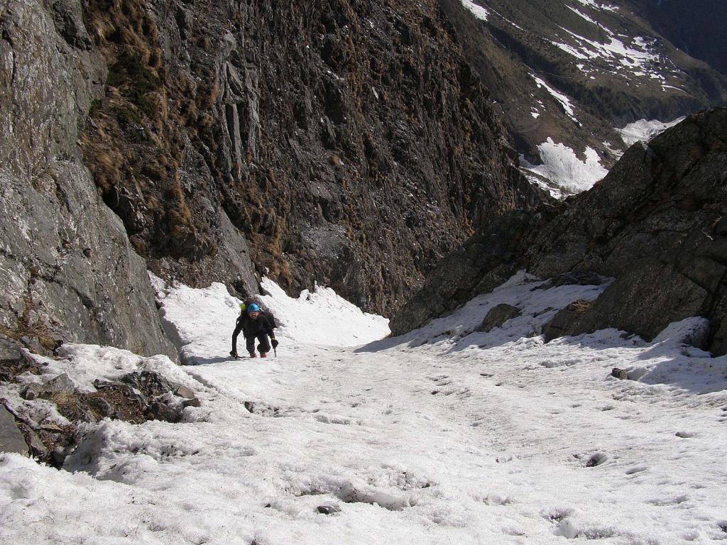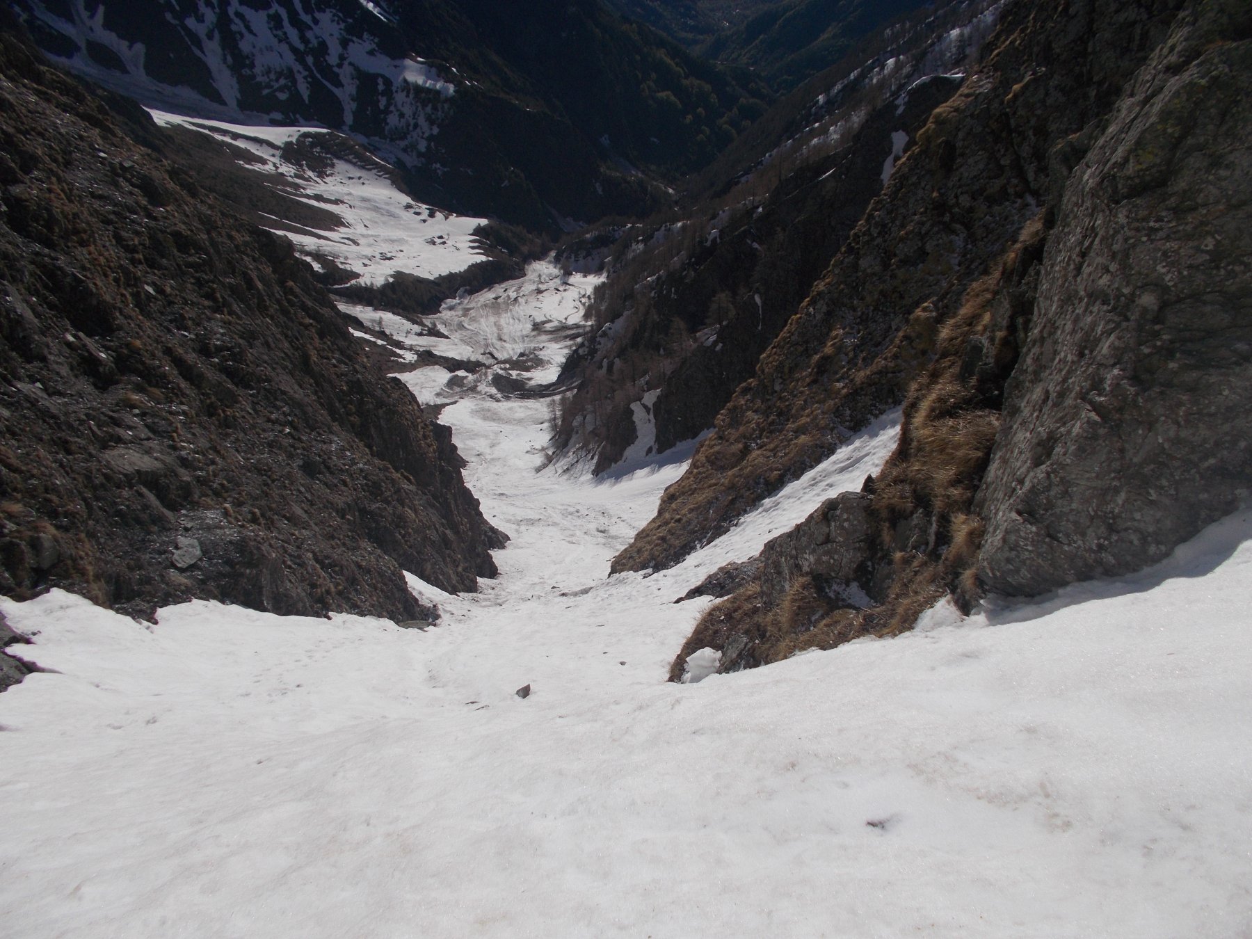 poco prima del punto in cui il canale piega a sx, un breve canale laterale in neve/ghiaccio sulla sx permette di raggiungere i pendii erbosi o nevosi poco a sx dell’uscita. Con breve traverso a dx si raggiungono i piani di Crosennetta.