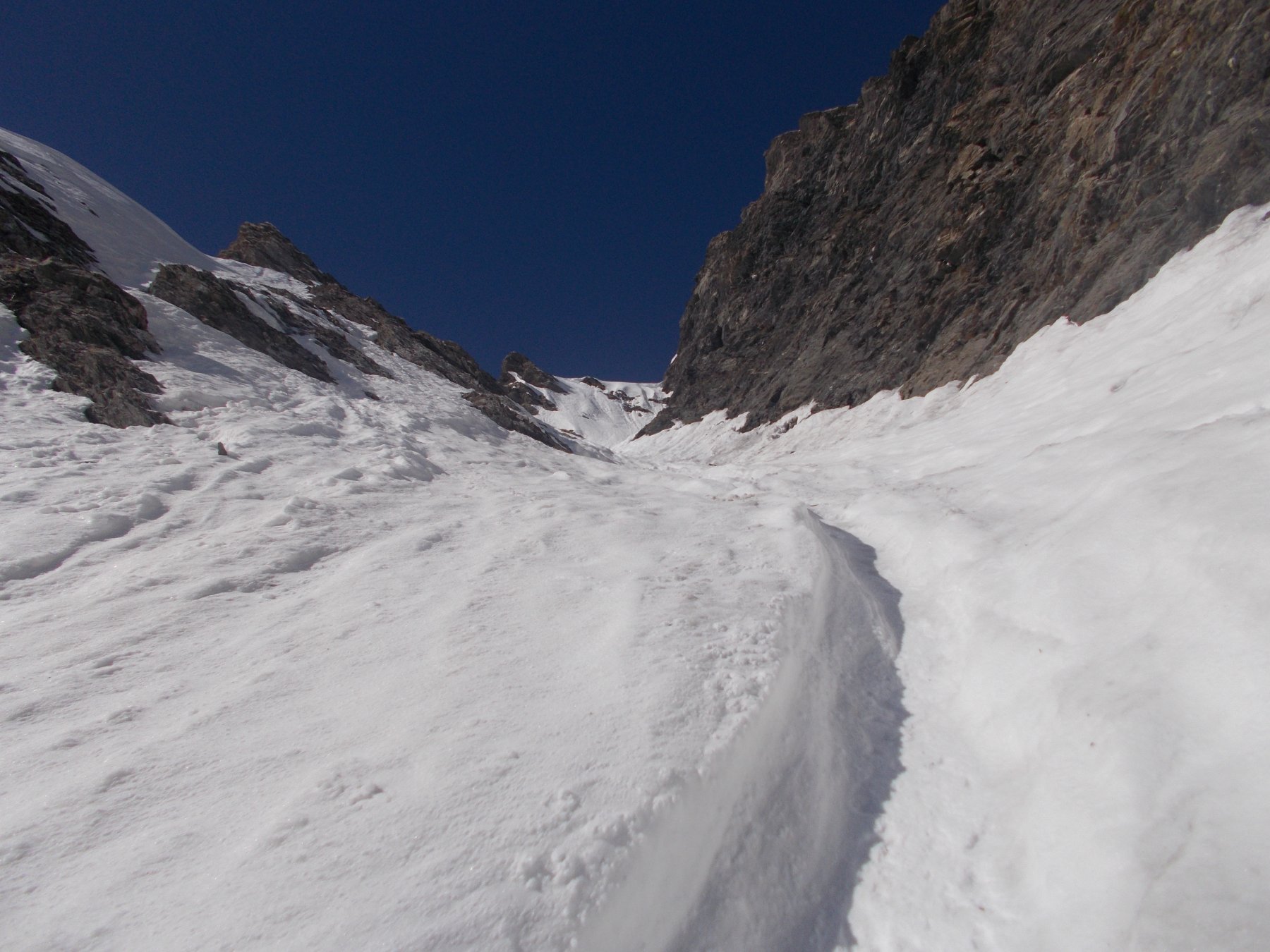 Dal divieto di transito lungo la pista Villanova-Rif. Jervis si prosegue sulla pista, quindi si imbocca sulla dx il sentiero per l’alpe Crosenna. Raggiunto l’alpeggio, si punta all’evidente vallone/canalone seguendo il sentiero balcone per il rif. Jervis. Si risale il canalone con moderata pendenza per lungo tratto, solo gli ultimi 200 m sono decisamente più ripidi e possono superare in alcuni tratti i 50 gradi a seconda del grado di innevamento. Ormai quasi al termine, il canale piega a sx e salvo eccezionale innevamento l’ultimo tratto è costituito da lastroni di roccia bagnata o ricoperta di ghiaccio e zolle erbose. Puntando appena possibile a dx si esce nei pendii della sponda meridionale della conca di Crosennetta.