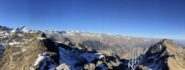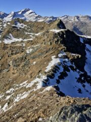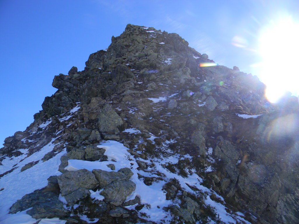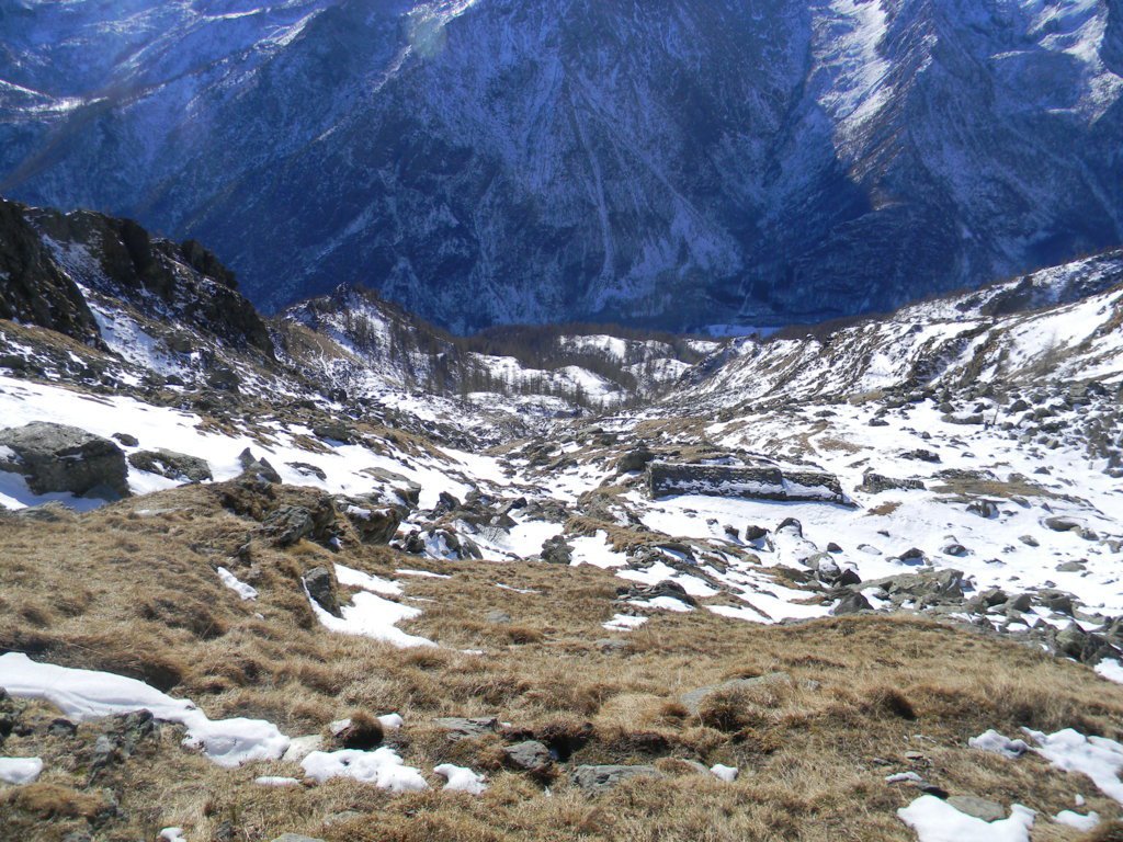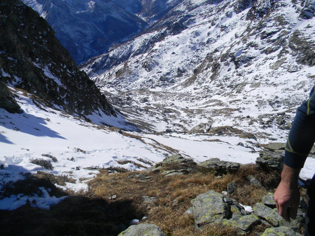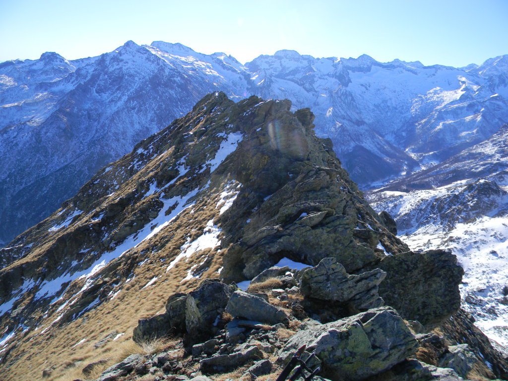 Dalla vetta si scende per aerea cresta verso est (attenzione ai saltoni verso Nord) e poi giunti ad uno sperone roccioso, all’avventura giù per ripidissimi prati di insidiosa erba olina verso Pian Sarpeis tenendo sempre la prossimità dell’impluvio sino ad incrociare dopo un po’ di tribolazioni le tacche bianco/rosse che riportano alla civiltà. Ovviamente si può tornare dalla via di salita.