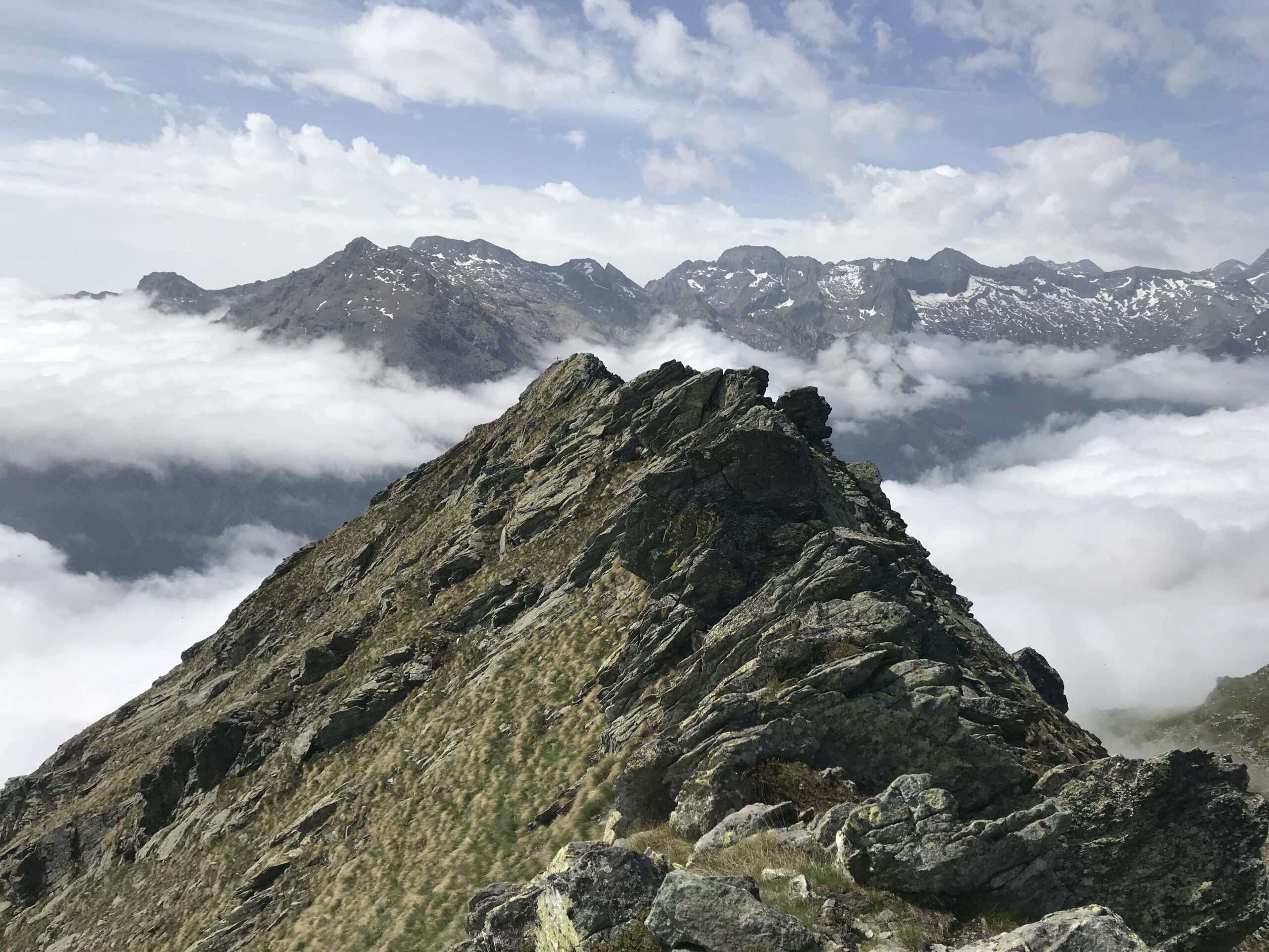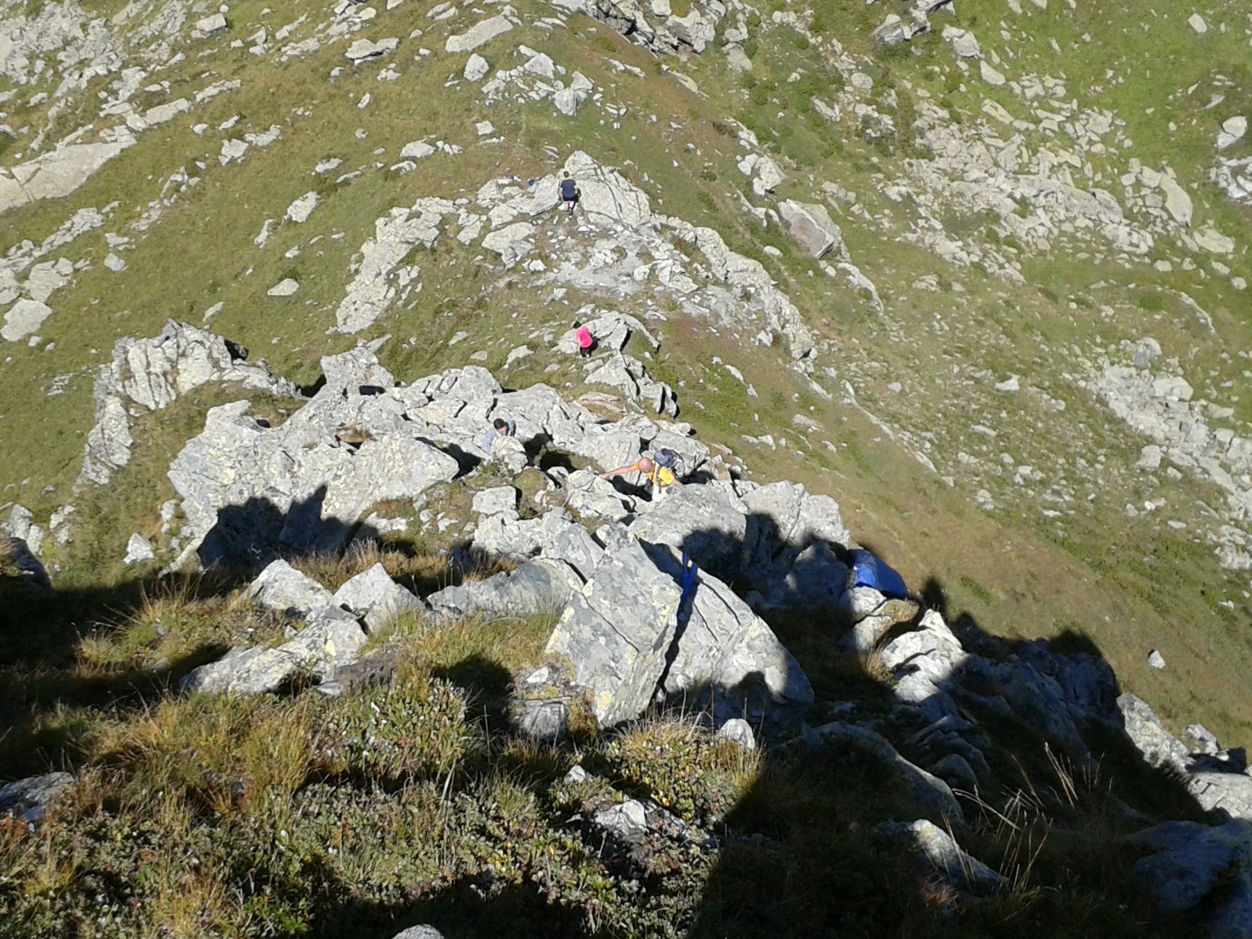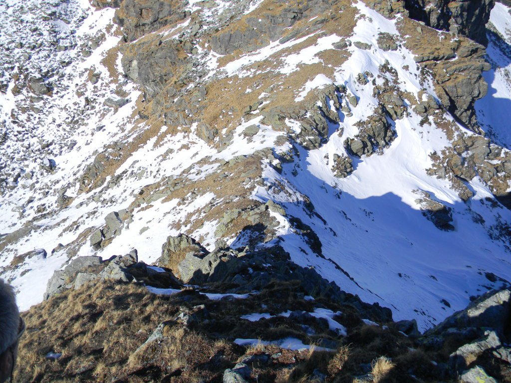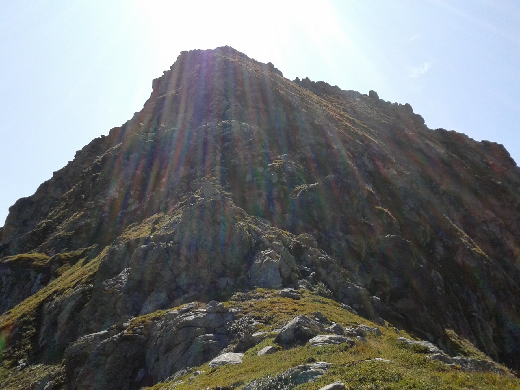 Dalla vetta si scende per aerea cresta verso est (attenzione ai saltoni verso Nord) e poi giunti ad uno sperone roccioso, all’avventura giù per ripidissimi prati di insidiosa erba olina verso Pian Sarpeis tenendo sempre la prossimità dell’impluvio sino ad incrociare dopo un po’ di tribolazioni le tacche bianco/rosse che riportano alla civiltà. Ovviamente si può tornare dalla via di salita.