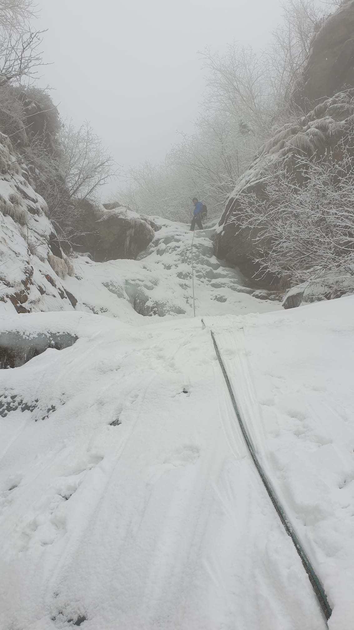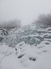 Essendo appoggiata la cascata era coperta dalla neve, quindi lavoro di pulizia, strato superficiale con crosta e ghiaccio spaccoso.
