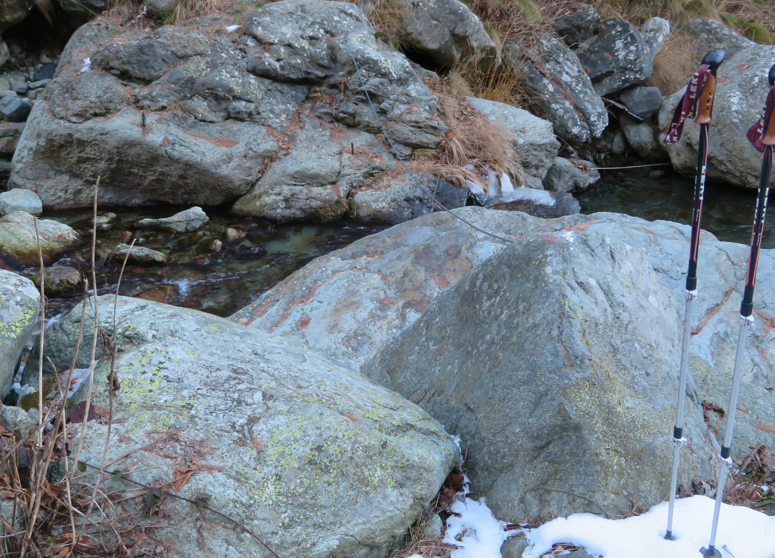 Sentiero sporco per erba e rovi che ne precludono in parte la vista, se ci aggiungiamo le foglie e a tratti il ghiaccio…. nessun problema al secondo guado, si attraversa bene con un minimo di attenzione, più evidente il sentiero fuori dal bosco, nonostante la presenza di qualche centimetro di neve verso il colle.