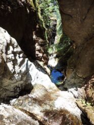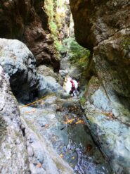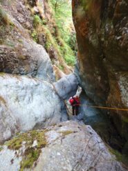 Sulla sinistra si vede il baratro della forra e si esce per un tratto dal bosco (prato), per poi rientrarci; salire ancora fino a trovarsi in un bosco più ampio leggermente meno pendente, qui tagliare a sinistra. Sul bordo della forra si trova un gruppo di alberi con un masso vicino: è l'unico punto in cui si può scendere all'interno per 10 metri senza corda, poi si trova un gruppo di alberi da cui ci si cala per 15 m e si entra nel torrente. Tot. 25 min.