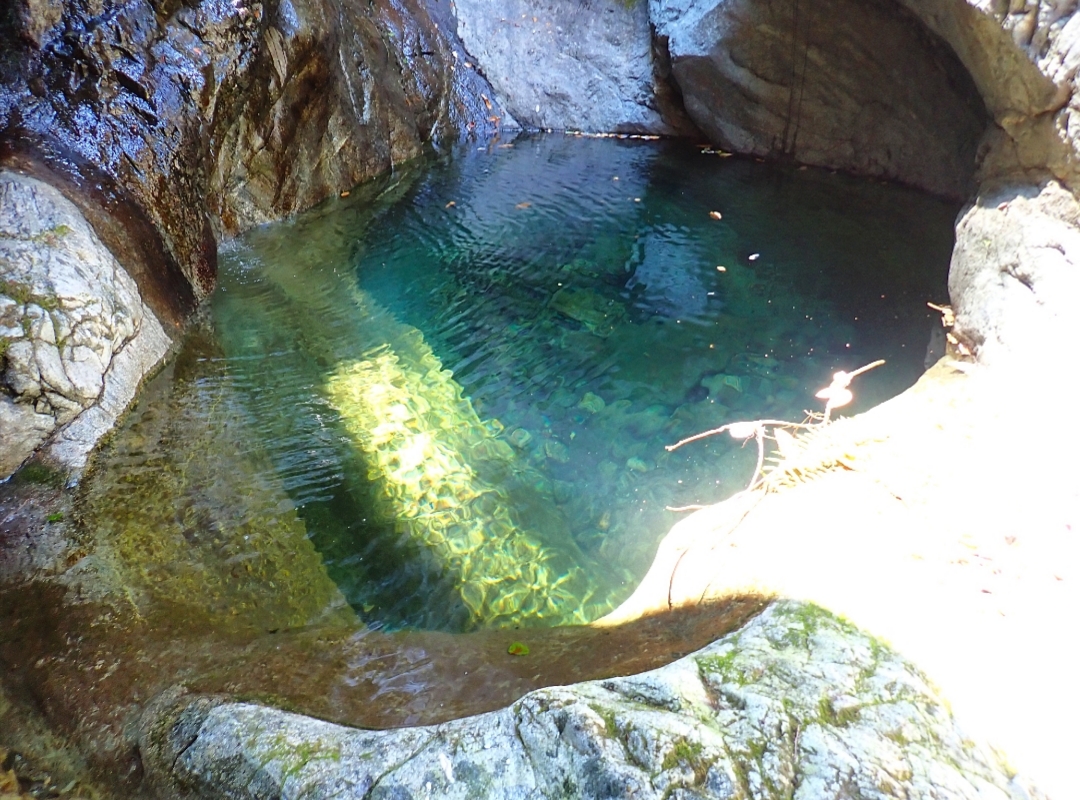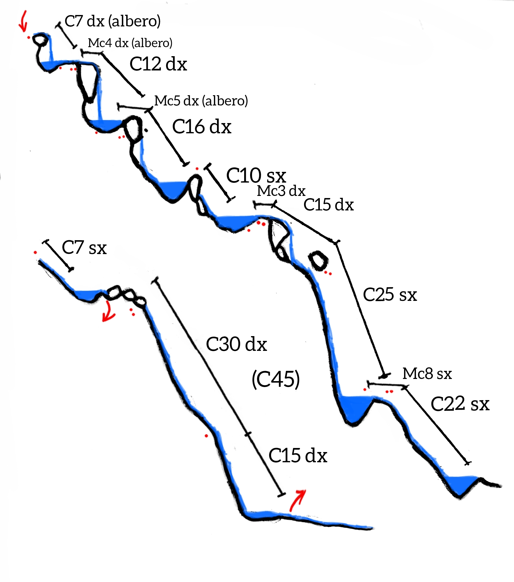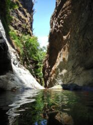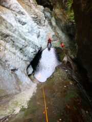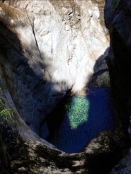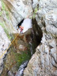 Si arriva all’ultima cascata da 45 m, fattibile in una calata sola o frazionata in C30dx+C15dx (punto singolo), dopo questa si esce sulla sinistra per ricongiungersi al sentiero dell’avvicinamento, in 5 min. si torna alla macchina.