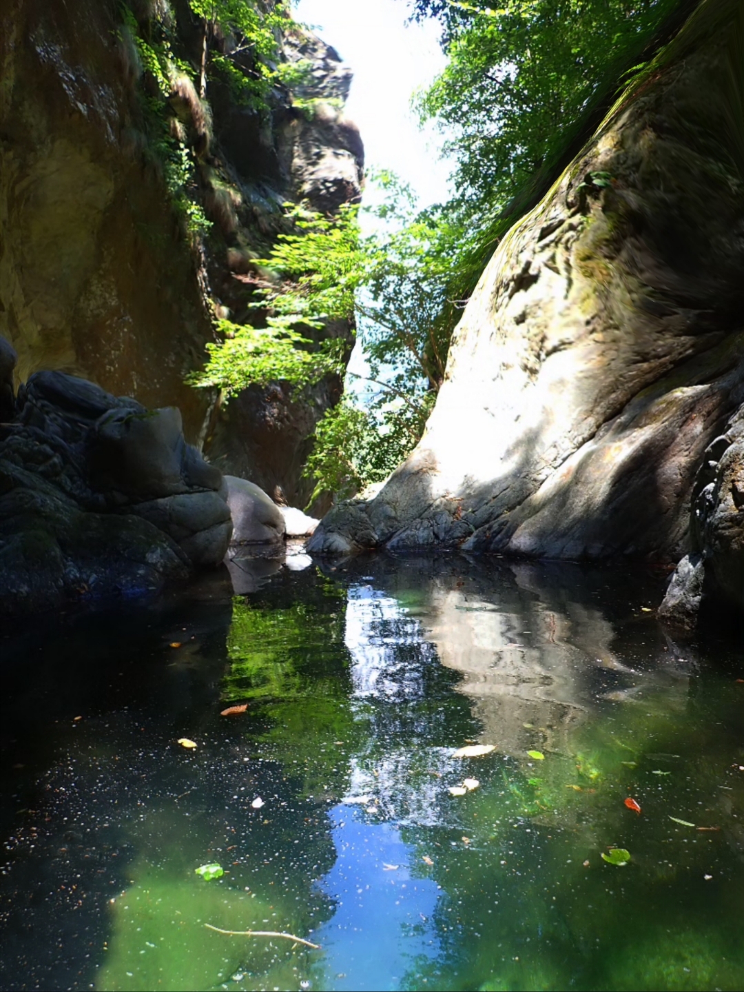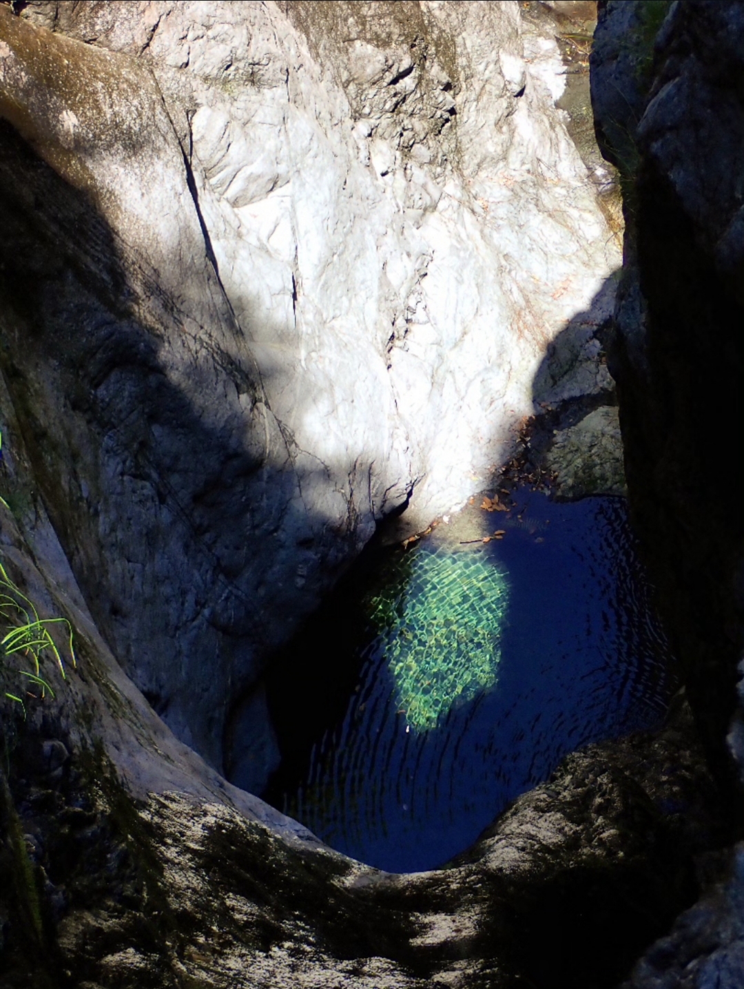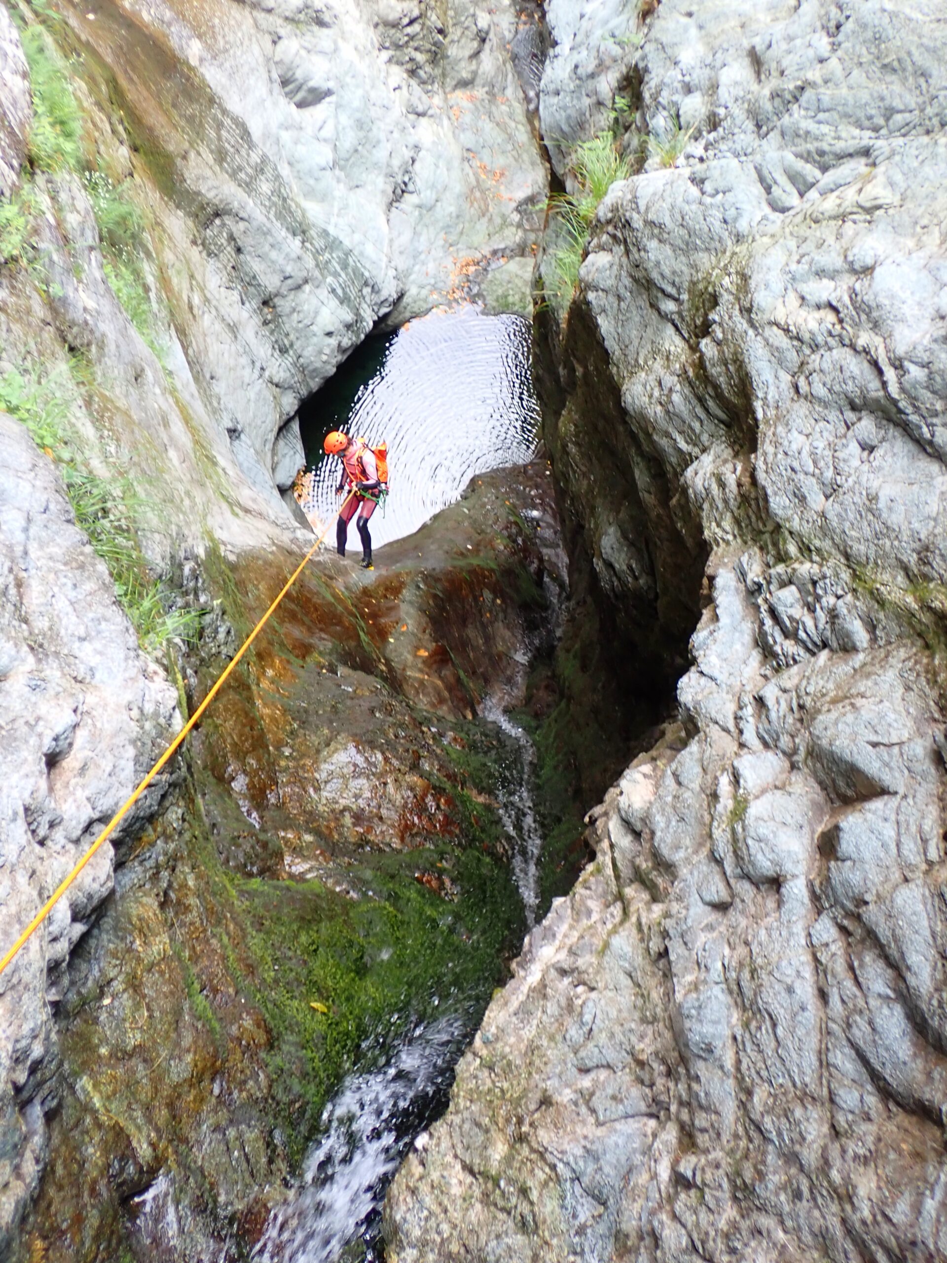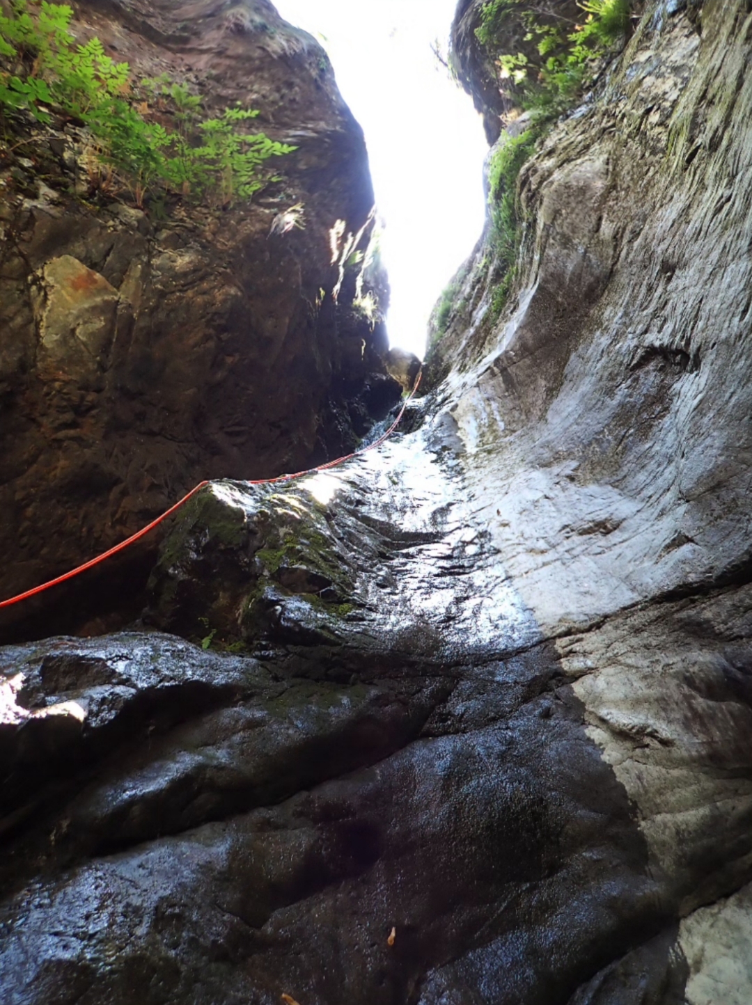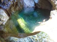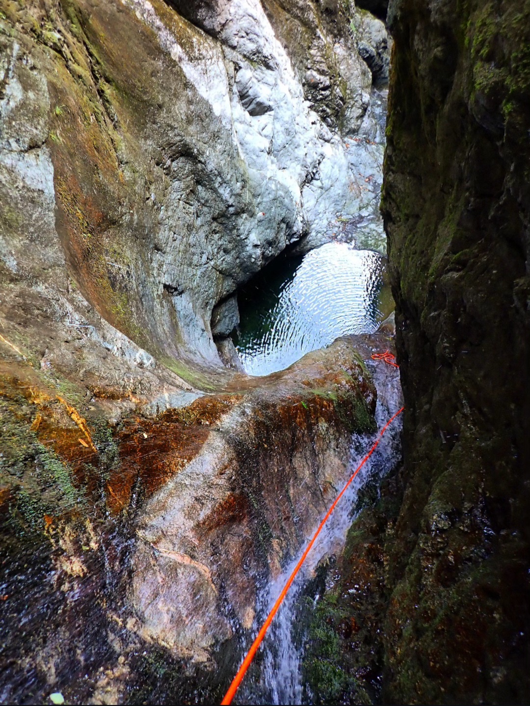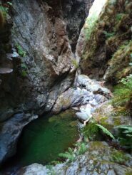 L'unica via di fuga si trova sulla destra prima dell'ultima grande cascata; evidente con pioli e tubi di una presa d'acqua, per il resto impossibile sforrare o ripararsi da eventuale piena.