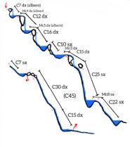 Si trova un passaggio interessante con il caratteristico “masso sospeso”; C15dx+C25sx (sosta dietro al masso)