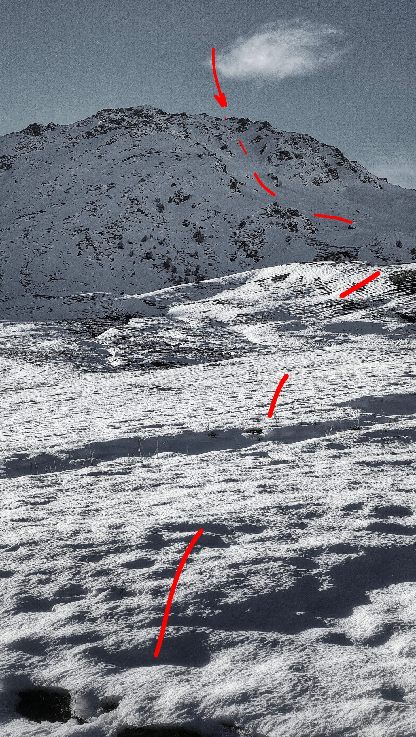Poco prima di raggiungere il rifugio Letey si devia alla propria sinistra in direzione della parete. A 2/3 del pendio la pendenza aumenta e due grossi massi delimitano una sorta di strettoia che da accesso alla parte superiore. Raggiunta la cresta si volge brevemente a sinistra per toccare il cairn di vetta.
