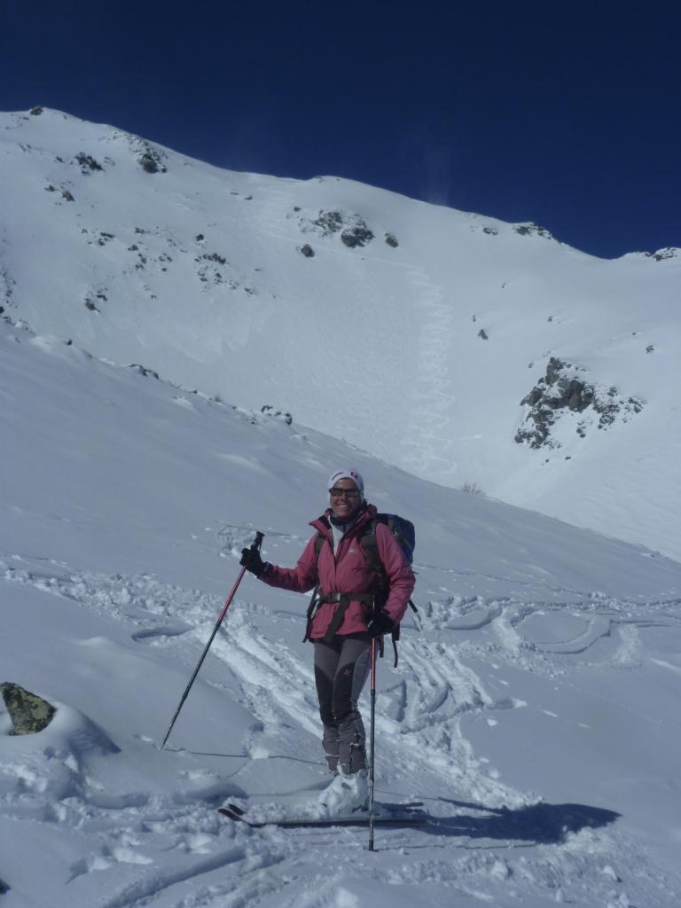 Bella giornata nemmeno tanto fredda. Si parte al tornante appena sopra Chatelair verso le 8 e mezza con il sole che spunta. Pochissima neve nei prati alla partenza mentre appena sopra ce n’è ancora quanto basta ma le vecchie tracce di salita sono quasi sparite sotto la (poca) neve dei giorni scorsi. Prima parte di salita nel bosco poi, usciti sul pianoro superiore, su bei pendii aperti. Anche se l’itinerario è tutto esposto al sole, il freddo di questi giorni ha lasciato una bella polvere su tutto il percorso e per quasi tutta la salita non si è sentito un filo di vento. Arrivo in vetta con un cielo terso e un panorama meraviglioso ma qui il vento si fa sentire con folate intermittenti anche piuttosto forti. Salita dal pianoro in vetta tenendosi sui pendii a sinistra salendo, mentre per la discesa abbiamo optato per il pendio sull’altro lato esposto a sud. Bella discesa su polvere un po’ pesante in alto facendo attenzione in qualche punto alle pietre e bella farina nel bosco. Fuori dal bosco nella parte bassa pendii aperti tuttora sciabili mentre nell’ultimo tratto, dove c’è poca neve, si può usare (ancora per poco) la strada e si arriva alla macchina sci ai piedi.