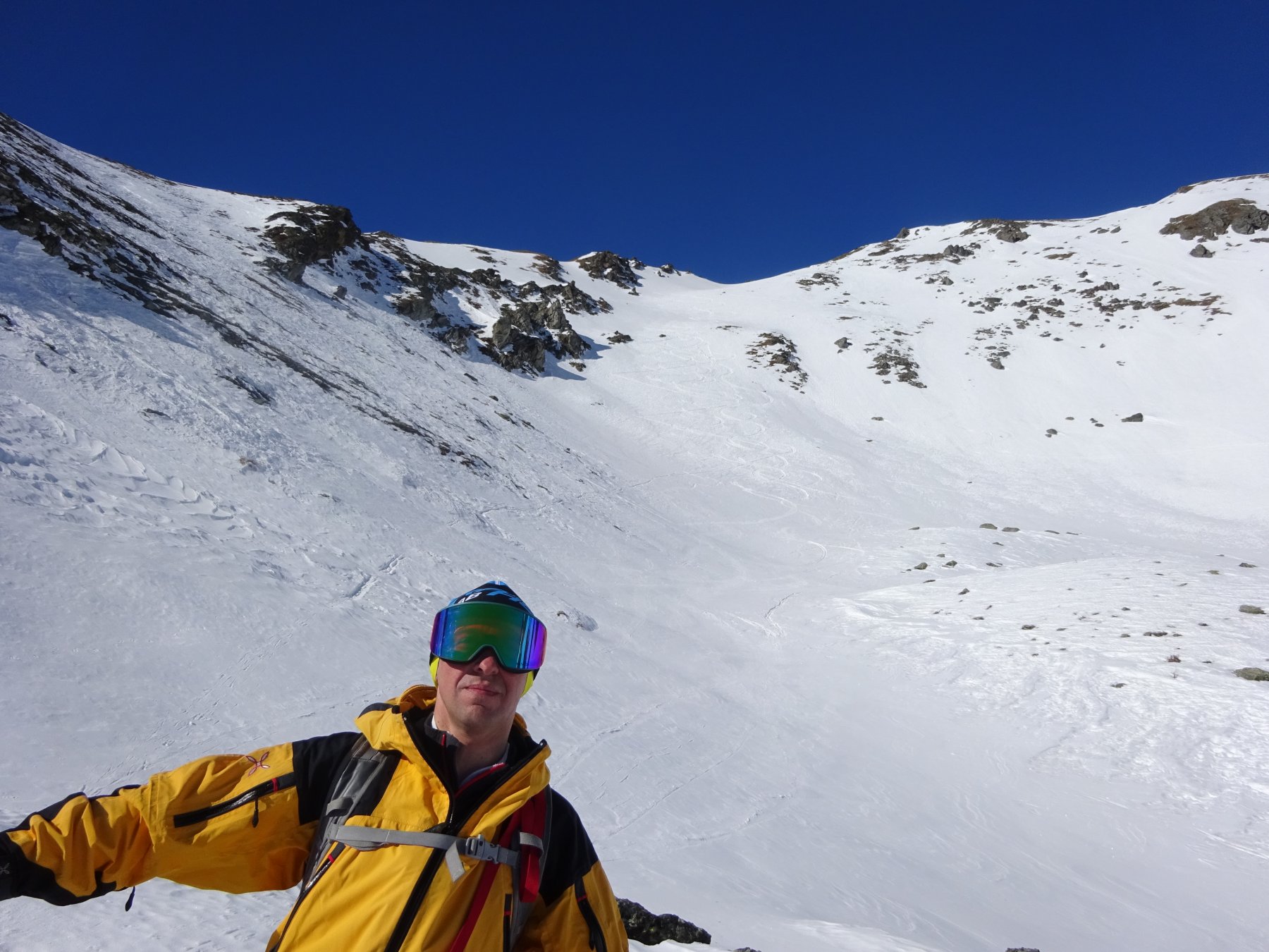 Primo pendio di discesa su neve abbondate ed umida in via di trasformazione, regala una sciata piacevole, a patto di buttare le punte a valle e tirare la curva con un pò di decisione. Breve tratto di trasferimento e poi ci aspettano i pendii più ripidi della gita, che troviamo in splendida neve trasformata: curve tirate su pendii sostenuti, inondati dal sole, su ottima neve trasformata, quindi grande goduria sci-aplinistica! Quindi tratto di trasferimento e discesa nel bosco fitto su neve umida e pesante, sempre alla ricerca di trovare i passaggi raccordati in neve: 400 metri di sciata mediocre e faticosa per rientrare alla partenza