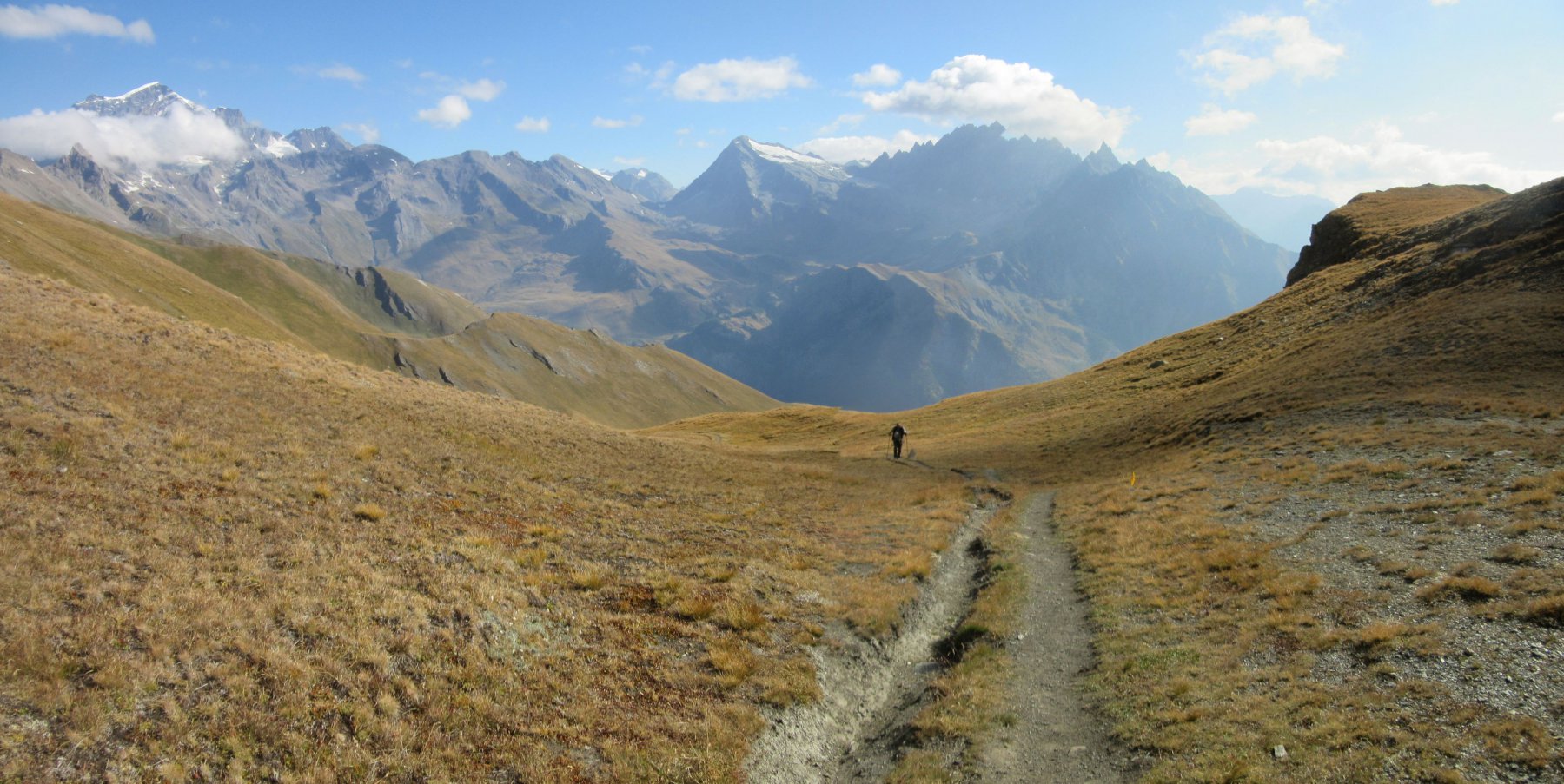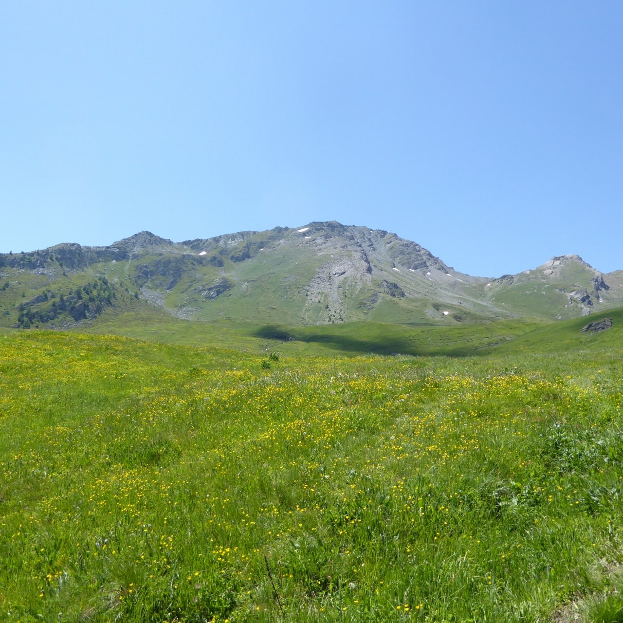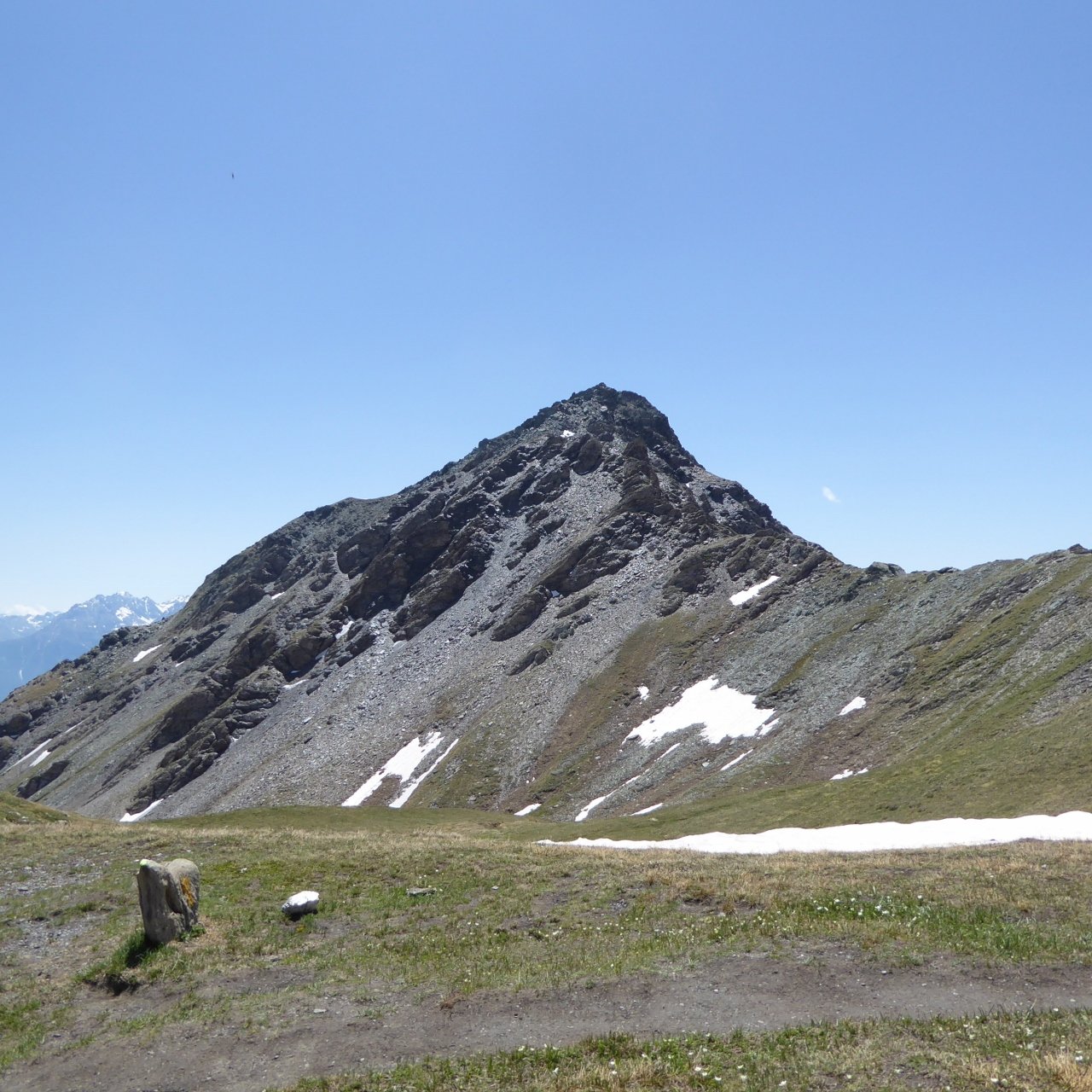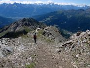 Si sale sul ripido sentiero terroso che a serpentine supera il costone erboso sopra il rifugio, poi terminata la parte più ripida raggiunge una piccola conca erbosa ormai in vista del Col Champillon 2709 m, grosso cippo di pietre.