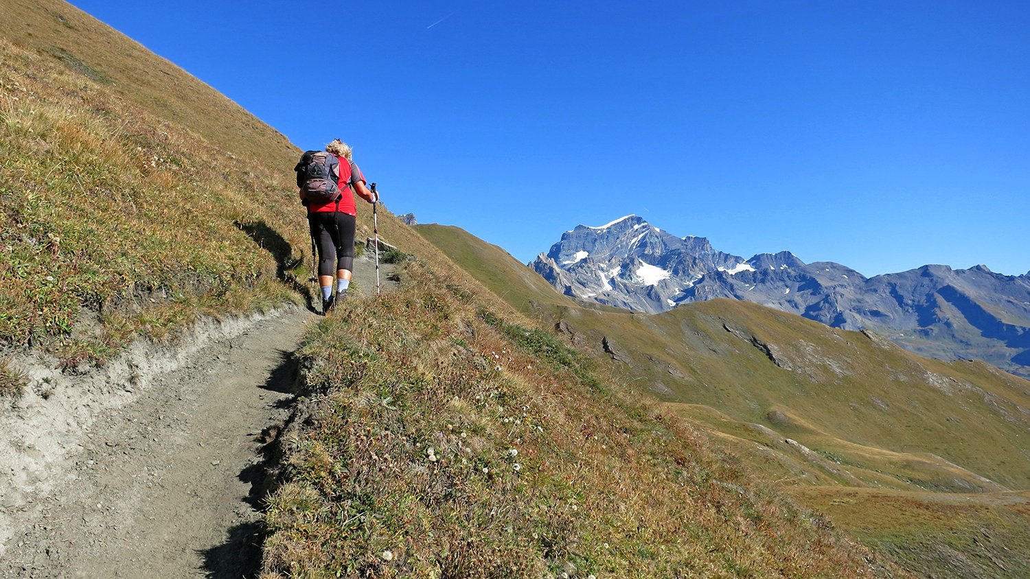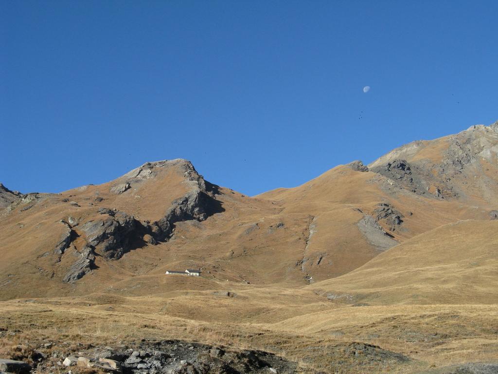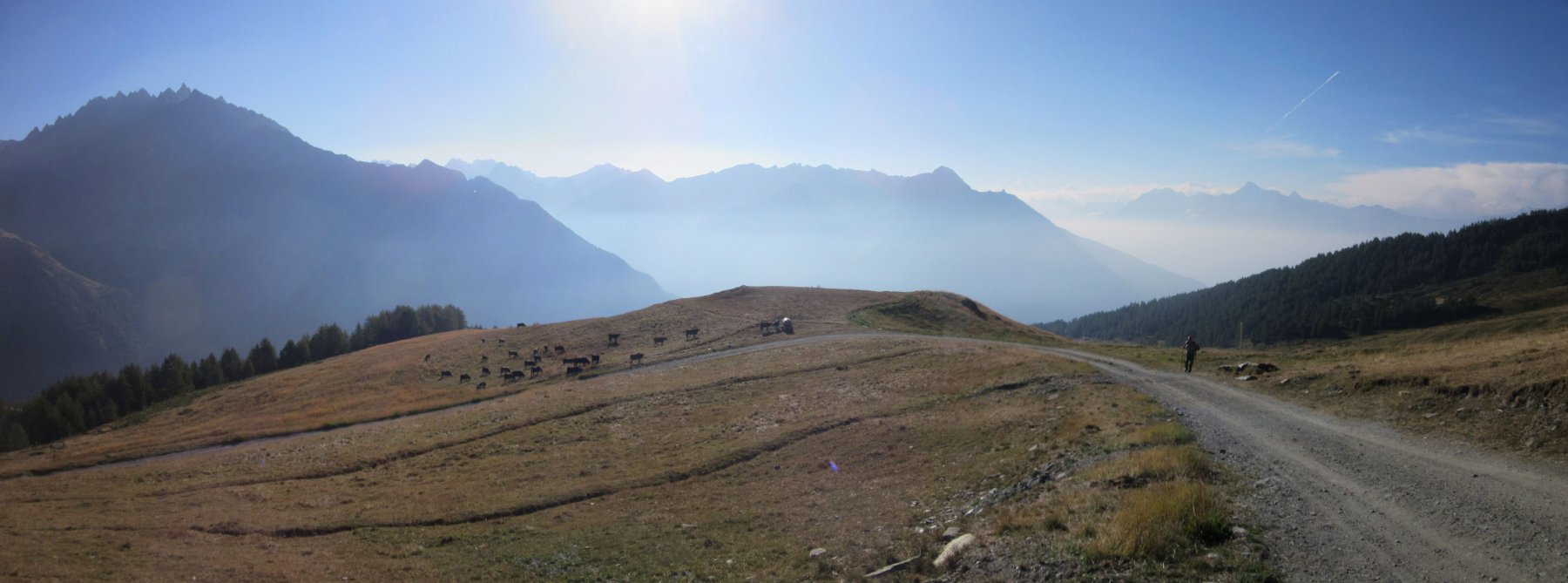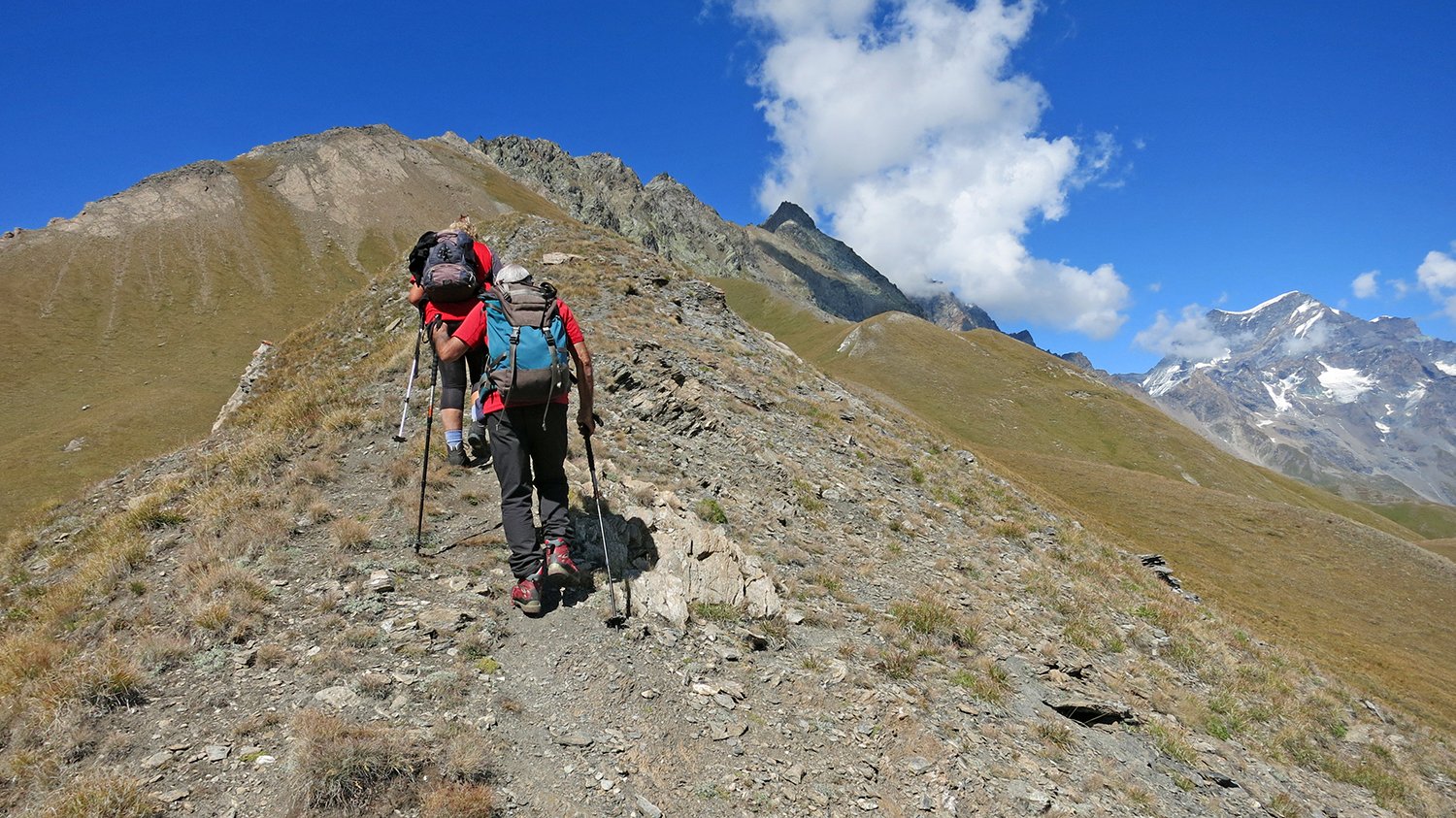 Si sale sul ripido sentiero terroso che a serpentine supera il costone erboso sopra il rifugio, poi terminata la parte più ripida raggiunge una piccola conca erbosa ormai in vista del Col Champillon 2709 m, grosso cippo di pietre.