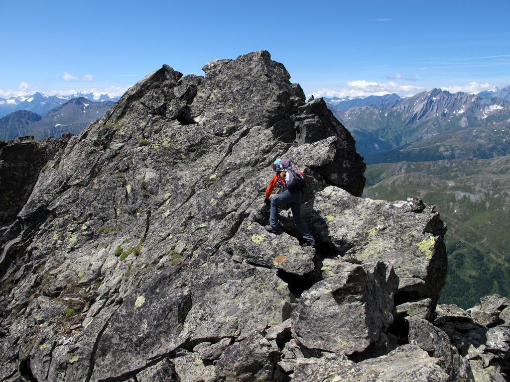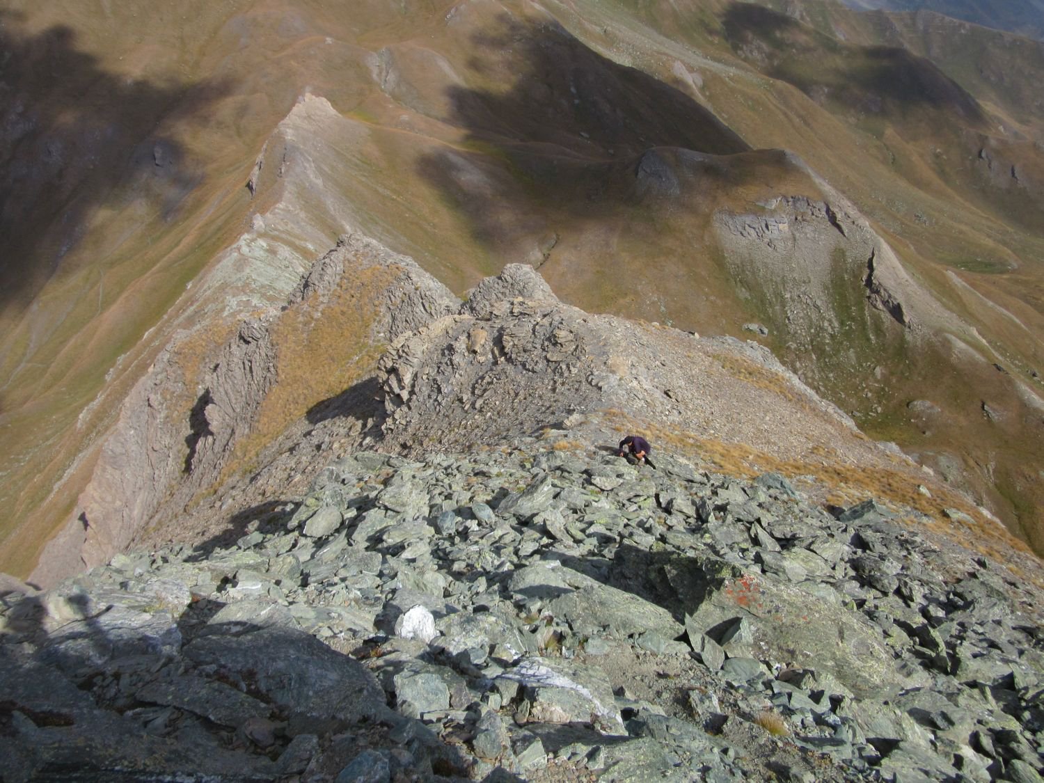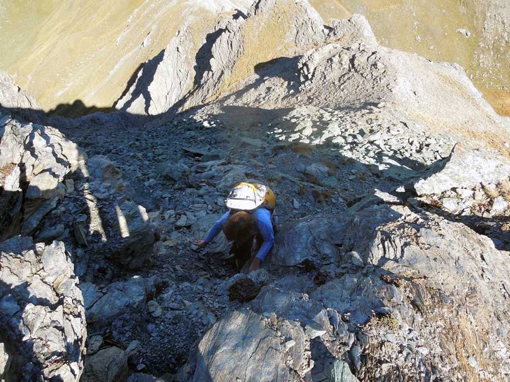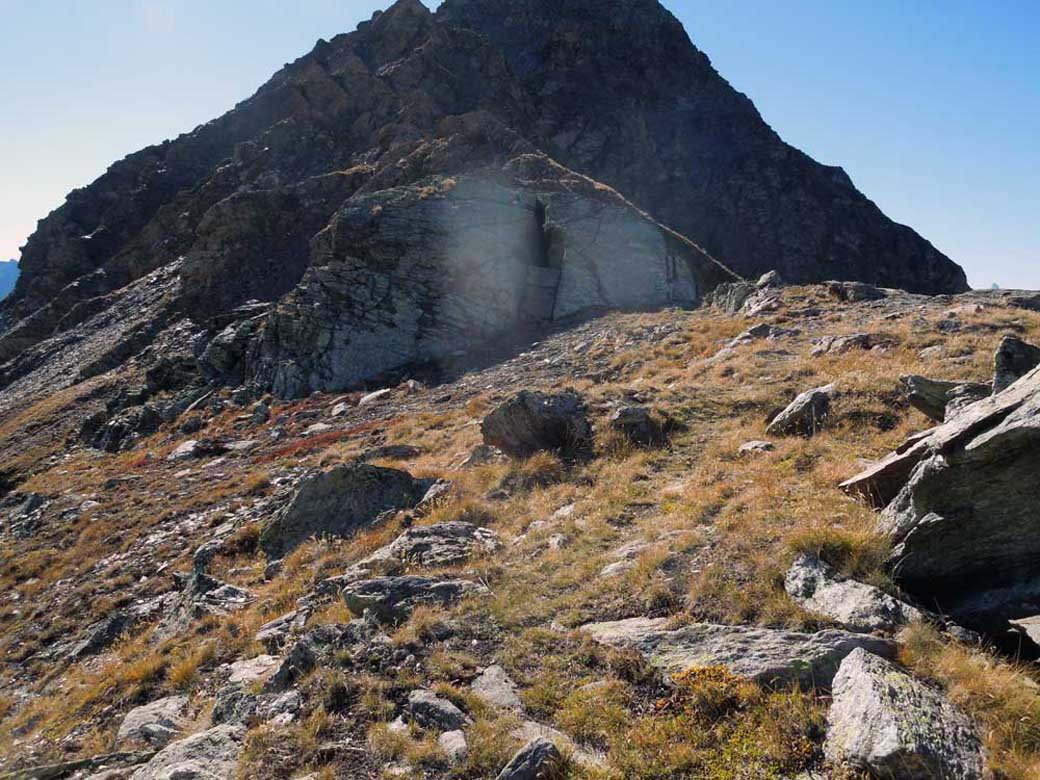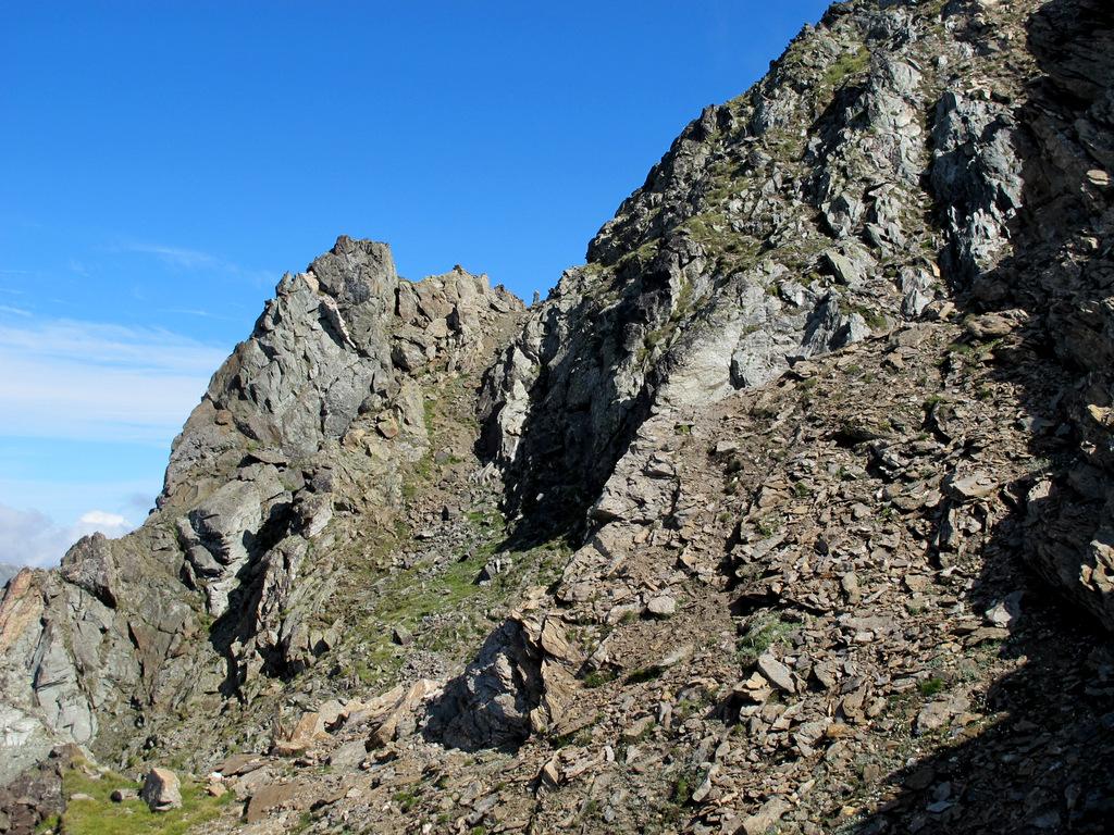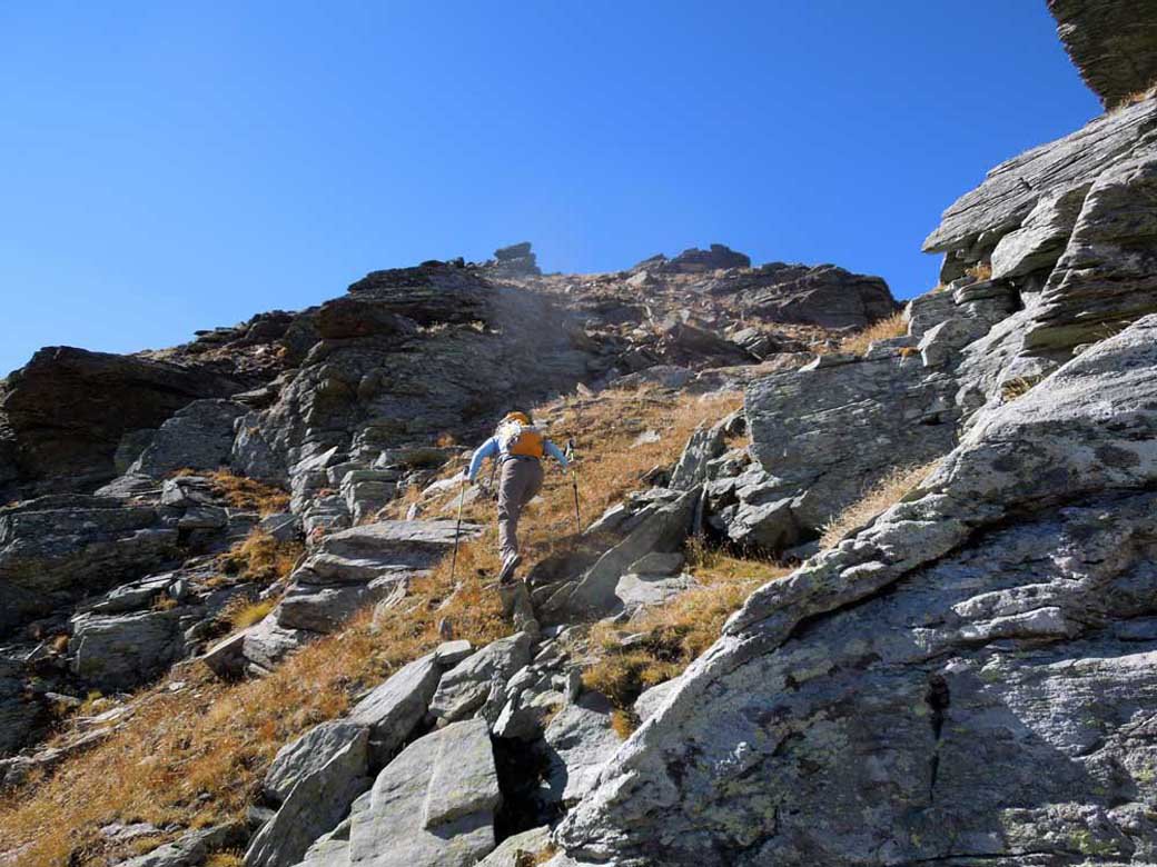 Si riprende a salire camminando fino a raggiungere un secondo muretto, anche qui con pochi passi di I si supera l’ostacolo, per riprendere a salire su terreno più facile. Si aggira un pinnacolo sul lato destro sfruttando un canalino, e quindi per pietrame e tracce di sentiero si raggiunge la cima senza ulteriori problemi.