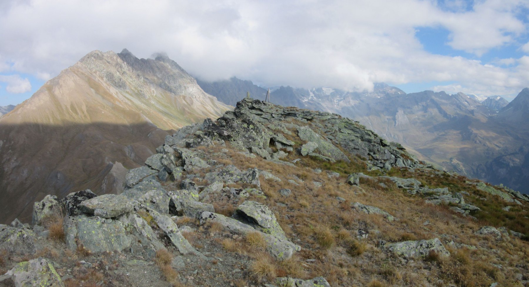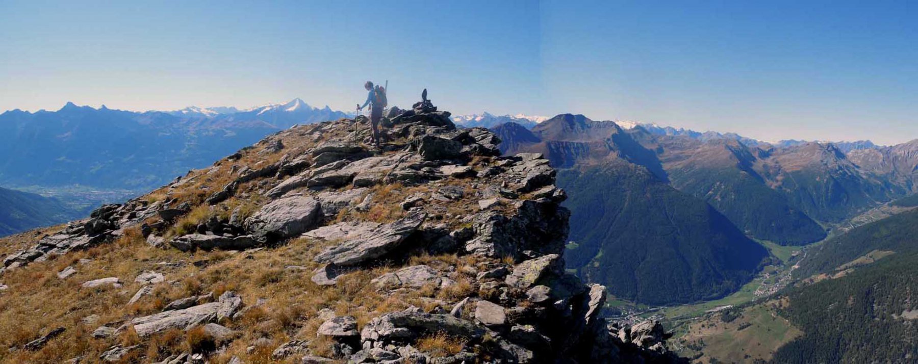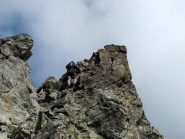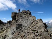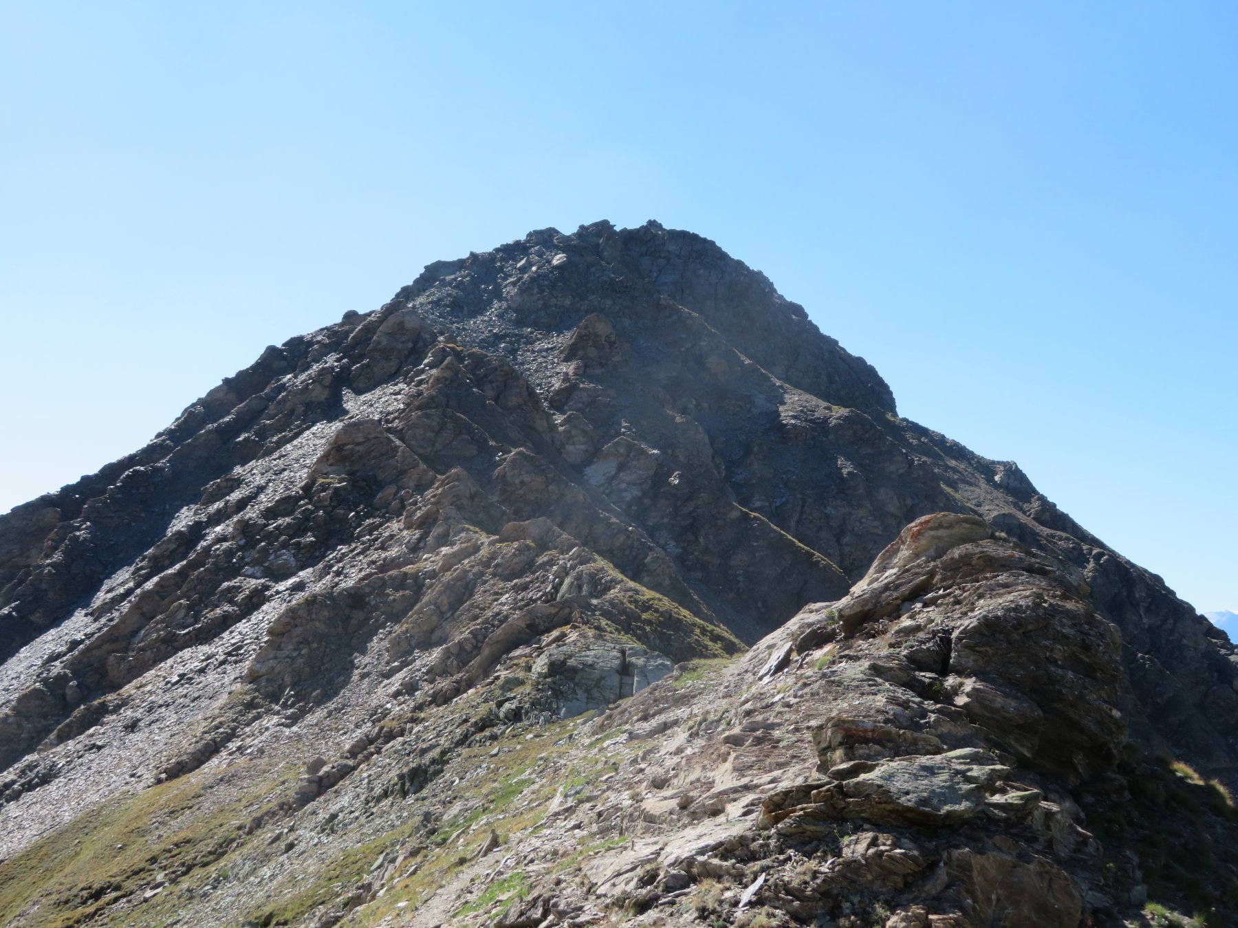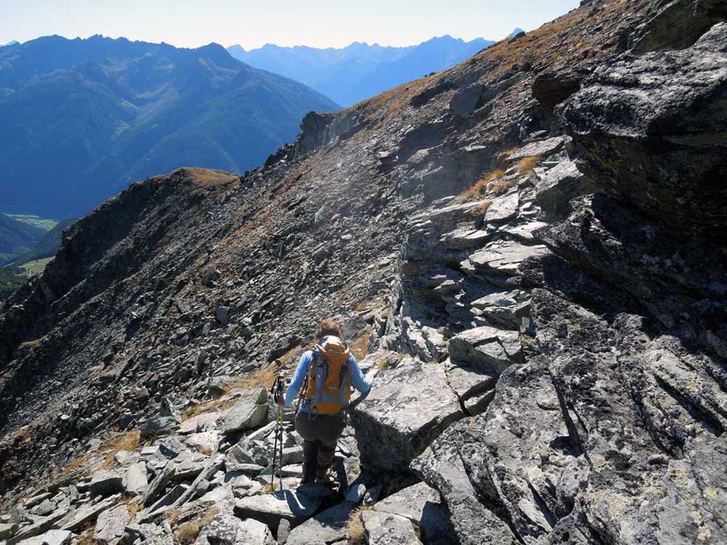 Si riprende a salire camminando fino a raggiungere un secondo muretto, anche qui con pochi passi di I si supera l’ostacolo, per riprendere a salire su terreno più facile. Si aggira un pinnacolo sul lato destro sfruttando un canalino, e quindi per pietrame e tracce di sentiero si raggiunge la cima senza ulteriori problemi.