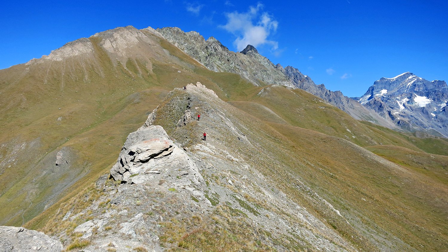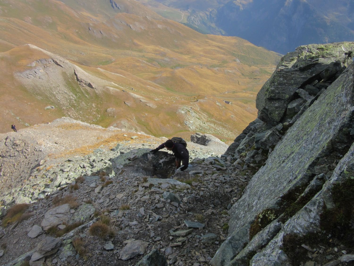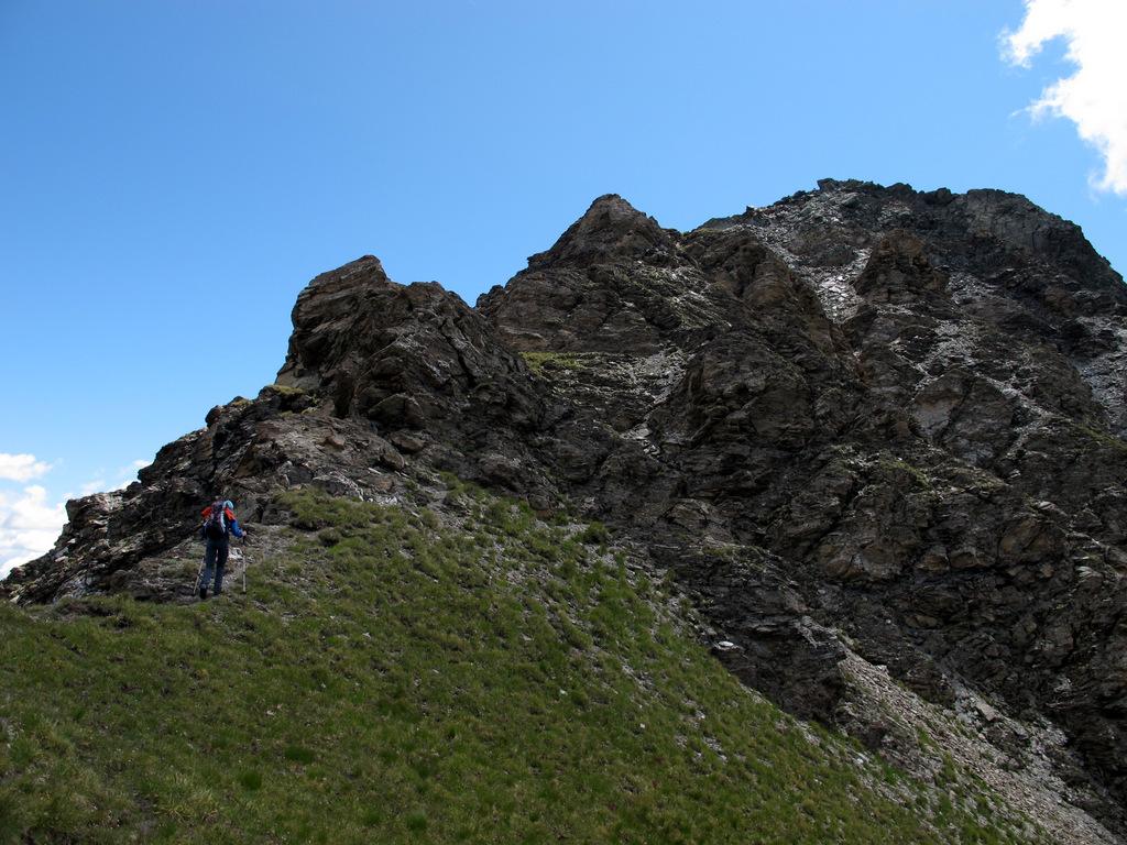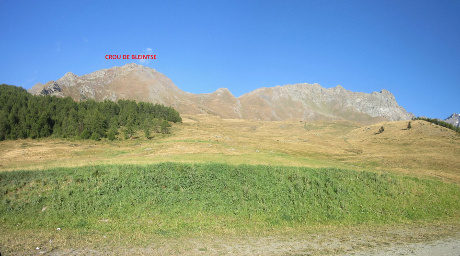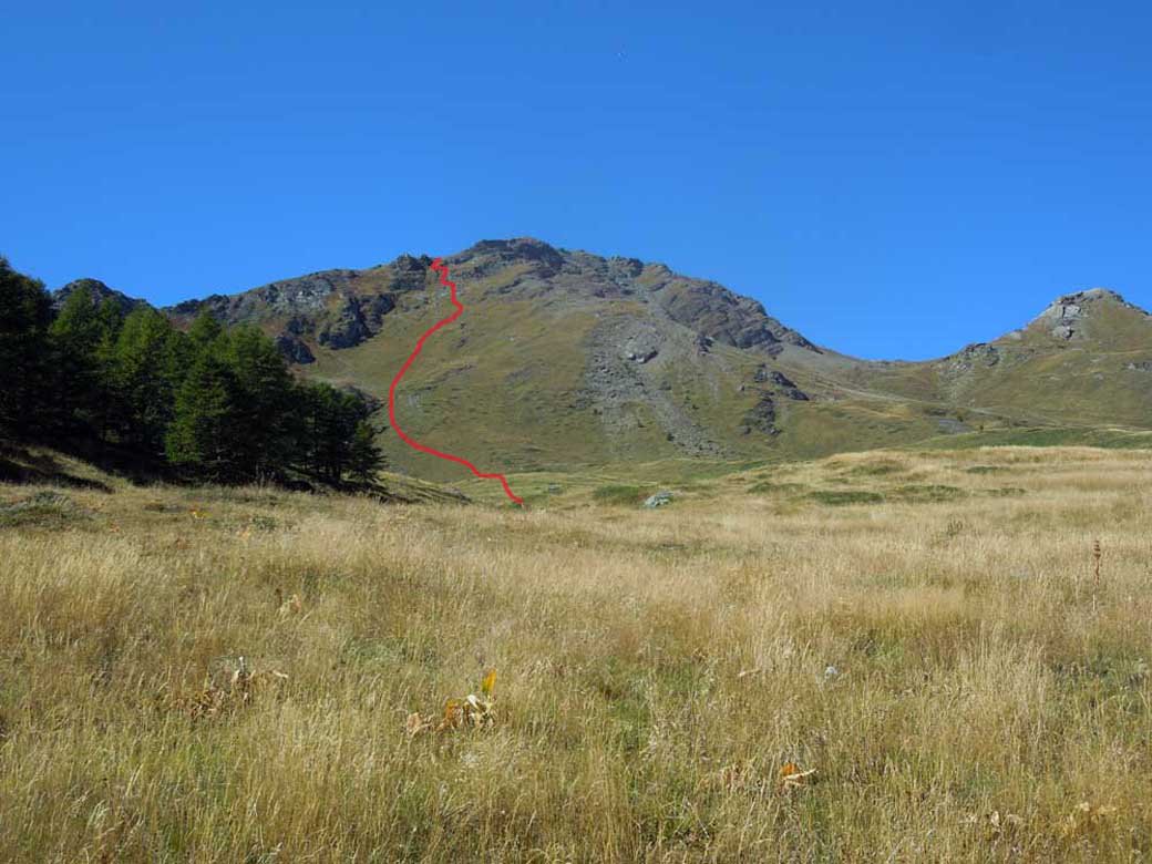 Dal colle si prosegue verso sud, salendo al piccolo torrione e proseguendo sul crinale portandosi alla base del versante nord del Crou de Bleintse. Non ci si deve far ingannare dall’aspetto poco invitante, i bolli rossi di vernice (da seguire fedelmente) condurranno in cima senza particolari difficoltà. L’inizio del percorso di cresta è su un facile sentiero leggermente sul versante di Etroubles, per poi passare sul versante di Champillon per aggirare alcuni ostacoli rocciosi. Il terreno è friabile ma privo di pericoli, si arriva al primo passaggio leggermente più impegnativo, ovvero la salita di un breve muretto di I su roccia mediocre e sporca, non c’è esposizione.