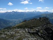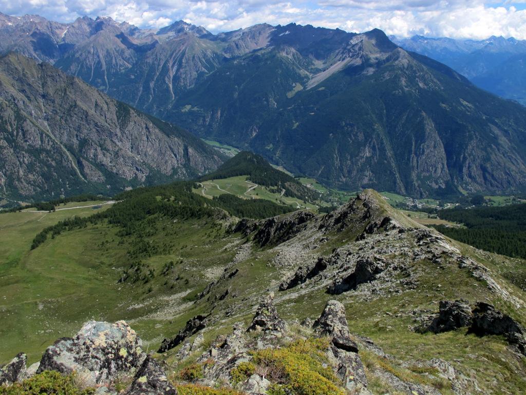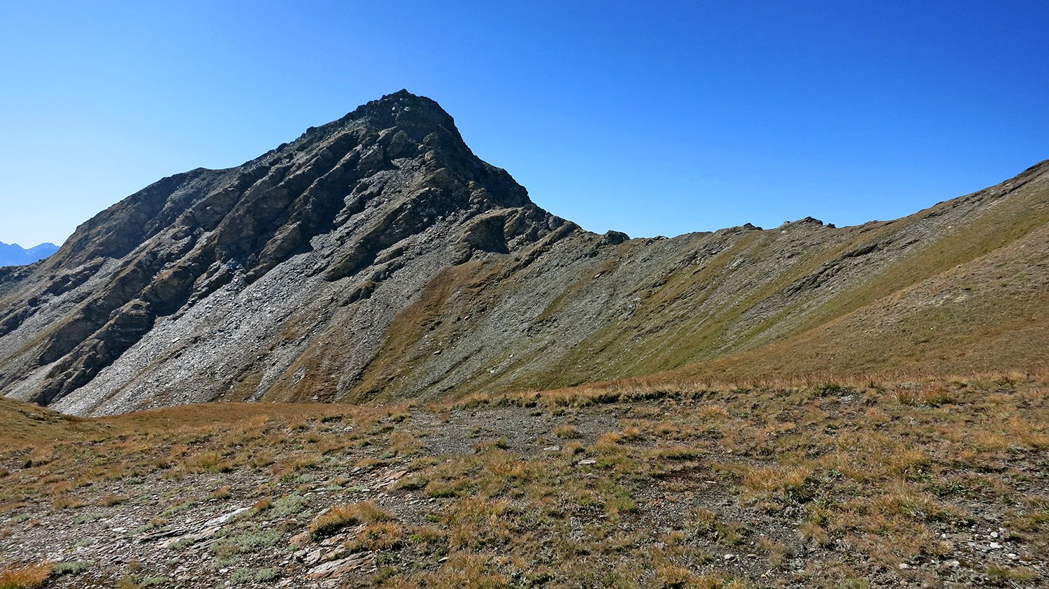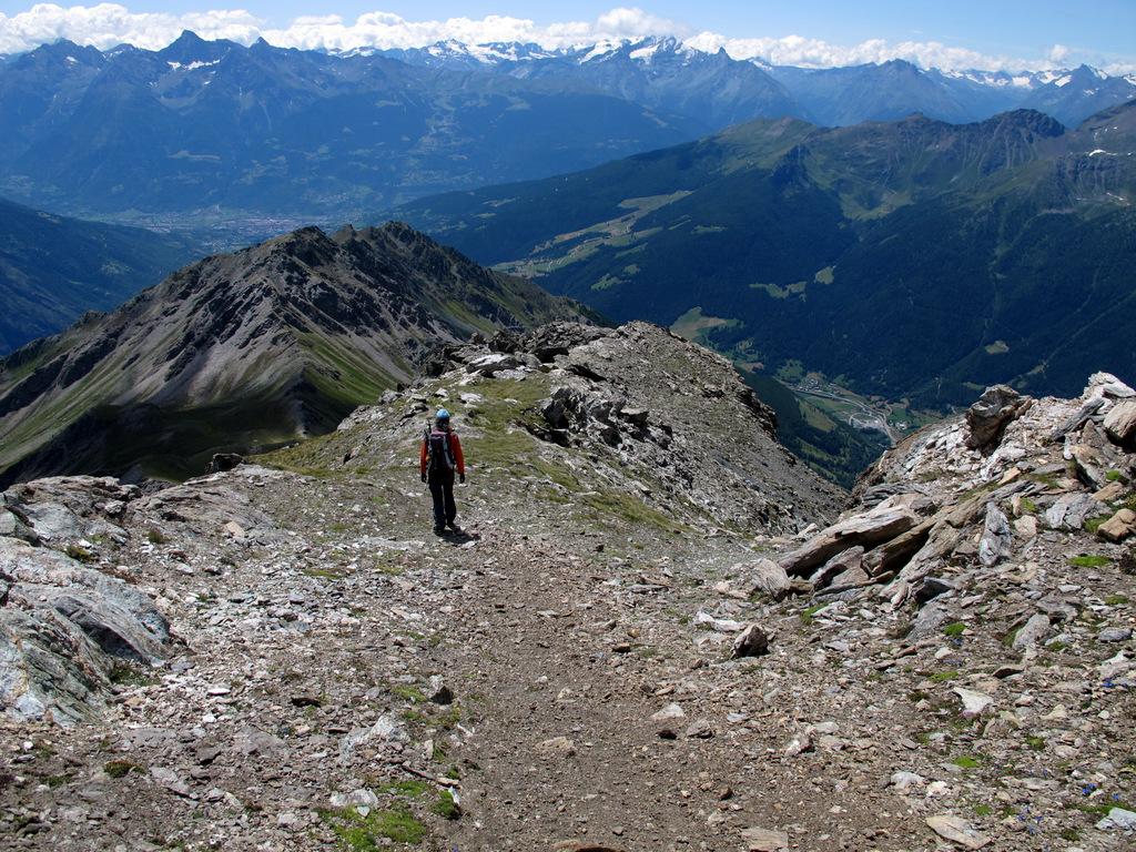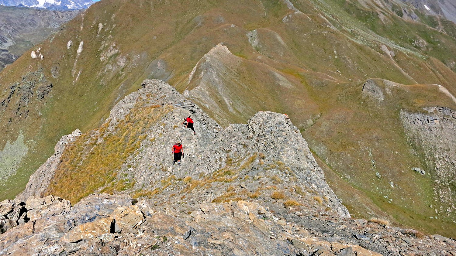 Dal colle si prosegue verso sud, salendo al piccolo torrione e proseguendo sul crinale portandosi alla base del versante nord del Crou de Bleintse. Non ci si deve far ingannare dall’aspetto poco invitante, i bolli rossi di vernice (da seguire fedelmente) condurranno in cima senza particolari difficoltà. L’inizio del percorso di cresta è su un facile sentiero leggermente sul versante di Etroubles, per poi passare sul versante di Champillon per aggirare alcuni ostacoli rocciosi. Il terreno è friabile ma privo di pericoli, si arriva al primo passaggio leggermente più impegnativo, ovvero la salita di un breve muretto di I su roccia mediocre e sporca, non c’è esposizione.