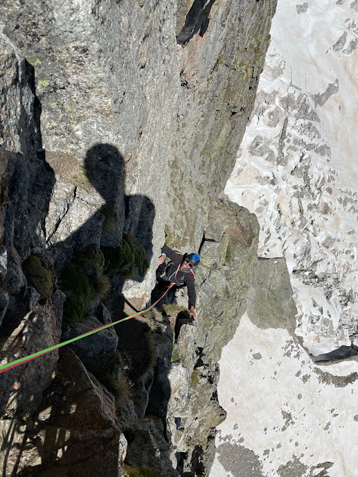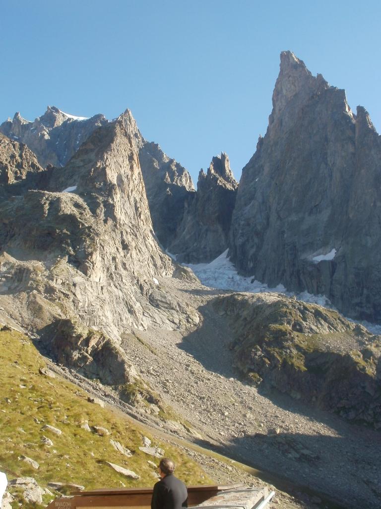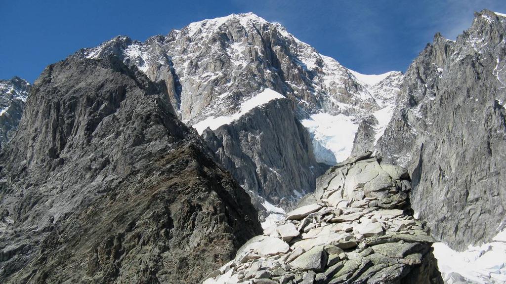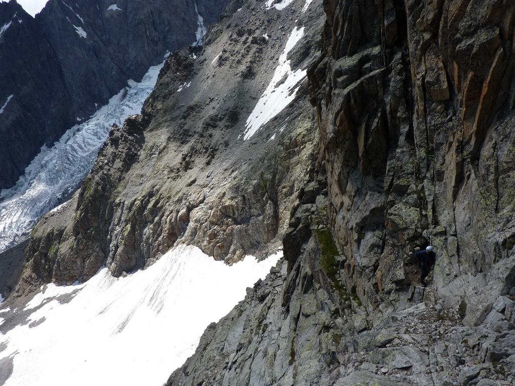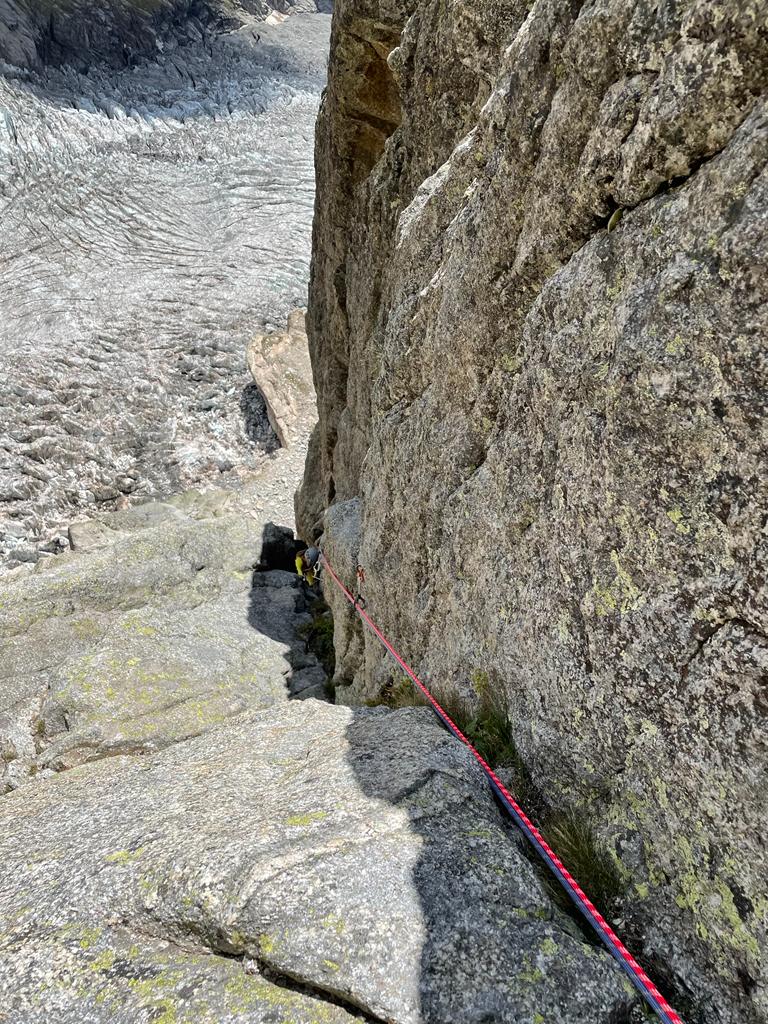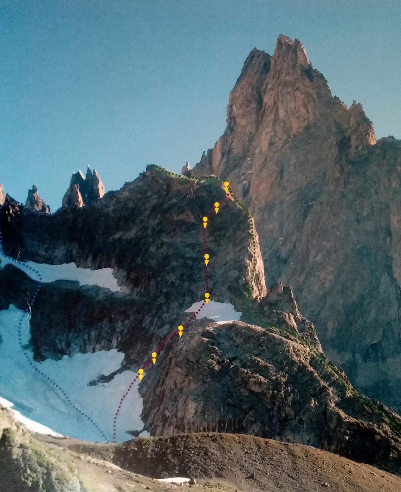 La via attacca nella parte più bassa della cresta, su uno sperone di roccia/placconata compatta ascendente a sx dove si intravedono i primi spit, praticamente sulla balconata sopra il gh. del Freney.