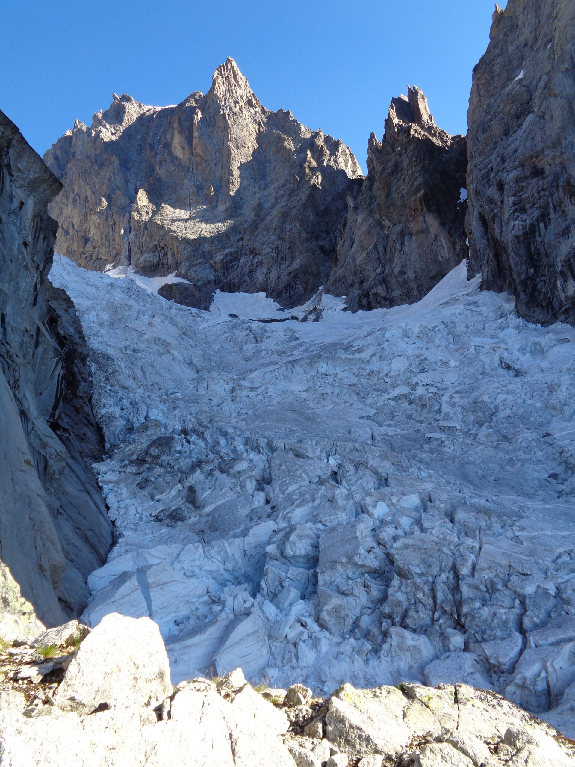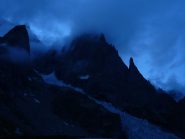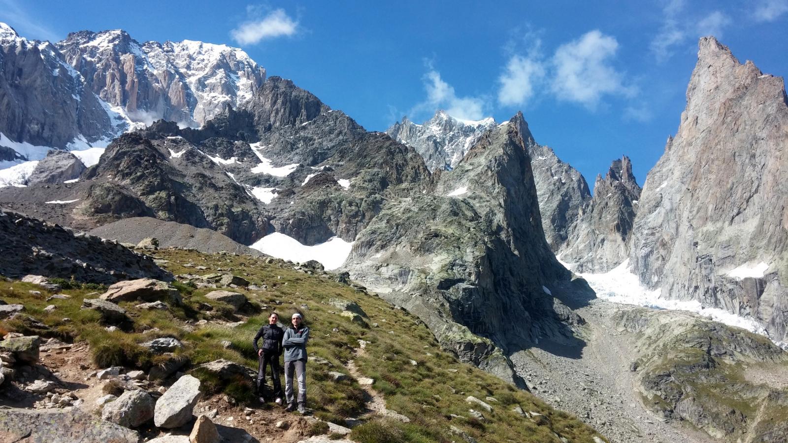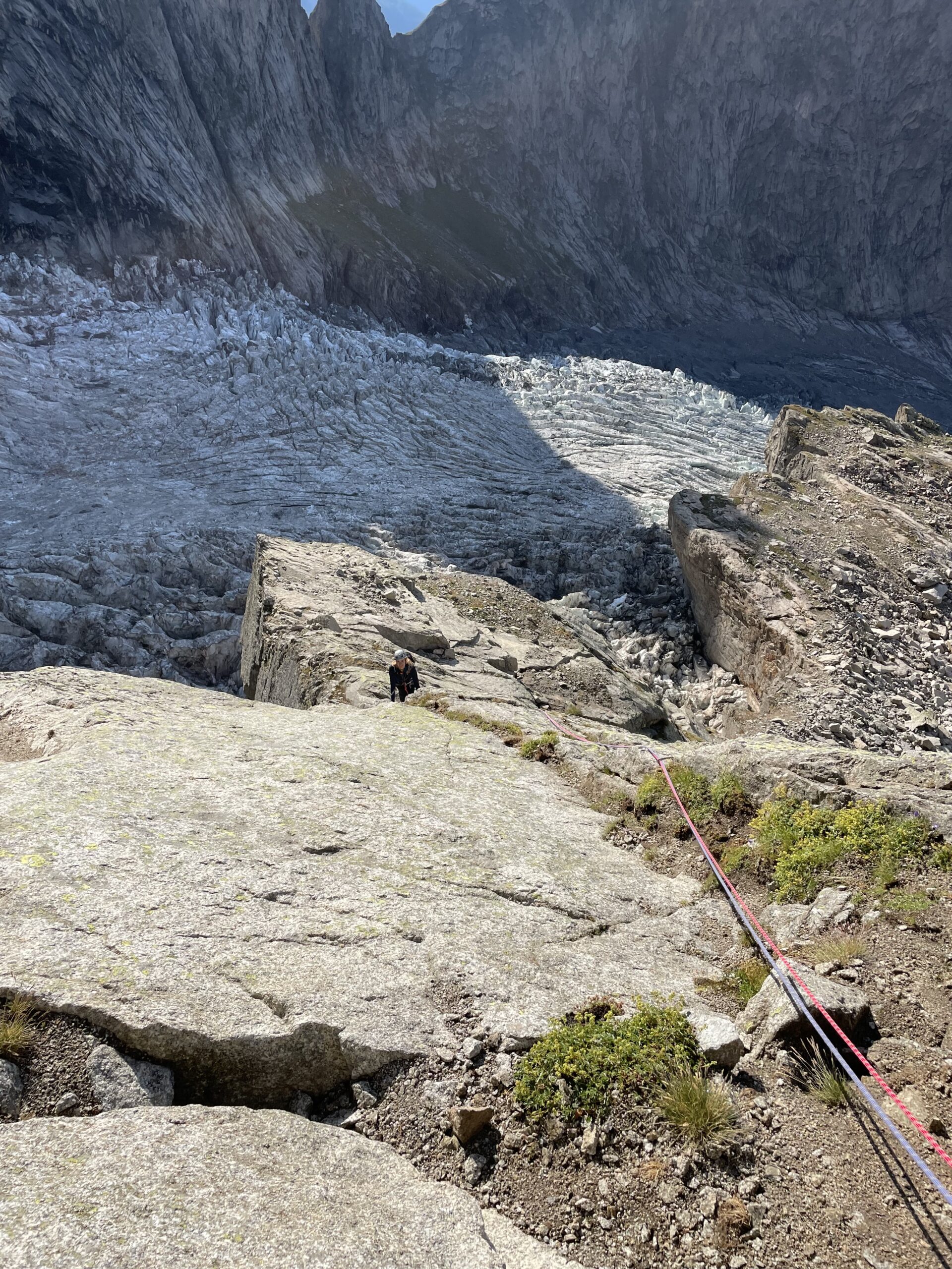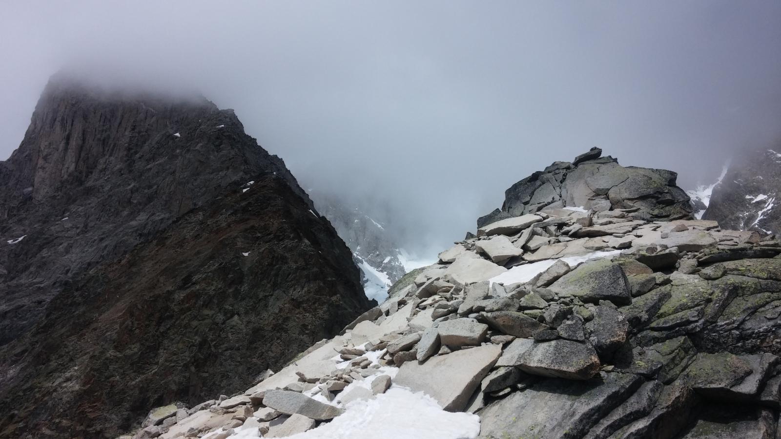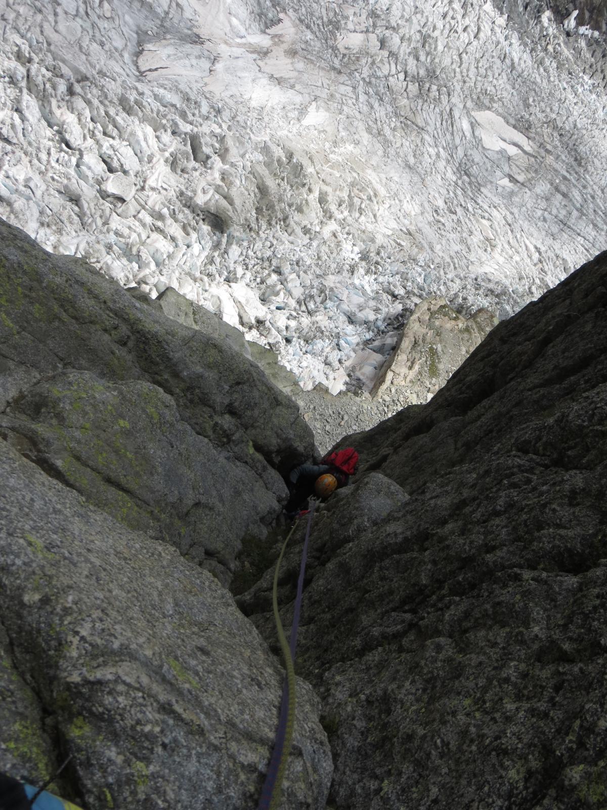La via attacca nella parte più bassa della cresta, su uno sperone di roccia/placconata compatta ascendente a sx dove si intravedono i primi spit, praticamente sulla balconata sopra il gh. del Freney.