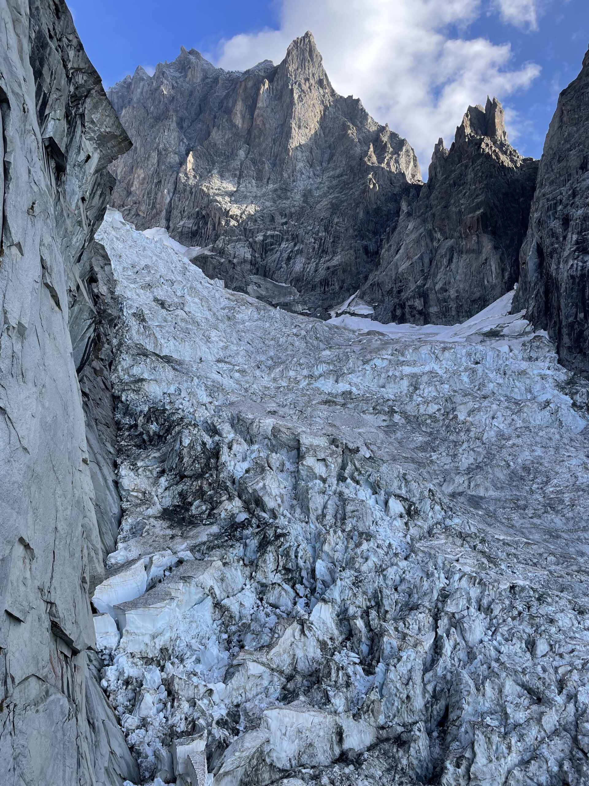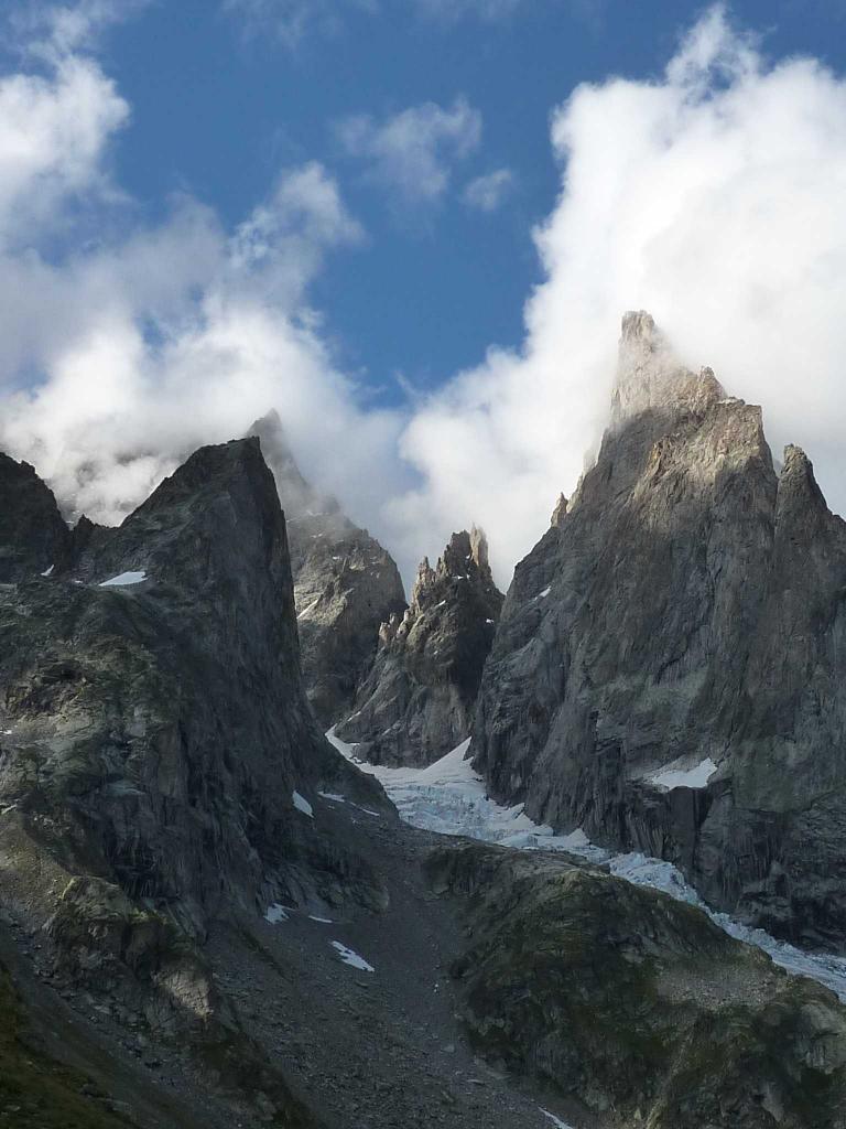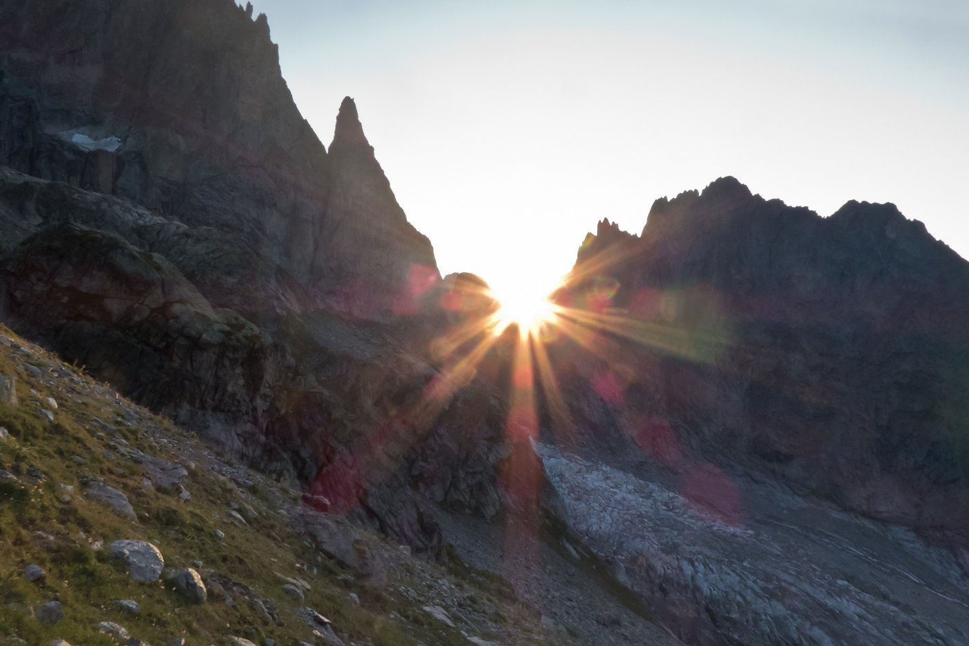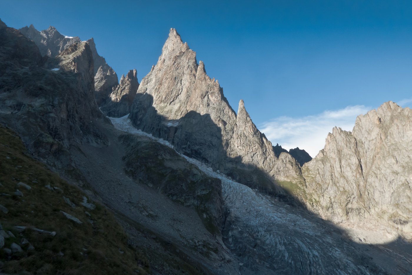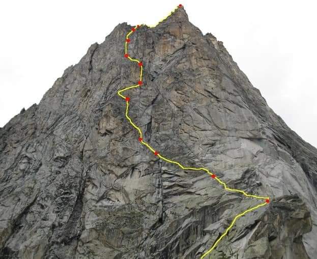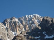 La via attacca nella parte più bassa della cresta, su uno sperone di roccia/placconata compatta ascendente a sx dove si intravedono i primi spit, praticamente sulla balconata sopra il gh. del Freney.