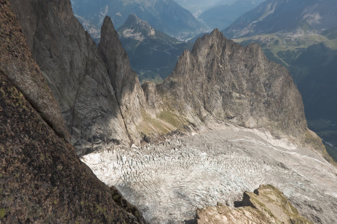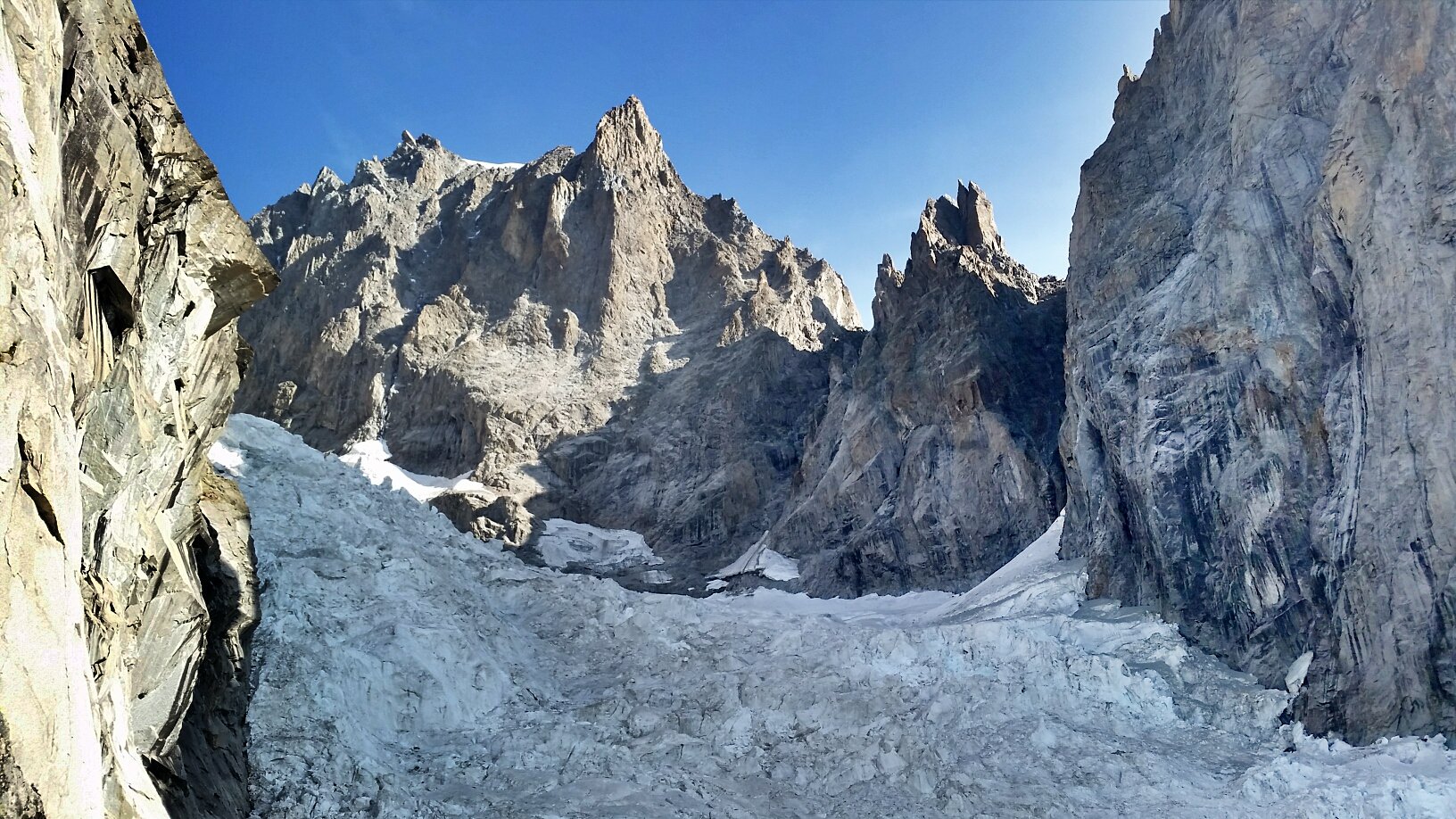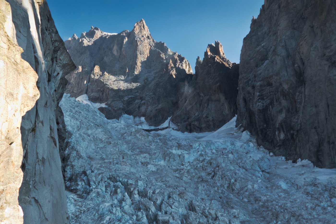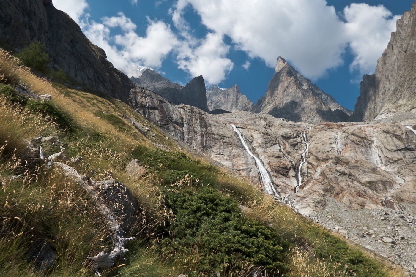 La via attacca nella parte più bassa della cresta, su uno sperone di roccia/placconata compatta ascendente a sx dove si intravedono i primi spit, praticamente sulla balconata sopra il gh. del Freney.