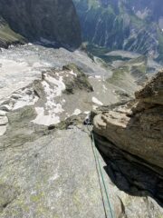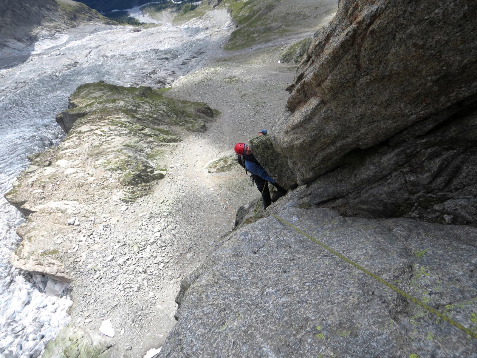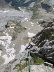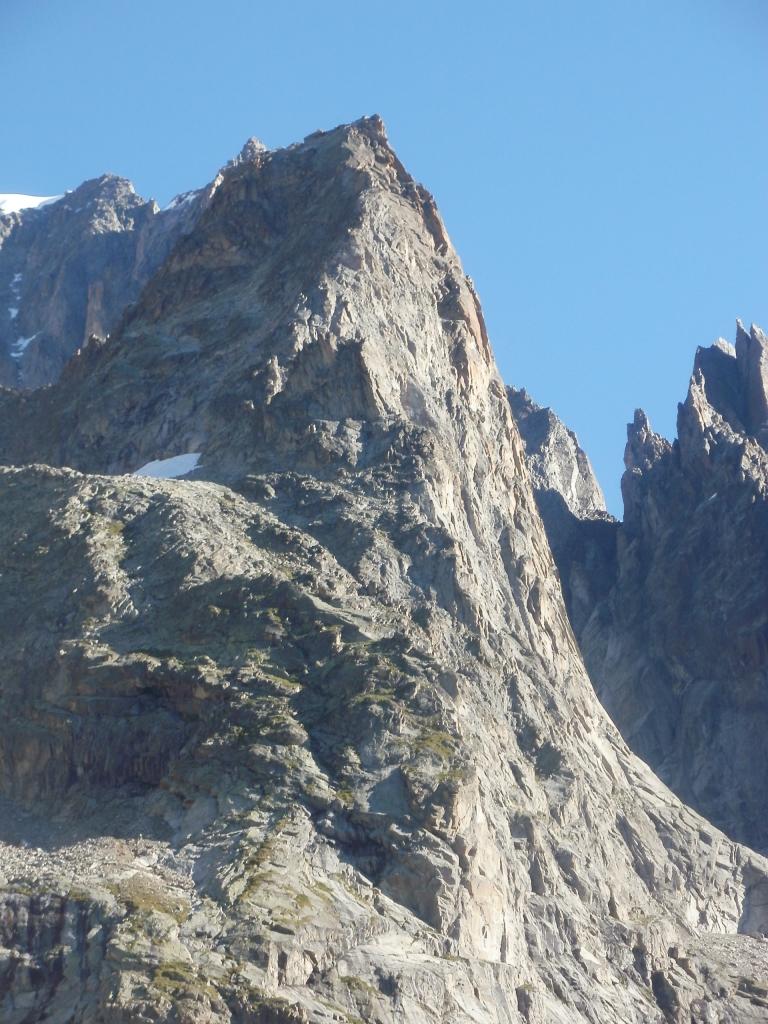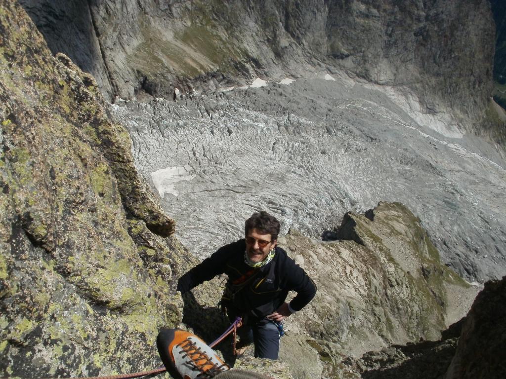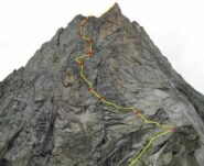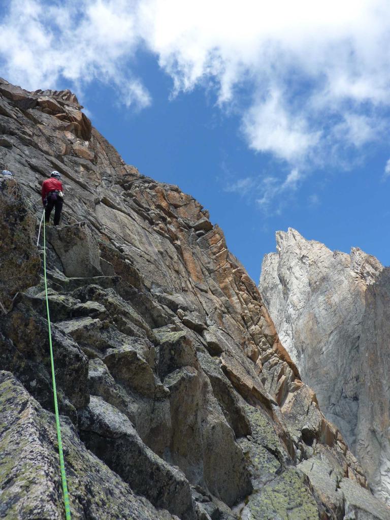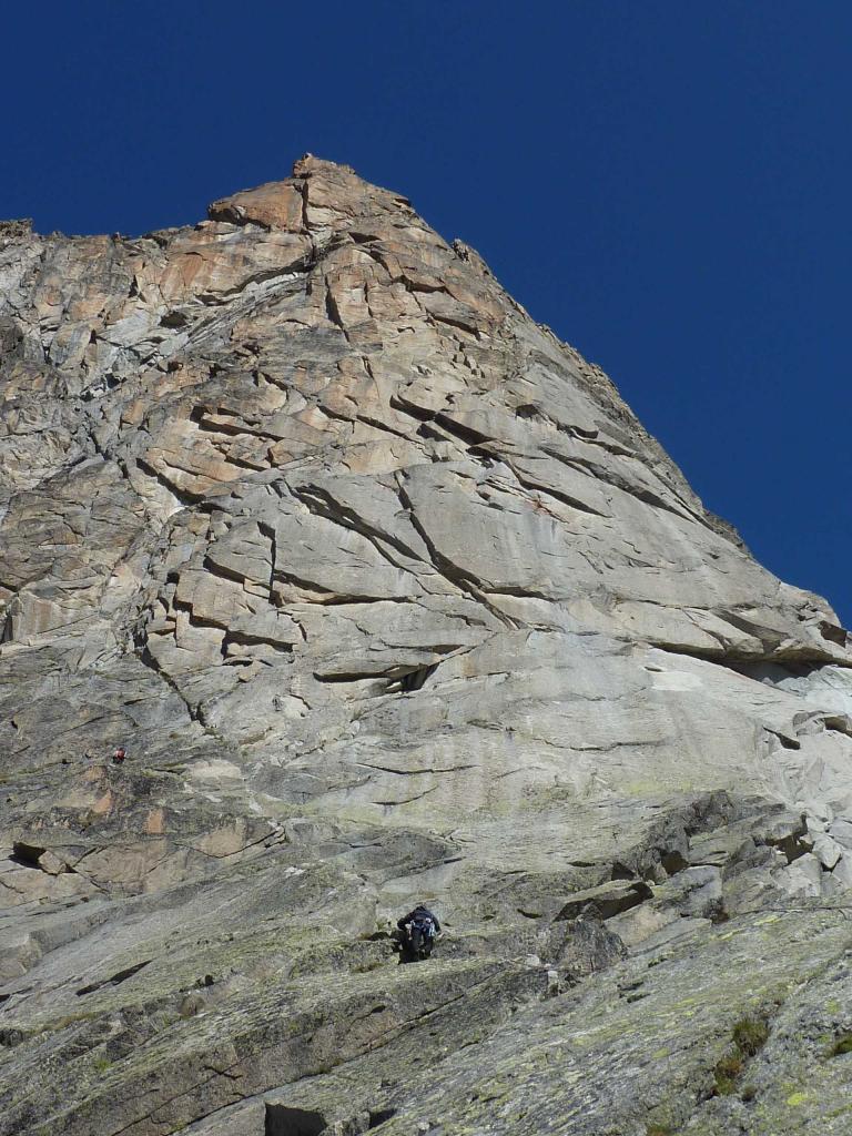 - L13+14: ancora per placche compatte, puntando ad un’evidente forcella, prima della quale si supera un piccolo salto verticale (III+/un passo di IV). 30+30m (eventualmente spezzabili in 2 tiri). La via storica di Ottoz-Hurzeler si ricongiunge alla sosta intermedia.