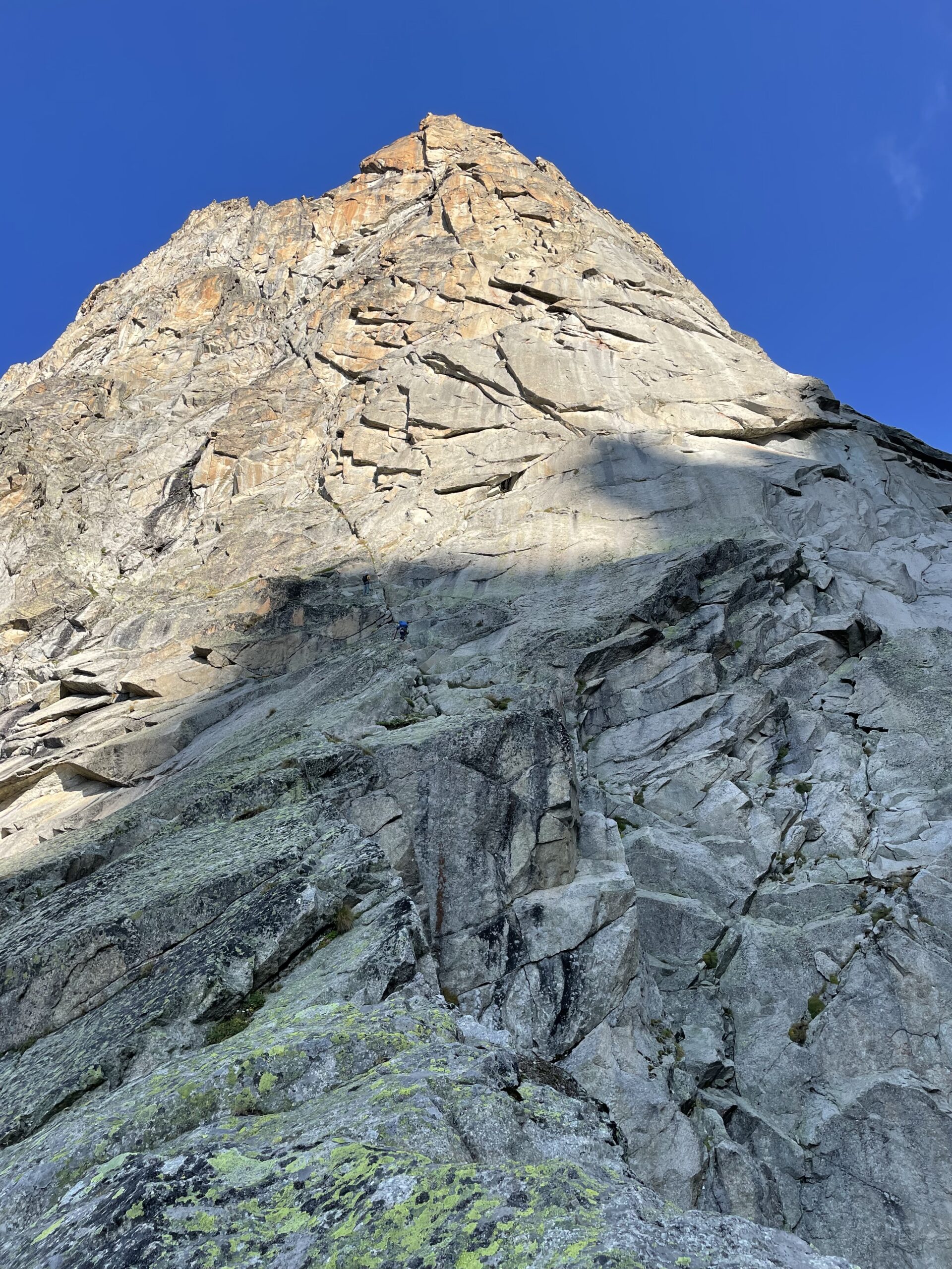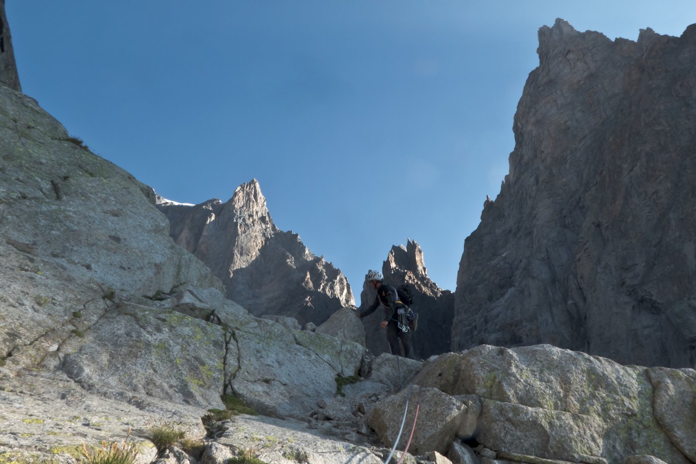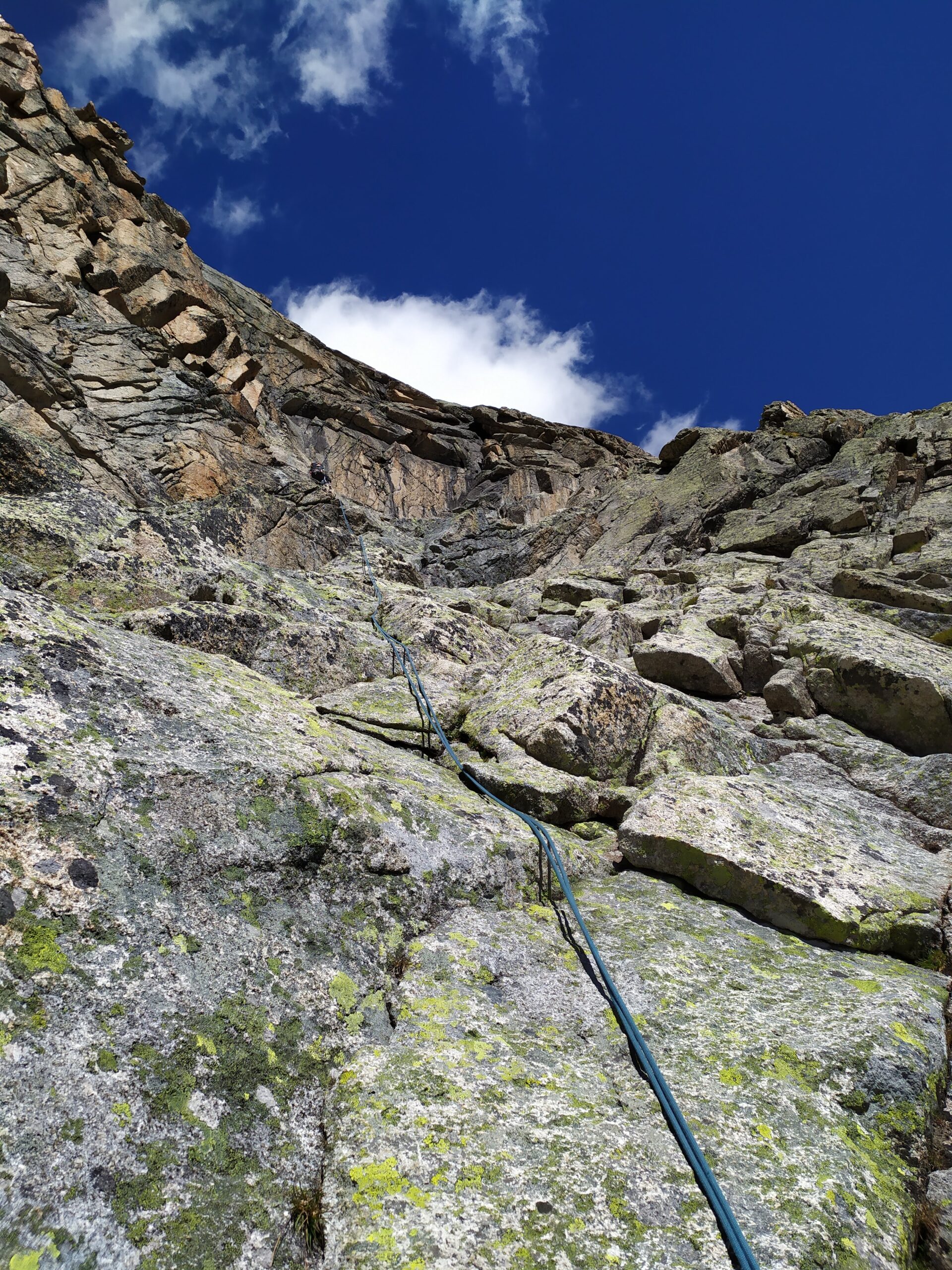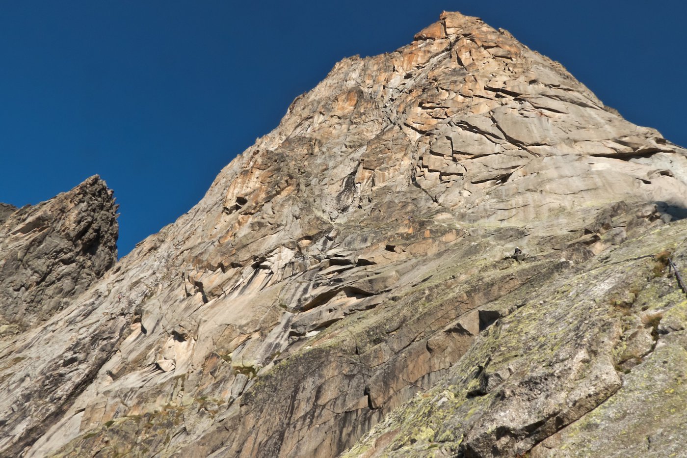 - L13+14: ancora per placche compatte, puntando ad un’evidente forcella, prima della quale si supera un piccolo salto verticale (III+/un passo di IV). 30+30m (eventualmente spezzabili in 2 tiri). La via storica di Ottoz-Hurzeler si ricongiunge alla sosta intermedia.