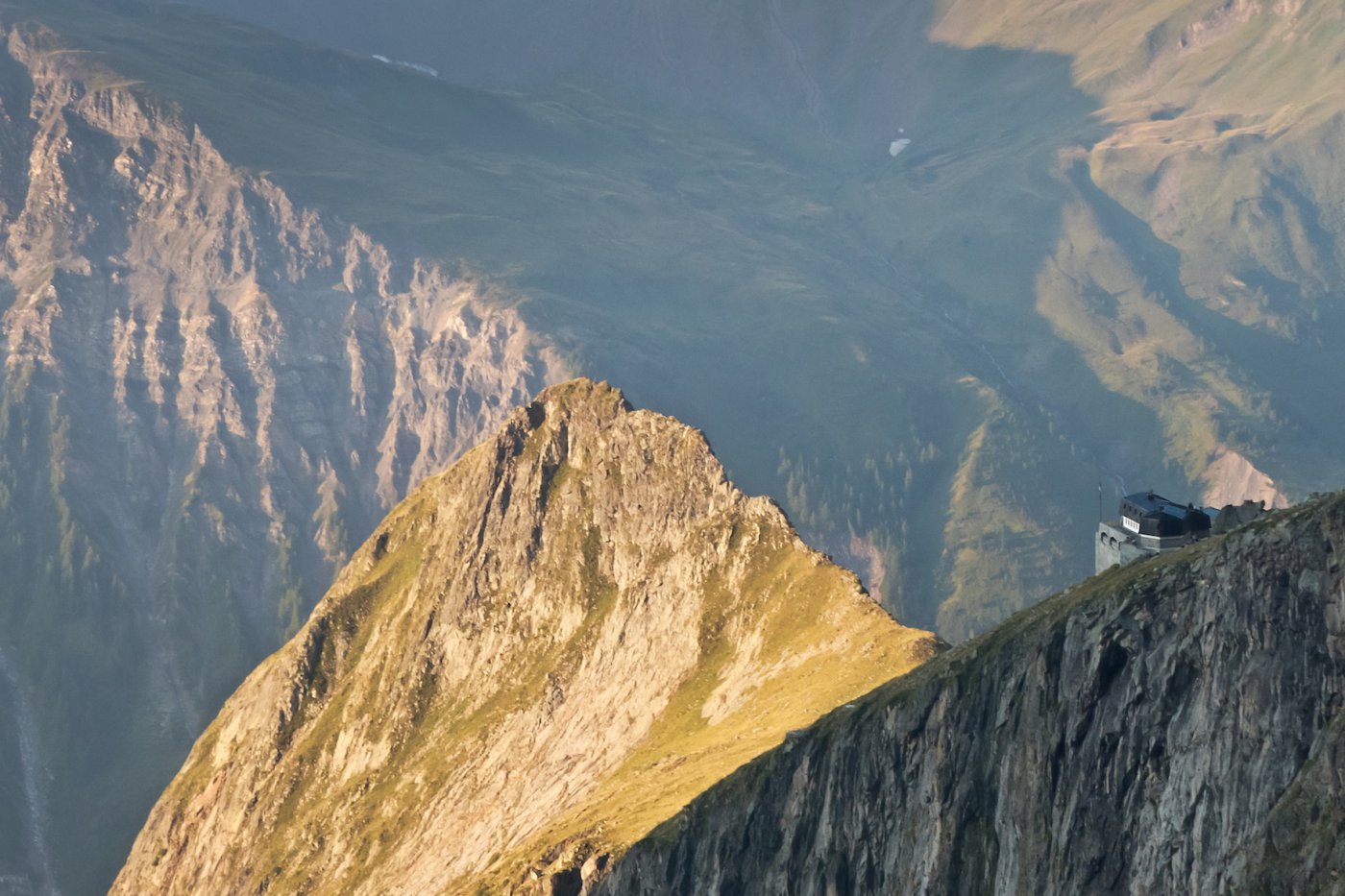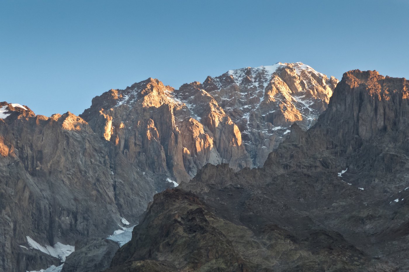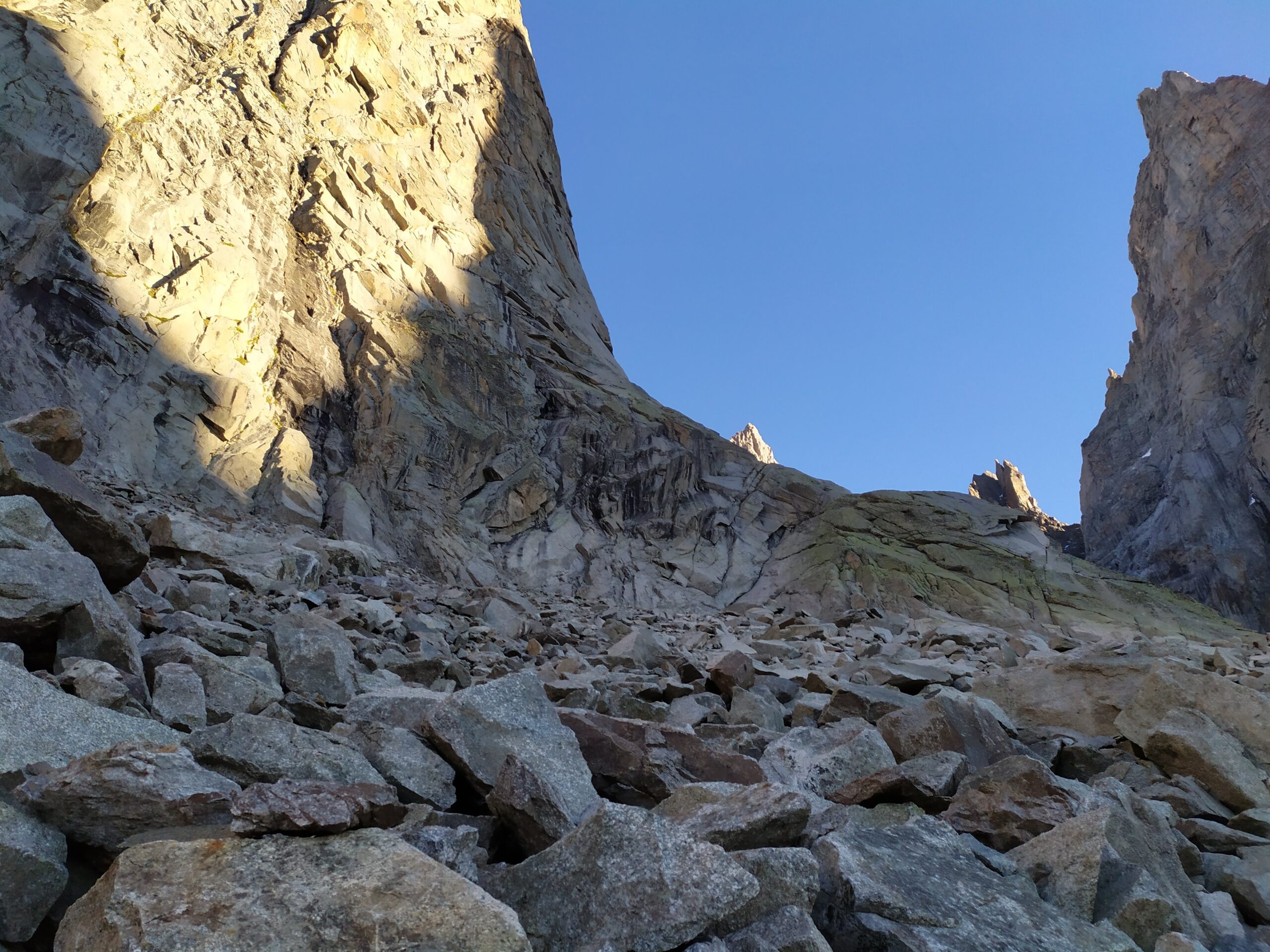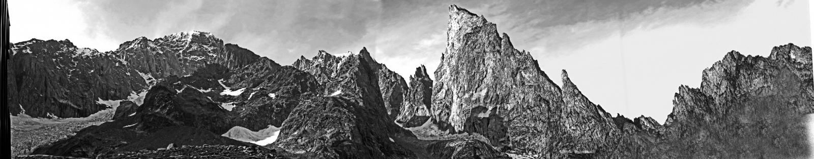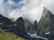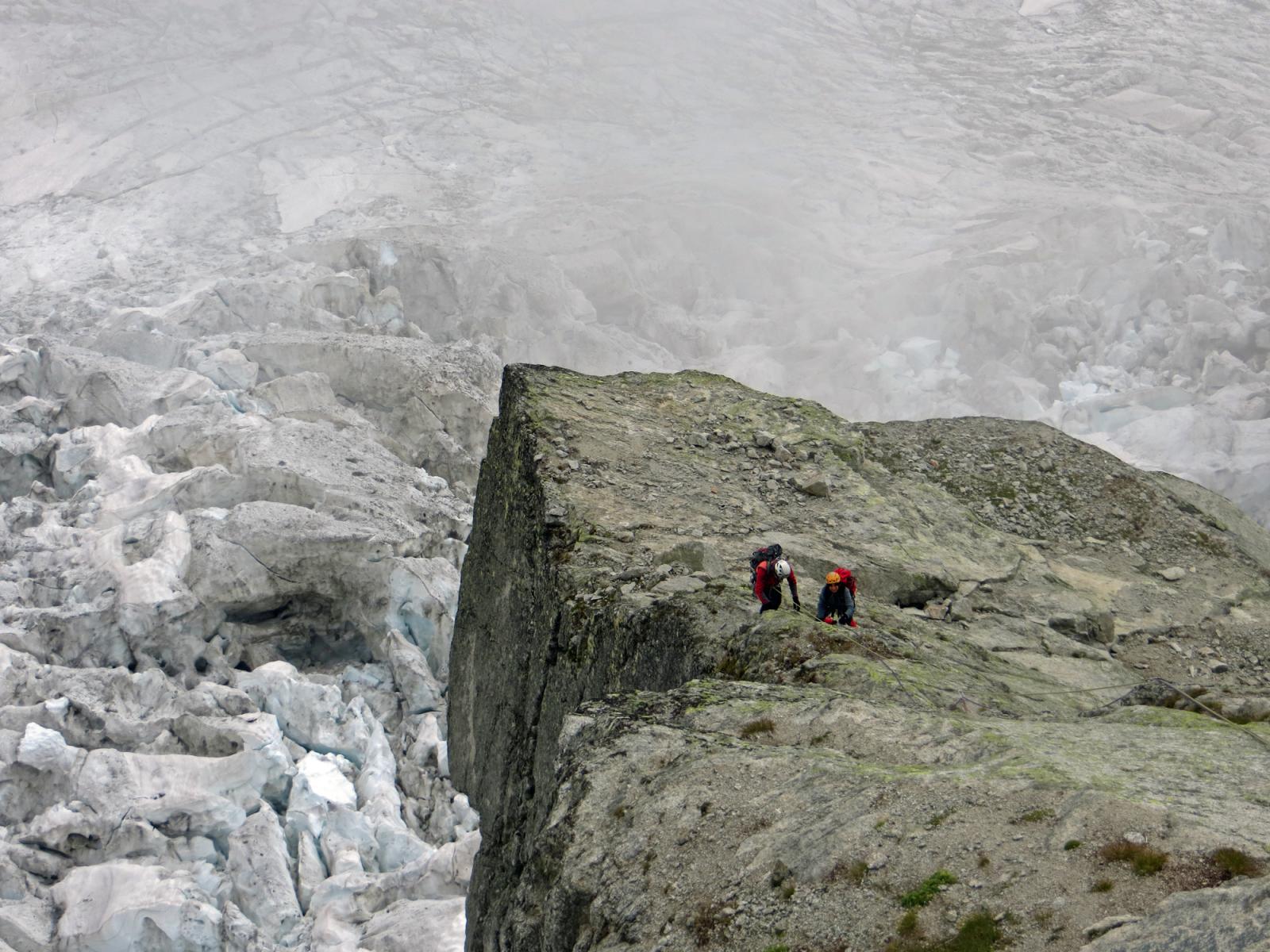 - L13+14: ancora per placche compatte, puntando ad un’evidente forcella, prima della quale si supera un piccolo salto verticale (III+/un passo di IV). 30+30m (eventualmente spezzabili in 2 tiri). La via storica di Ottoz-Hurzeler si ricongiunge alla sosta intermedia.