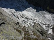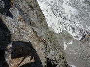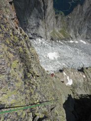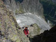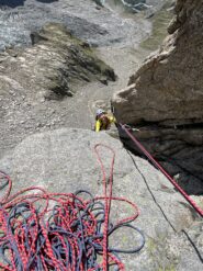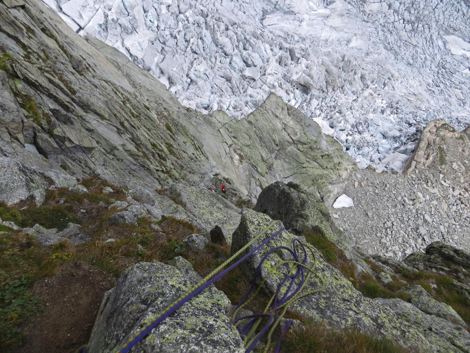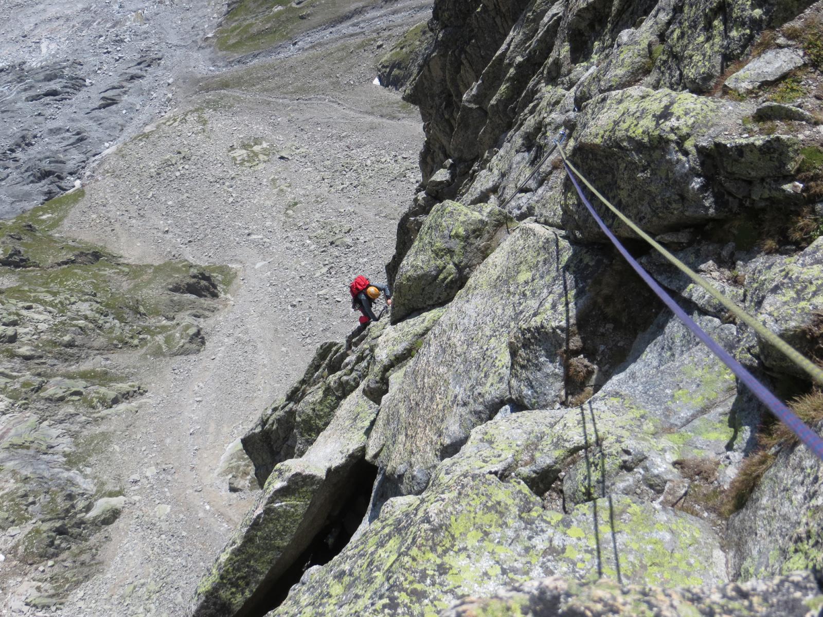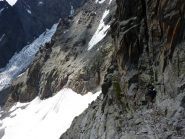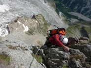 Si va a sx e scendendo per cengie con ometti ben segnalati si raggiunge un ultimo salto roccioso alla sommità del quale è stata attrezzata una doppia da 60 metri che permette di arrivare ai ghiaioni appena sopra al sentiero che posta al Monzino.