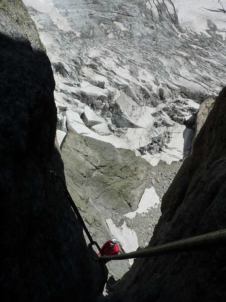 Descrizione: dalla sosta ultima si scende sino alla cengia e da li si seguono le calate (inox con catena, nuove) sino al primo nevaio (calate da 25 m tutte della raumer); al nevaio è stato collegato uno spit con grosso anello, così da scendere il nevaio, con una doppia, in sicurezza.