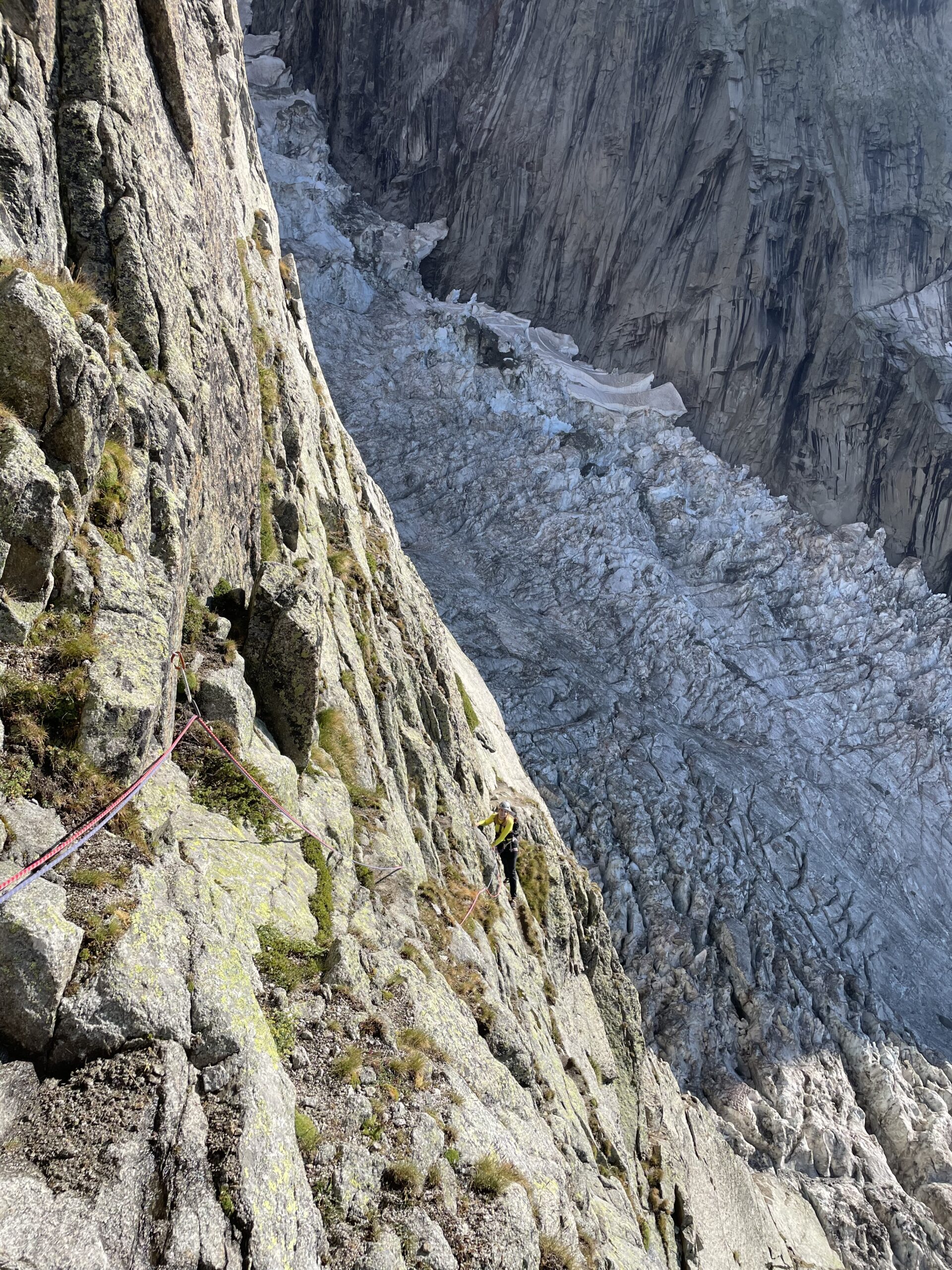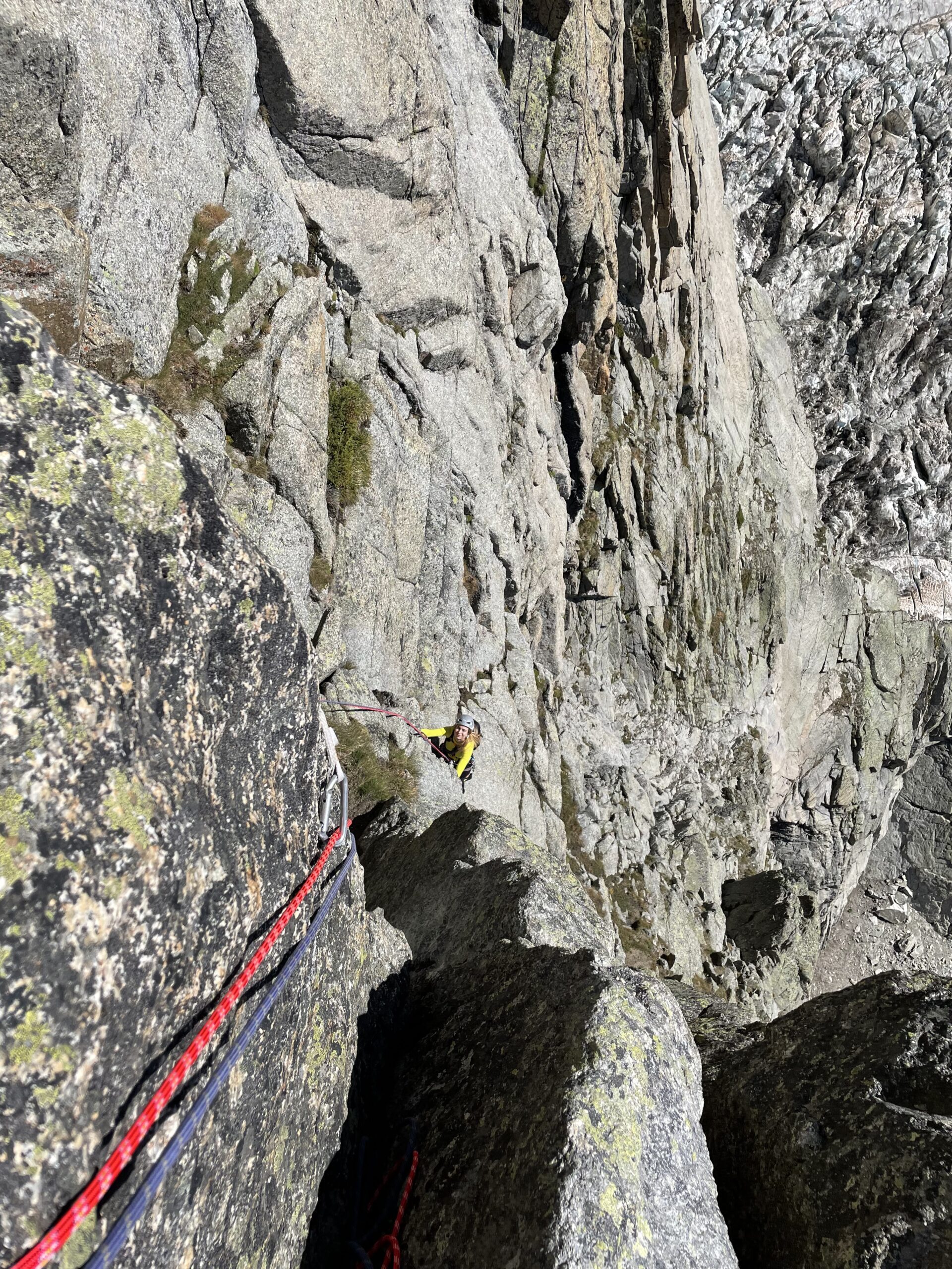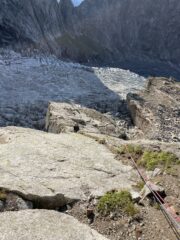 Abbiamo personalmente trovato il sentiero di avvicinamento un po’ esposto, per questo motivo abbiamo preferito assicurarci per un breve tratto. Il sentiero/pietraia di ritorno è attrezzato in certi punti per scendere con delle doppie, che abbiamo trovato utili per una maggiore sicurezza.