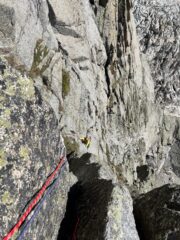 Abbiamo fatto la variante “classica” delle guide, che ha in comune i primi 6 tiri con la via Ottoz originale del 1935. In ogni caso alla sesta sosta ci sono due frecce che indicano la direzione da prendere. La via si compone di 15 tiri, che personalmente non abbiamo trovato mai troppo banali. Sicuramente il più duro per noi è stato l’undicesimo che è ben verticale e presenta meno prese dei precedenti. Non è una via da prendere sottogamba per la sua lunghezza, ci vogliono circa 6 ore per scalarla e 3 per scendere in doppie/sentiero.