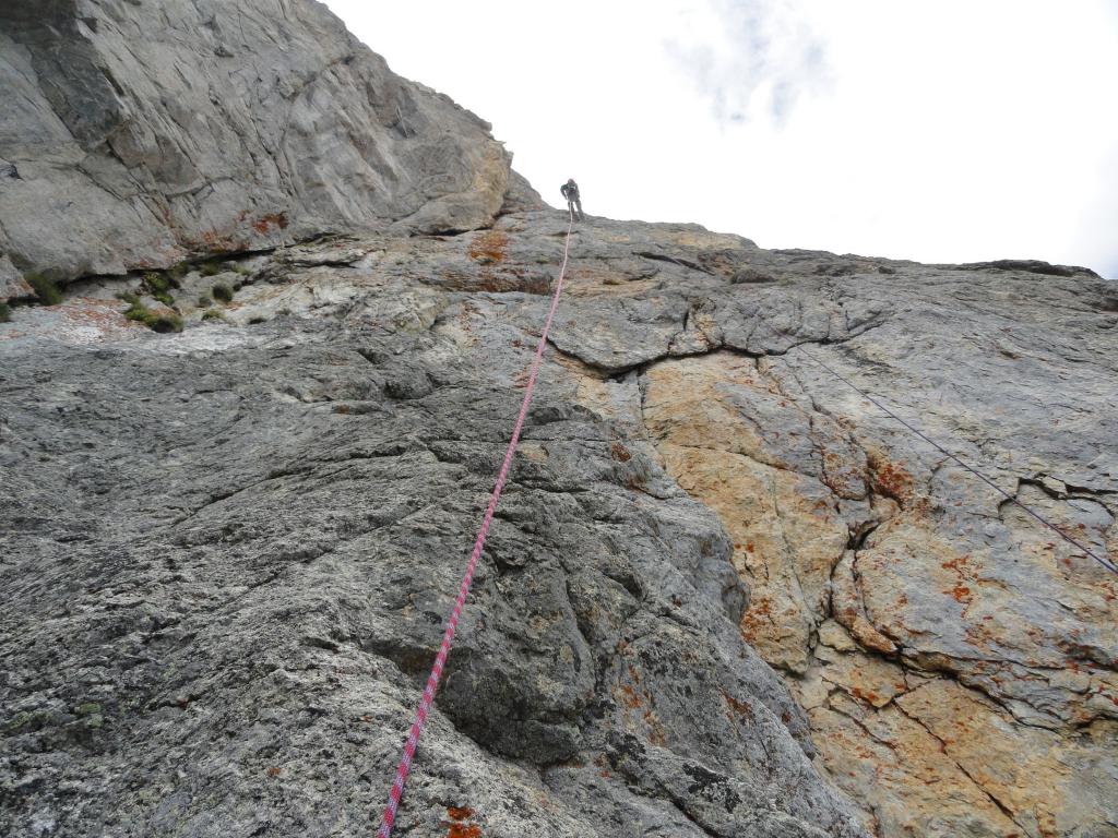 L3: 6b, belle fessure in dulfer; passo duro in placca per aggirare a destra un piccolo e poco marcato strapiombo