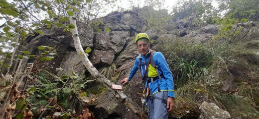 Nel primissimo pomeriggio, visto impegni mattutini ed attesa di asciugatura, porto il socio Lorenzo a ripetere questa via. Come da relazione, alcuni spit, chiodi e cordoni lungo i 6 brevi tiri, anche di sosta, utili 2 friends piccoli e 2 medi per i tratti sprotetti intenzionalmente visto le buone possibilità di usarli. Alla partenza del quinto tiro, uno spit protegge la salita sulla rampa verso dx, poi vi sono 2 chiodi, il primo visibile da terra, l’altro quando lo si raggiunge dopo la rampa per salire in verticale su ottime ronchie. Il sesto tiro, dopo breve trasferimento, ha 2 spits, possibilità di salire dritti 5c oppure sullo spigolo a dx 5b. Poi bella crestina facile fino in cima, anche slegati. Corda da 30.