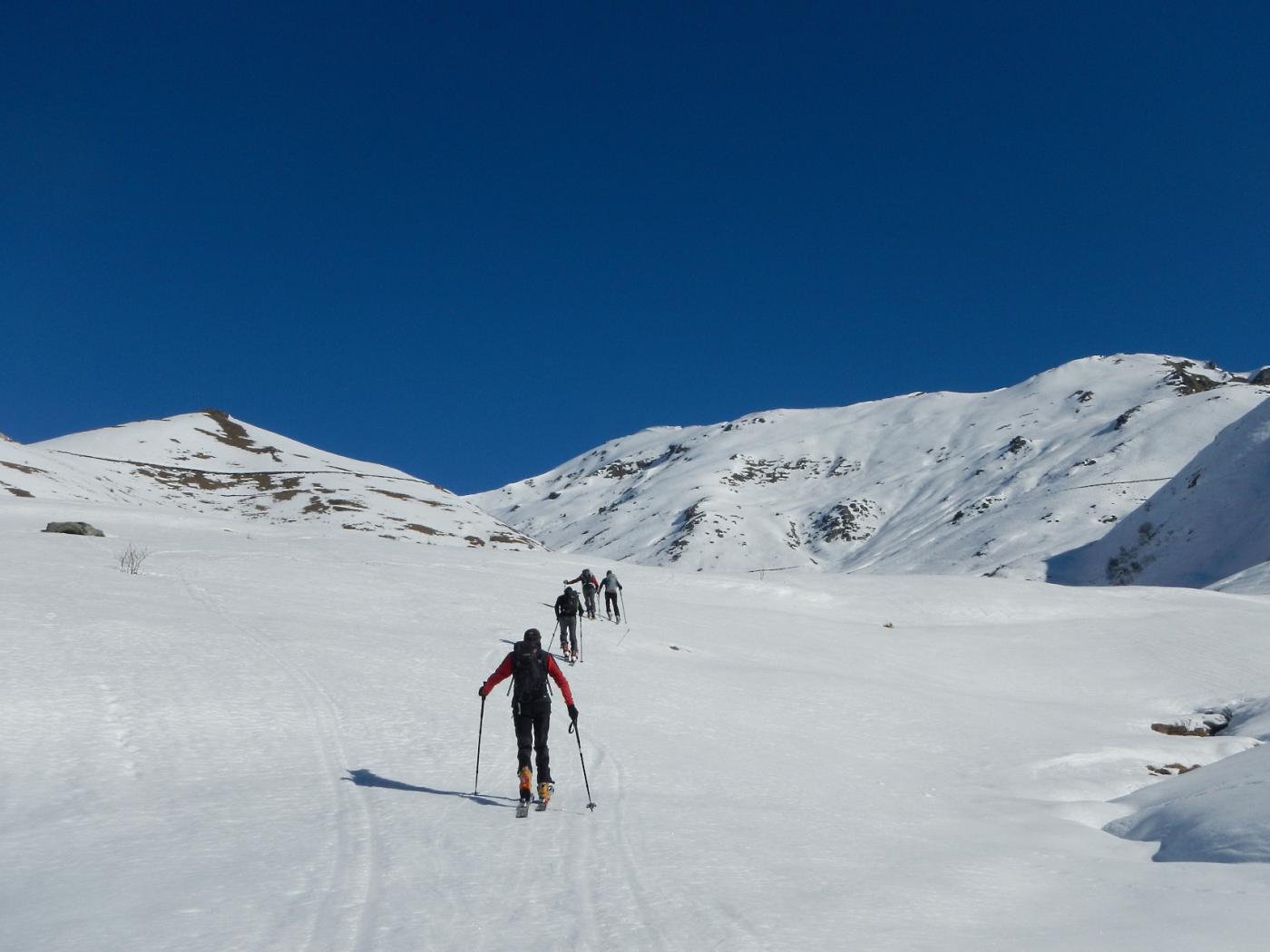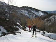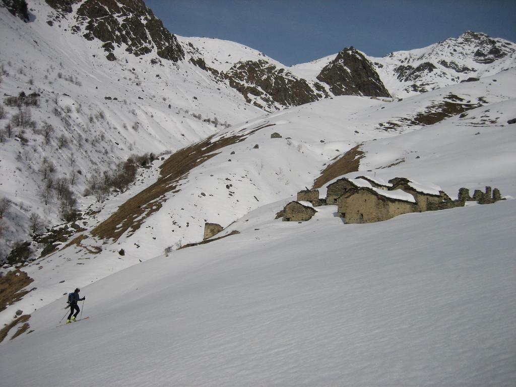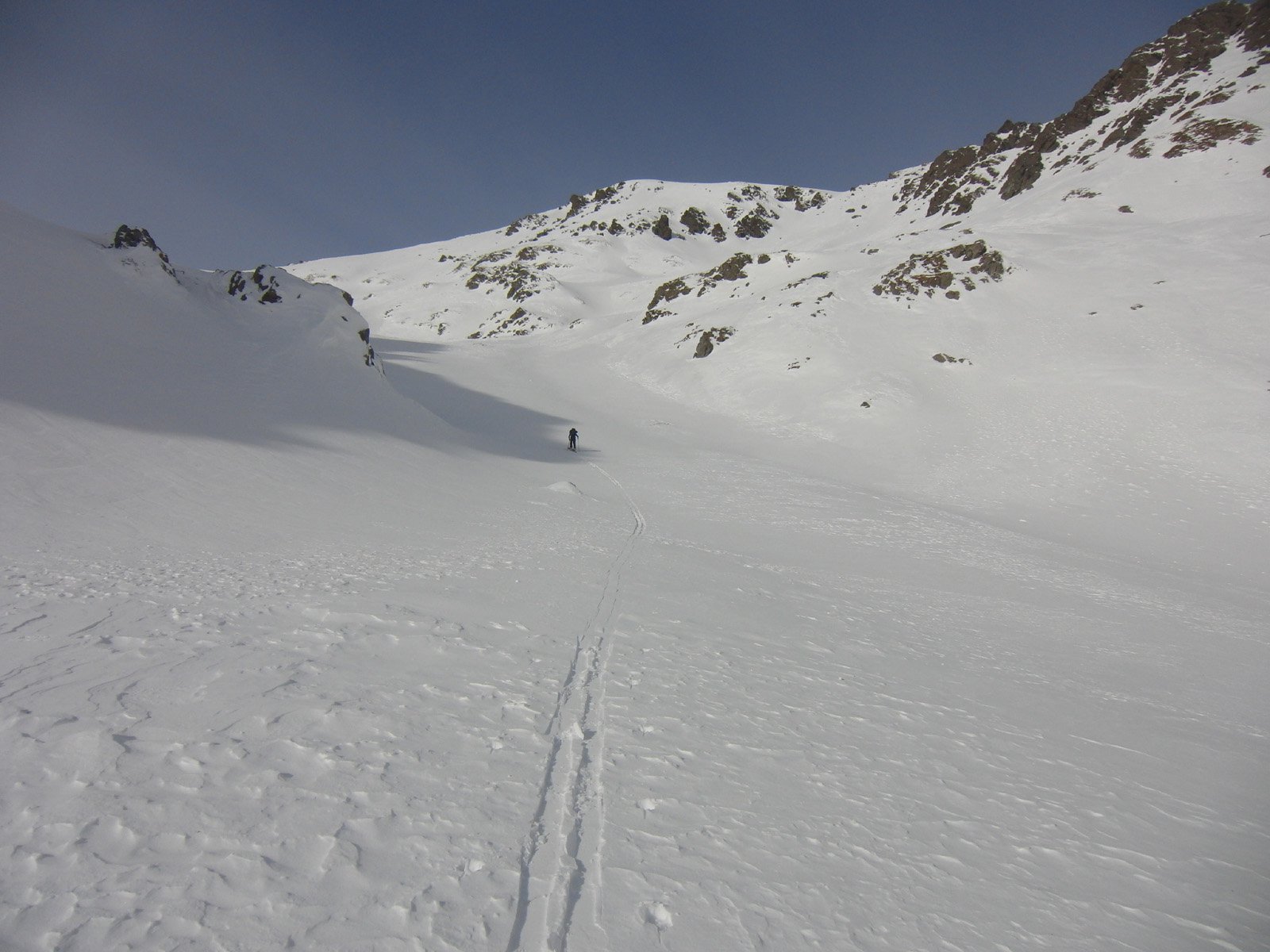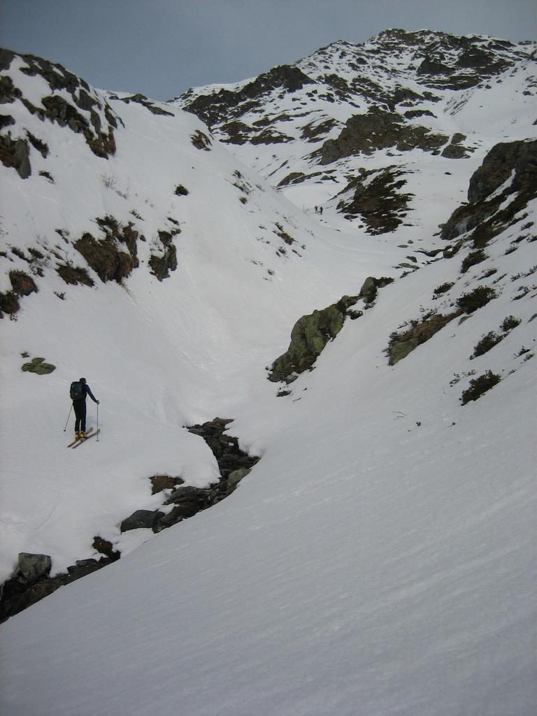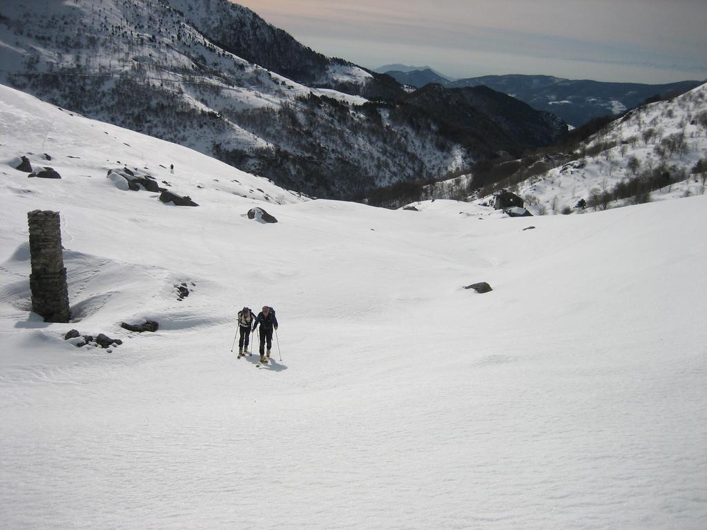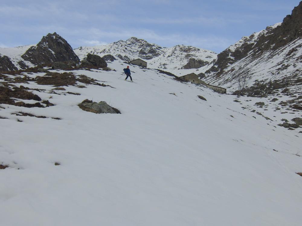 In discesa valutando attentamente le condizioni di stabilità è possibile scegliersi a proprio piacimento l’itinerario più congeniale per le proprie capacità. Al di sotto della Rocca del Prete dopo aver passato la strettoia della gola e fino all’altezza dell’Alpe Ghet è possibile scendere su entrambe le sponde del vallone su aperti pendii; al di sotto é consigliabile scendere sulla sponda destra or. del Vallone del Gravio la quale conserva meglio la neve, passando alcune strettoie tra le rocce ed alcuni corridoi di boschetto un pò fitto fino a giungere nella mulattiera appena al di sopra della fonte Noitolera.