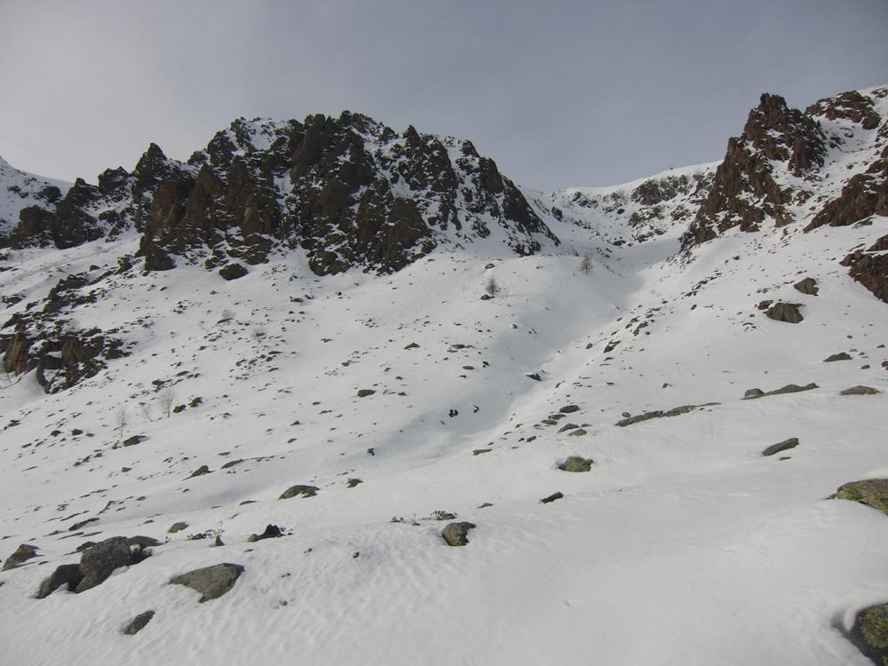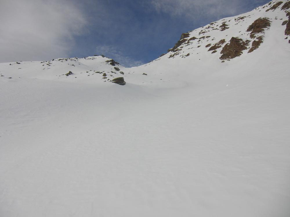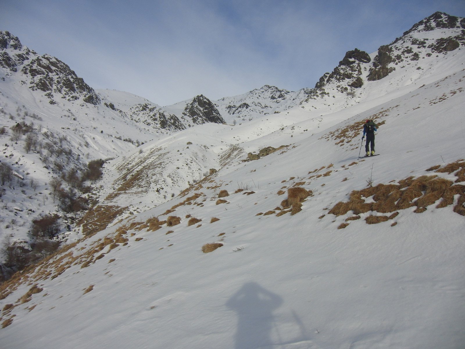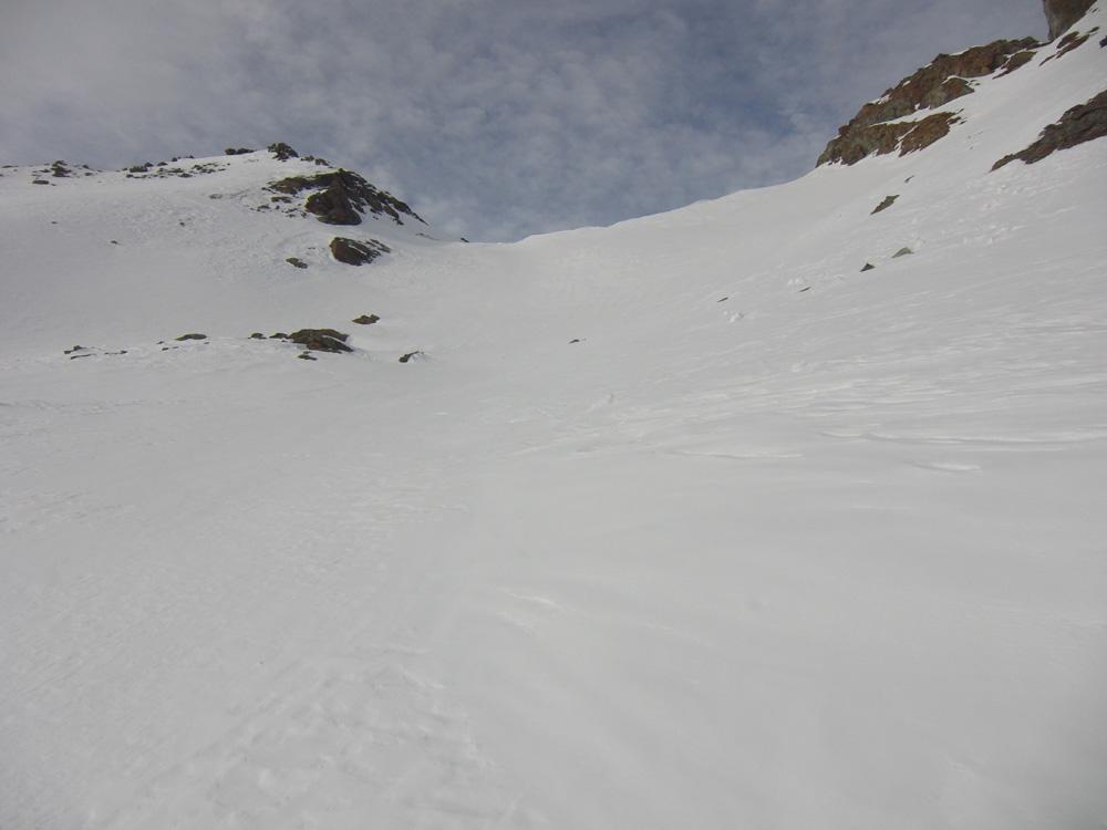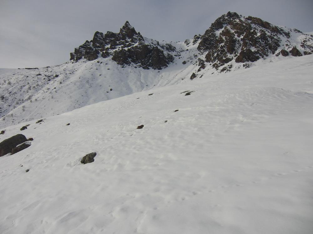Non salire fino all’Alpe Praburet ma una settantina di metri sotto aggirare la costiera a sinistra e proseguire in piano fino ad entrare nel solco principale del vallone e risalirlo (meglio a dx idr.); qualora in corrispondenza della Rocca del Prete una strettoia incassata fosse difficoltosa da superare (a volte depositi di valanghe dalla costiera Lunella-Rocca Maritano) tenersi un pò più alti sulla sponda dx idr. passando su una cengetta (a volte presente un breve passaggio impegnativo su un risalto ripido da riporto del vento); raggiungere un anfiteatro che si apre a ventaglio (da questo punto, se in condizioni, è anche possibile la salita nel canale del Colle della Forcola per proseguire alla spalla est della Lunella mt. 2.638 o alla Rocca Maritano) e proseguire fino a raggiungere un ampio falsopiano a quota 2.200. Continuare verso ovest per dossi ed avvallamenti avvicinandosi alla cresta sud della punta Cruvin nei pressi di un’insellatura; proseguire poi verso destra su tutta la dorsale di cresta arrotondata passando comodamente un breve tratto tra alcuni massi, evitando di fare il traverso ascendente sugli aperti pendii di destra, più impegnativi per la pendenza sostenuta; segue la dorsale più ampia e con pendenza moderata, si passa al di sotto di una prima anticima per poi raggiungere il cono finale della vetta da salire da destra a sinistra dal lato del colletto nord.