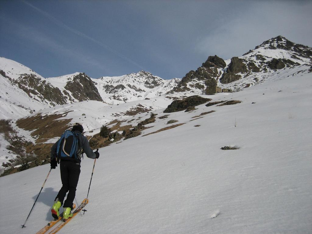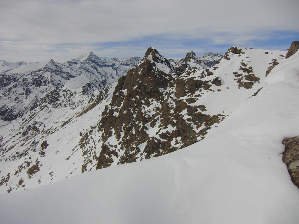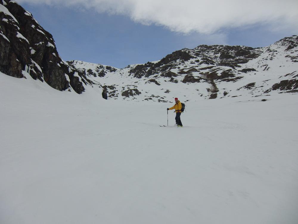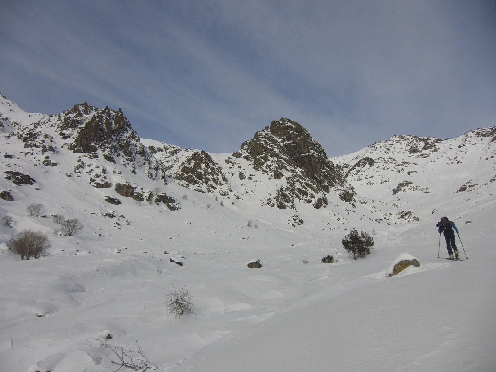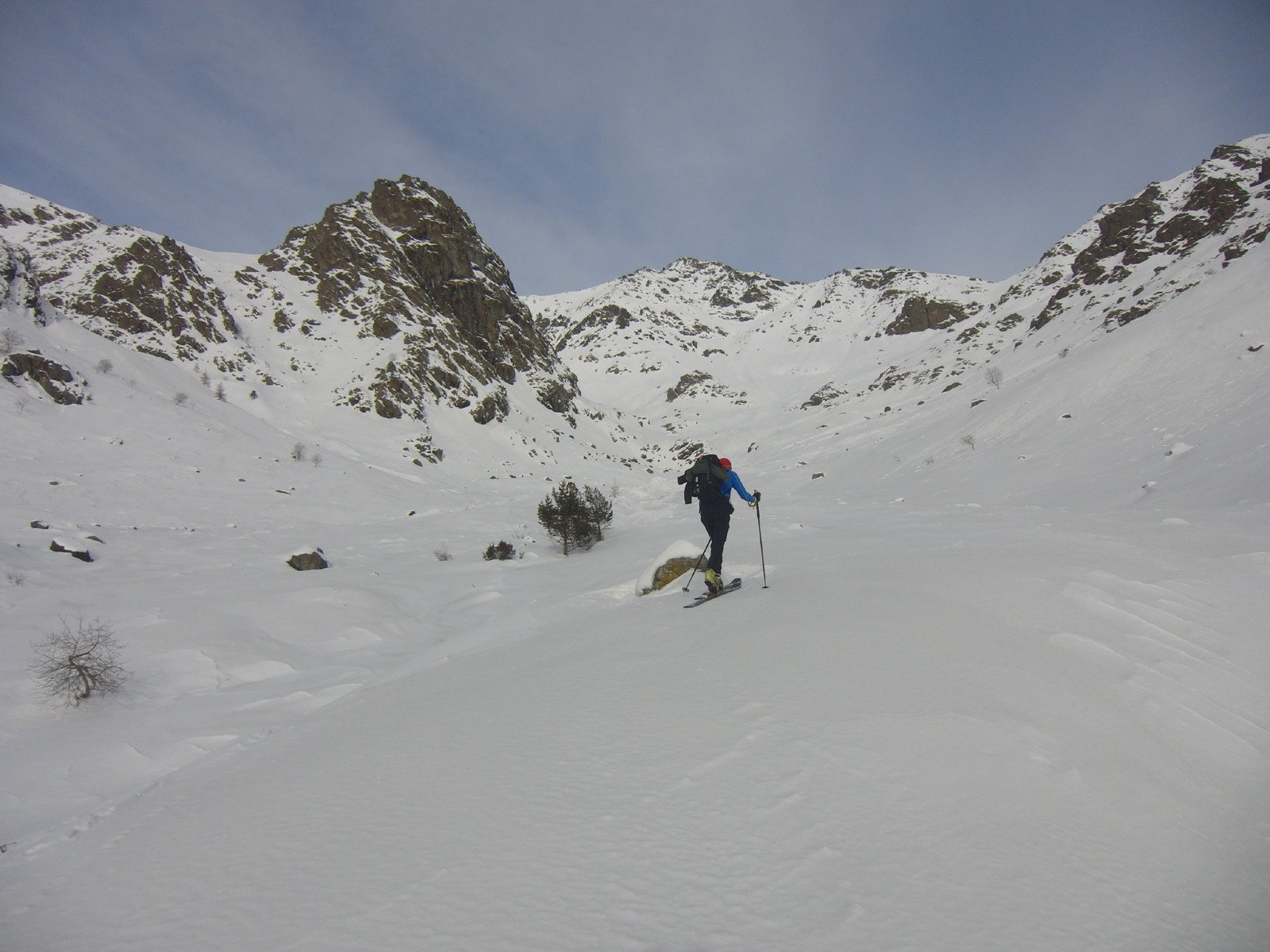 Non salire fino all’Alpe Praburet ma una settantina di metri sotto aggirare la costiera a sinistra e proseguire in piano fino ad entrare nel solco principale del vallone e risalirlo (meglio a dx idr.); qualora in corrispondenza della Rocca del Prete una strettoia incassata fosse difficoltosa da superare (a volte depositi di valanghe dalla costiera Lunella-Rocca Maritano) tenersi un pò più alti sulla sponda dx idr. passando su una cengetta (a volte presente un breve passaggio impegnativo su un risalto ripido da riporto del vento); raggiungere un anfiteatro che si apre a ventaglio (da questo punto, se in condizioni, è anche possibile la salita nel canale del Colle della Forcola per proseguire alla spalla est della Lunella mt. 2.638 o alla Rocca Maritano) e proseguire fino a raggiungere un ampio falsopiano a quota 2.200. Continuare verso ovest per dossi ed avvallamenti avvicinandosi alla cresta sud della punta Cruvin nei pressi di un’insellatura; proseguire poi verso destra su tutta la dorsale di cresta arrotondata passando comodamente un breve tratto tra alcuni massi, evitando di fare il traverso ascendente sugli aperti pendii di destra, più impegnativi per la pendenza sostenuta; segue la dorsale più ampia e con pendenza moderata, si passa al di sotto di una prima anticima per poi raggiungere il cono finale della vetta da salire da destra a sinistra dal lato del colletto nord.