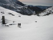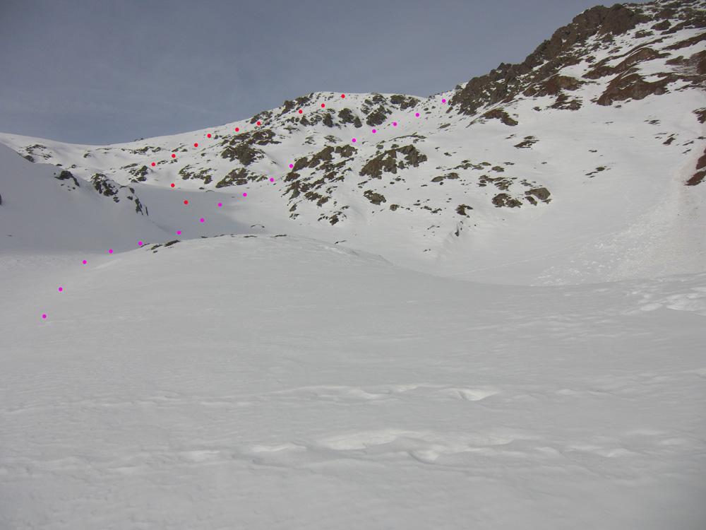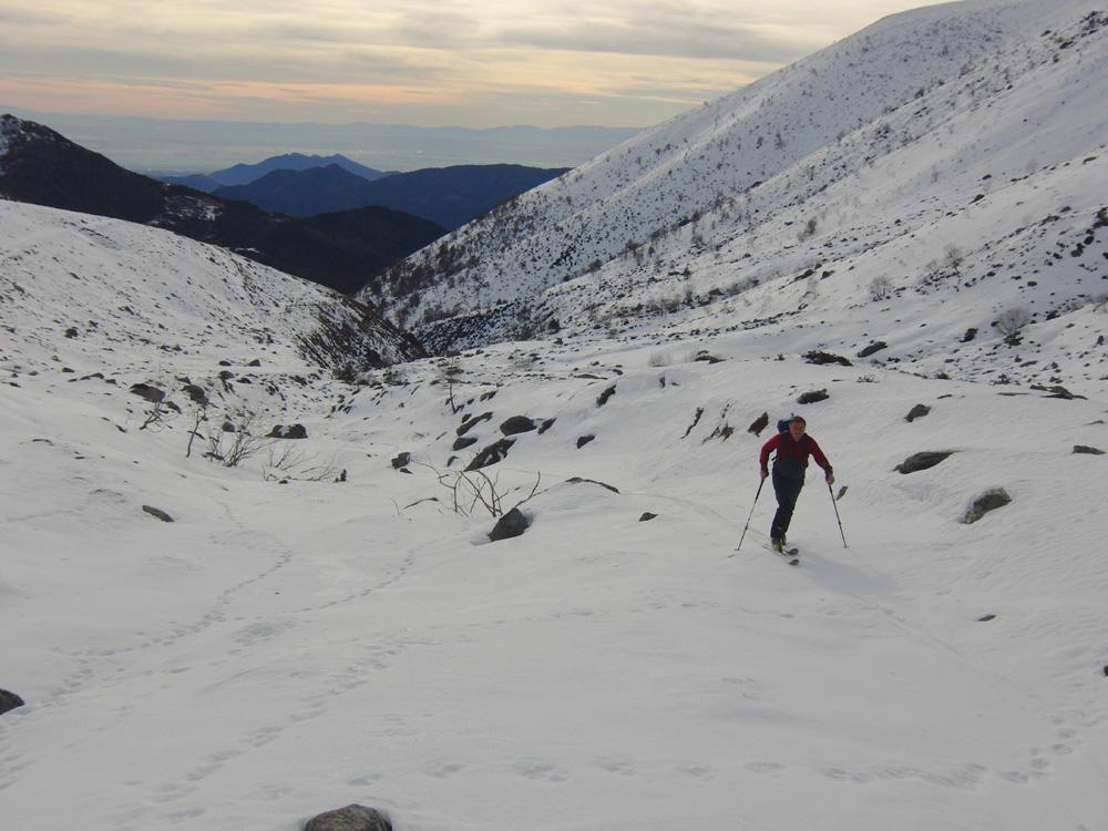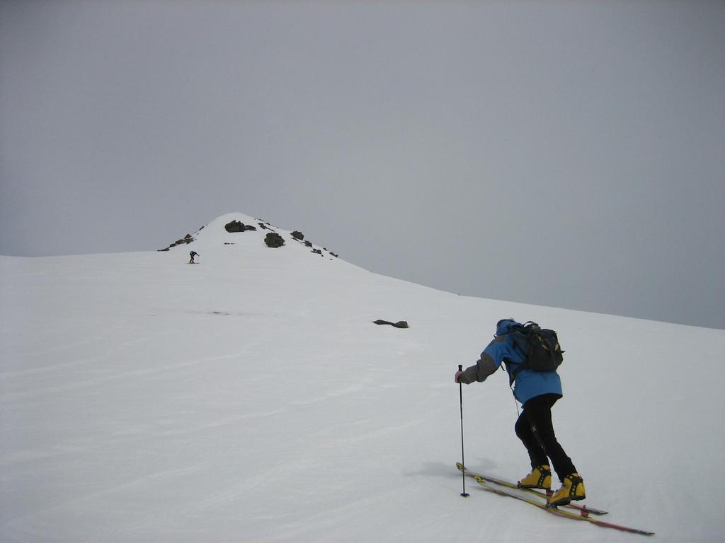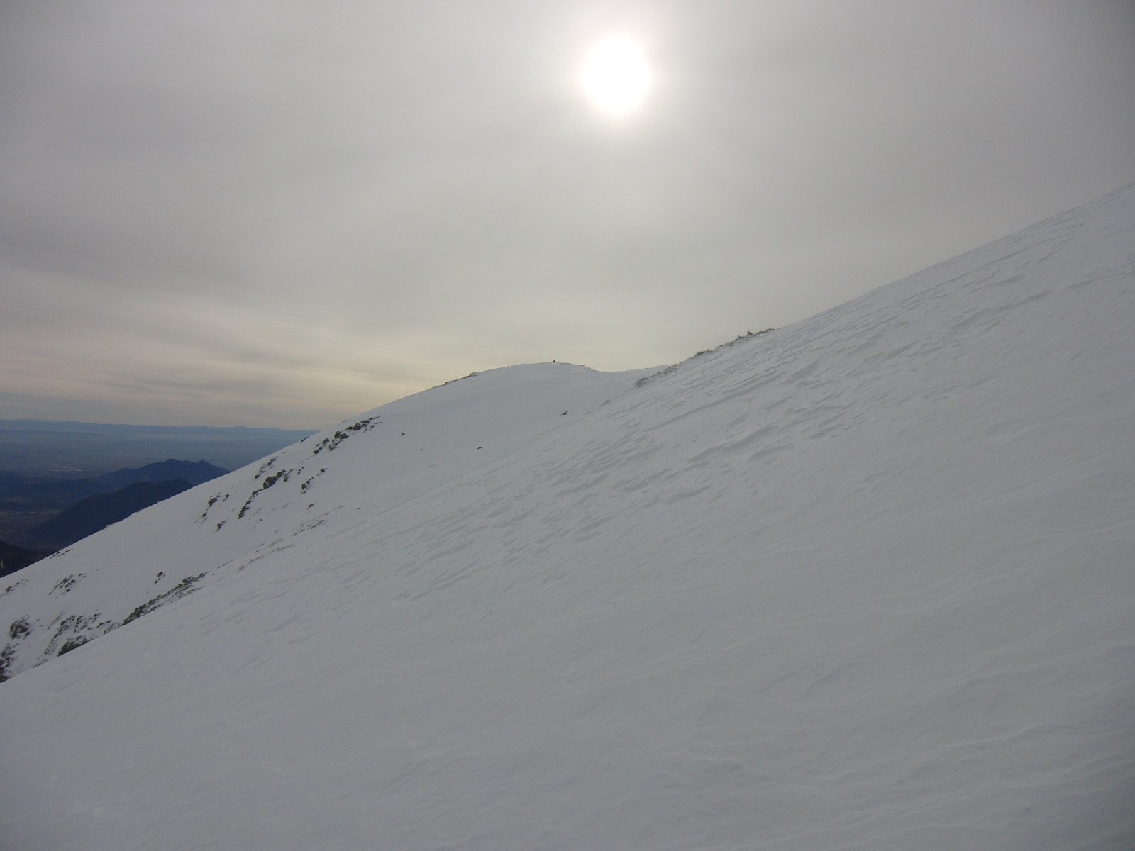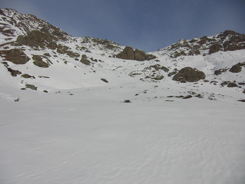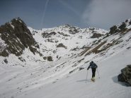 Non salire fino all’Alpe Praburet ma una settantina di metri sotto aggirare la costiera a sinistra e proseguire in piano fino ad entrare nel solco principale del vallone e risalirlo (meglio a dx idr.); qualora in corrispondenza della Rocca del Prete una strettoia incassata fosse difficoltosa da superare (a volte depositi di valanghe dalla costiera Lunella-Rocca Maritano) tenersi un pò più alti sulla sponda dx idr. passando su una cengetta (a volte presente un breve passaggio impegnativo su un risalto ripido da riporto del vento); raggiungere un anfiteatro che si apre a ventaglio (da questo punto, se in condizioni, è anche possibile la salita nel canale del Colle della Forcola per proseguire alla spalla est della Lunella mt. 2.638 o alla Rocca Maritano) e proseguire fino a raggiungere un ampio falsopiano a quota 2.200. Continuare verso ovest per dossi ed avvallamenti avvicinandosi alla cresta sud della punta Cruvin nei pressi di un’insellatura; proseguire poi verso destra su tutta la dorsale di cresta arrotondata passando comodamente un breve tratto tra alcuni massi, evitando di fare il traverso ascendente sugli aperti pendii di destra, più impegnativi per la pendenza sostenuta; segue la dorsale più ampia e con pendenza moderata, si passa al di sotto di una prima anticima per poi raggiungere il cono finale della vetta da salire da destra a sinistra dal lato del colletto nord.