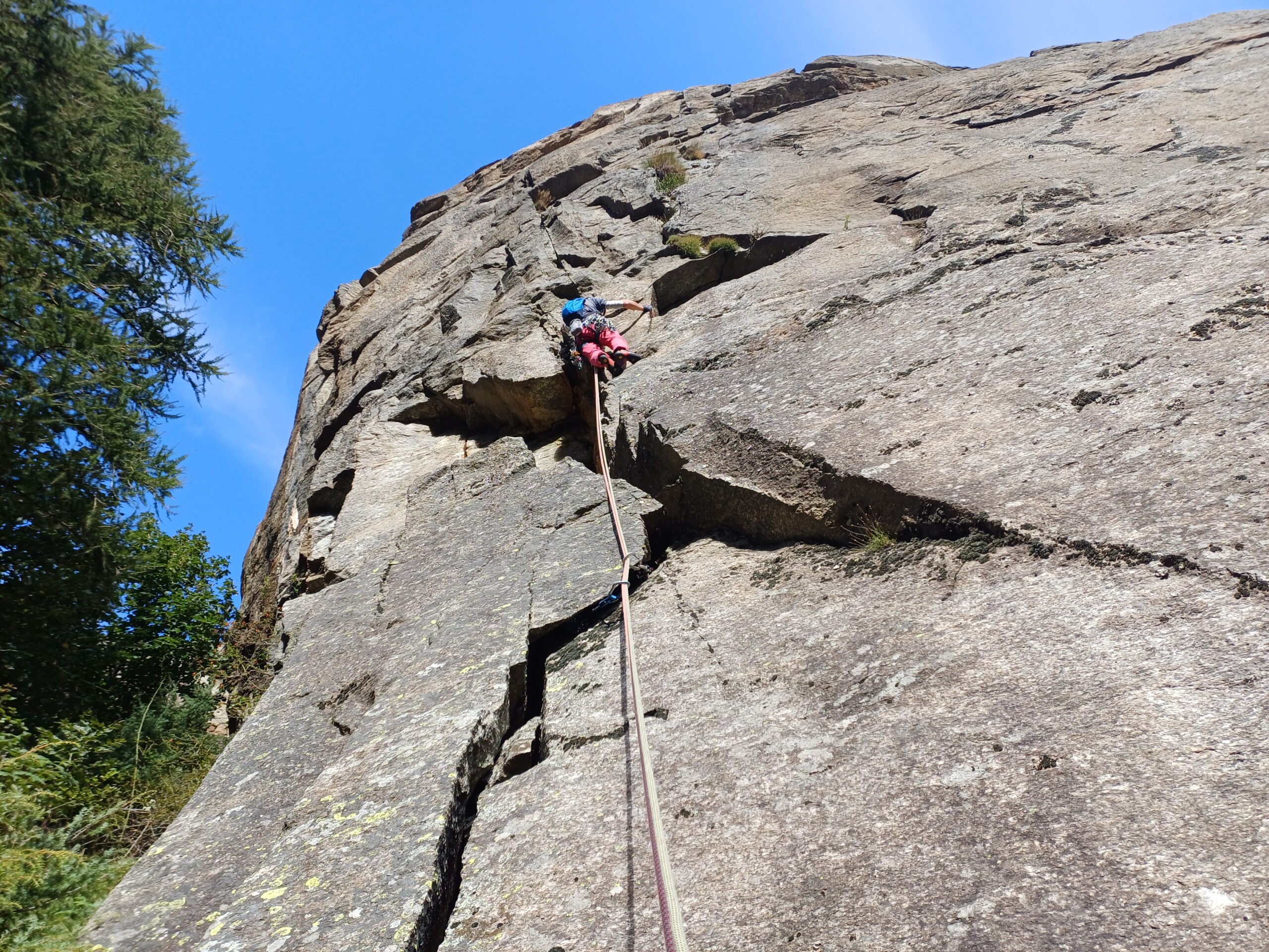 - L2 – piegare a destra per diedro, tettino e ancora diedro, sosta sulla sinistra su terrazzino, della stessa tipologia della precedente. 5c -20 m R1. Tiro facile e piacevole, proteggere bene all’inizio.