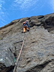 Da qui la via prosegue per due lunghezze più facilmente verso destra per lame e cenge, prima puntando all’evidente diedro fessurato ora parte della via “Dica 33”, sosta, e poi ancora a destra ad uscire dalla parete.