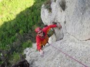 all’uscita della via,facendo attenzione a non perdersi,si percorrono un centinaio di metri nel bosco in direzione della Torre.All’altezza di un diedro-canale si scende un paio di metri su una cengia esposta raggiungendo due fix resinati per la doppia.La doppia può anche essere sdoppiabile circa a metà calata (altri 2 fix).