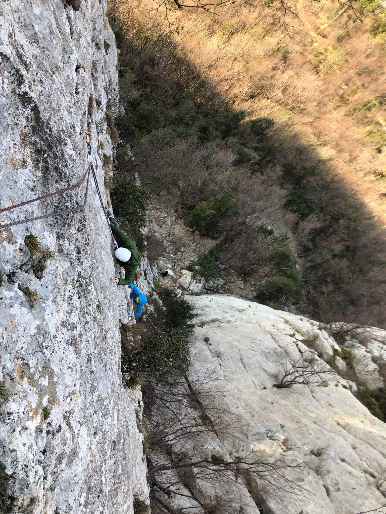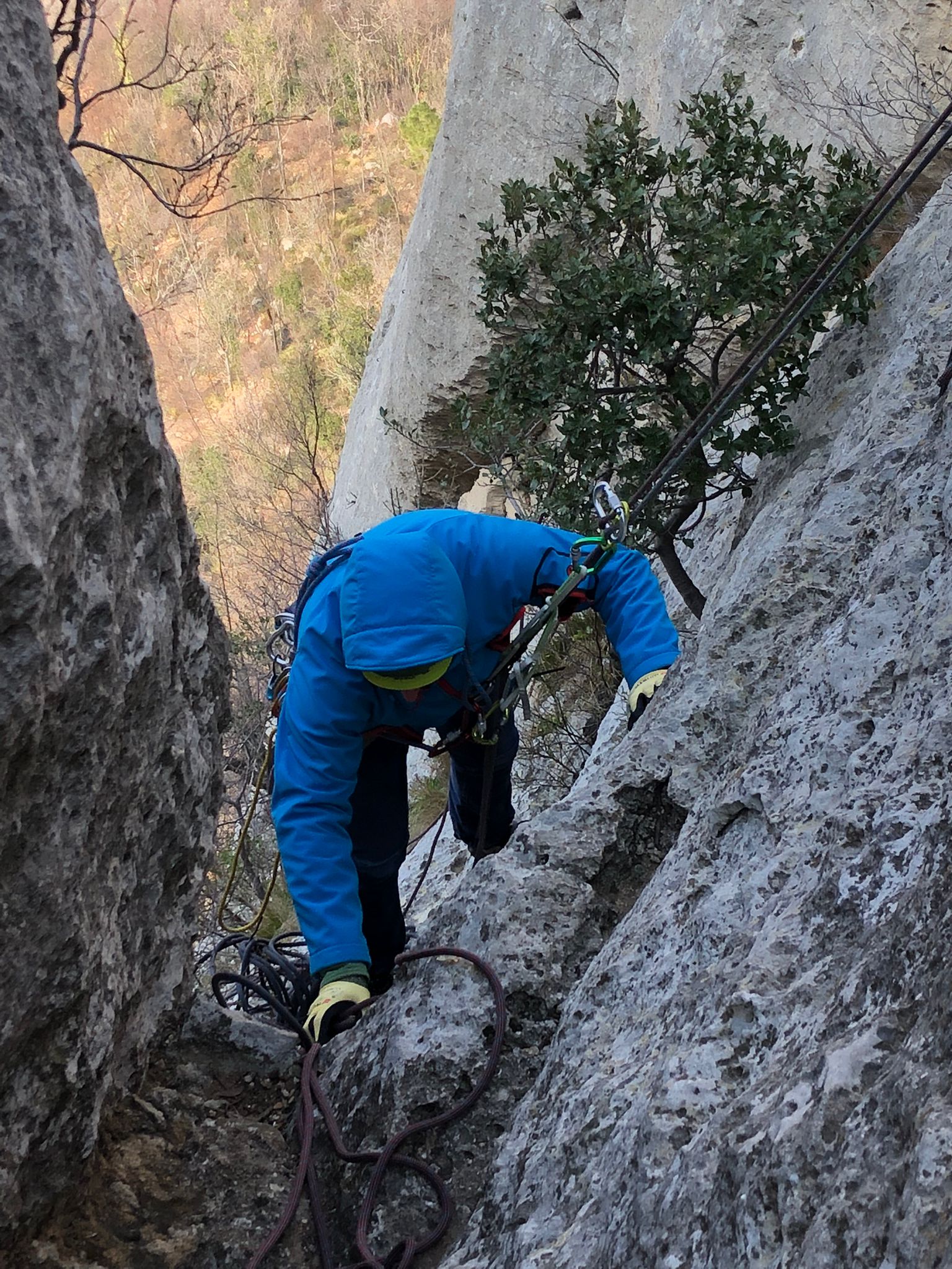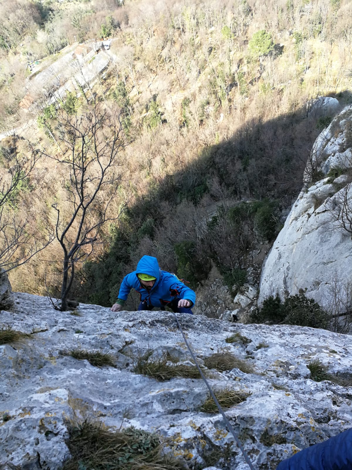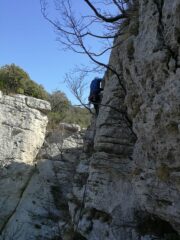 - L3 : spostarsi a sinistra di qualche metro dalla sosta e salire per gradoni, III, non attrezzato, presenti clessidre e un discreto albero. Roccia un pelo più fragile. Sosta su spit da collegare.