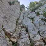 seguire tracce prima a dx e poi a sx per andare alla sosta finale del diedro canale ( passo leggermente esposto per arrivare ai resinati) da lì con una doppia di circa 50 metri o eventualmente 2 doppie. Possibilità di discesa a piedi andando a verso destra all’uscita della via per tracce che portano al settore canyon ( alcune corde fisse in loco).